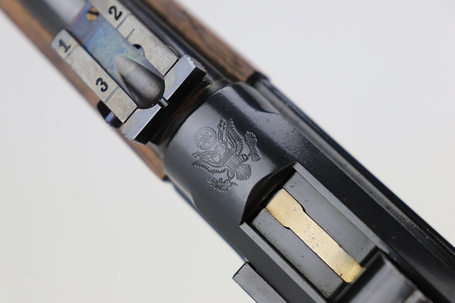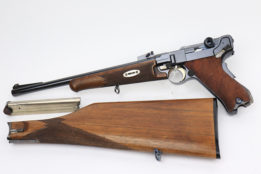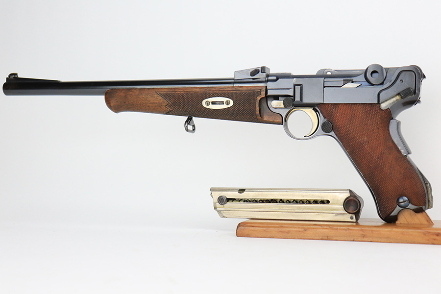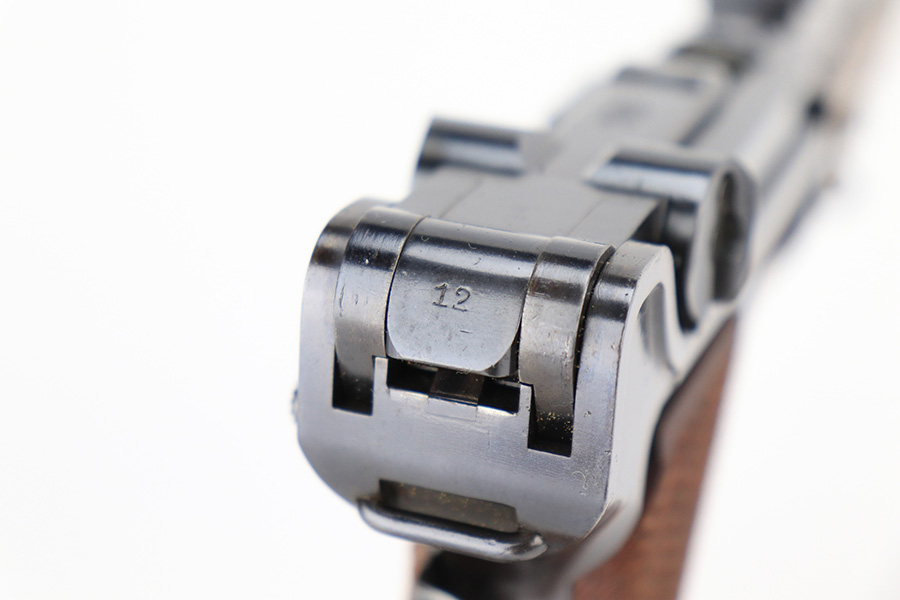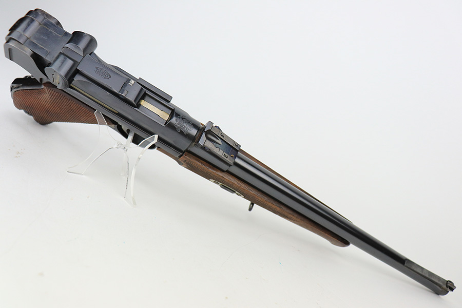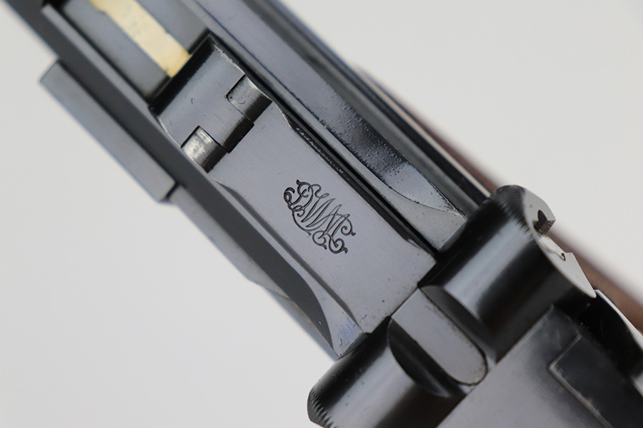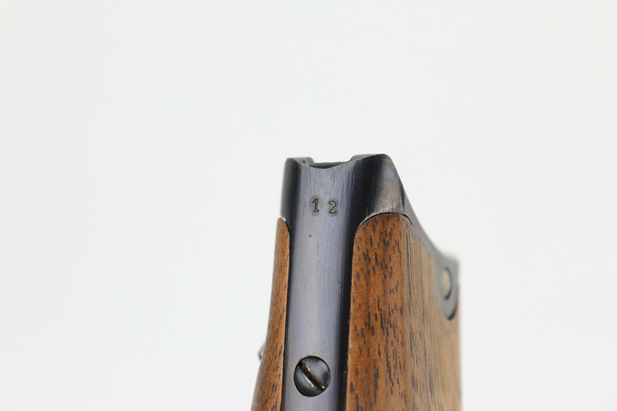 6/14/23 – This is a beautiful example of a mid-production DWM Model 1902 Luger carbine that is complete with it’s original matching walnut shoulder stock. Approximately 2,500 were manufactured. All these early carbines exhibit the very desirable early features such the long frame, flat mainspring, grip safety, dished toggles, toggle lock on the right side, recessed/flat breech bolt, and flat straw colored extractor. One of the most unique features is the 11 3/4 inch carbine barrel with a detachable checkered forearm. The underside of the barrel is fitted with a small lug that engages a small spring actuator located inside the forearm that helps to cycle the heavier carbine barrel during firing. No other Luger has this feature. The top of the chamber has the American Eagle crest, and the front toggle has the standard DWM logo. Fitted with the correct 3-position rear sight (adjustable from 100-300 meters) and a small ramp front sight base fitted with a bead front sight. The full serial number is correctly marked on the frame extension and barrel underside. The last digits of the serial number are discretely marked on the various parts in the correct commercial manner. Fitted with a set of checkered walnut grips with matching serial. It is complete with an original matching numbered walnut shoulder stock that has a fine checkered pattern in the grip area and horn buttplate. Comes with one original commercial magazine with a correct unnumbered wood base. Matching number on the forend. The pistol appears to be in near-mint condition but we believe it’s a high quality restoration from many years ago as there is pitting under the blue on the front strap. The bore has very strong rifling but wasn’t well cared for as there is pitting throughout.