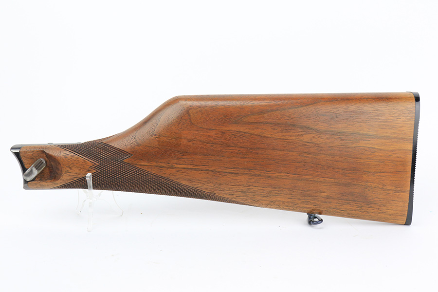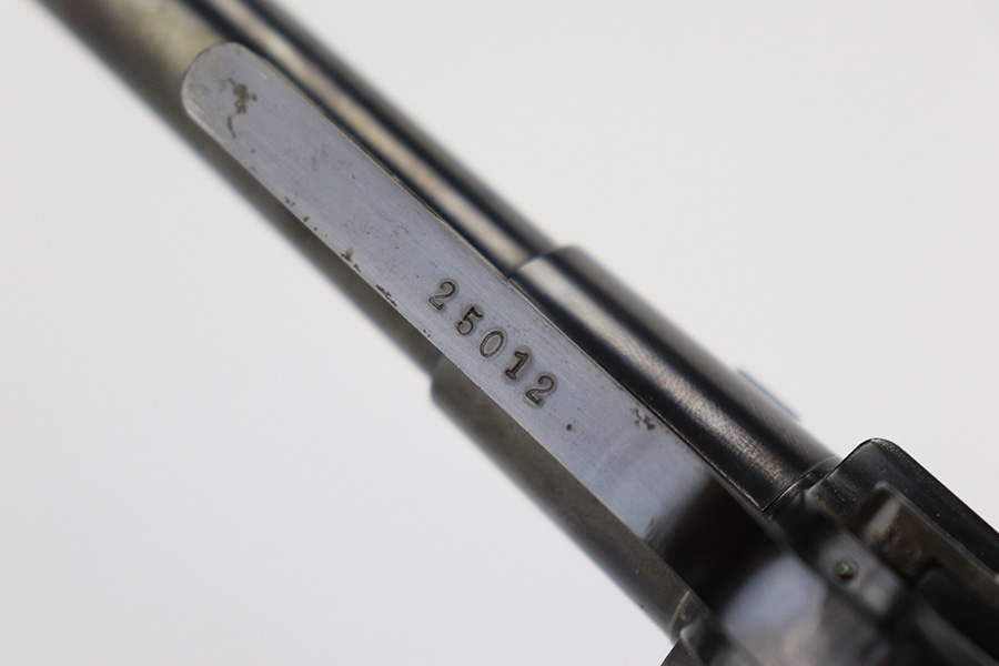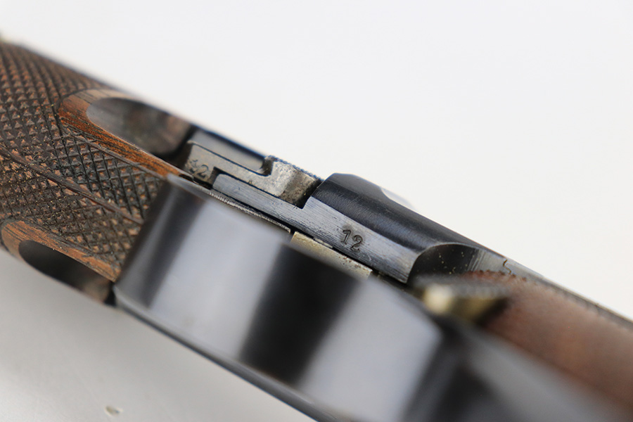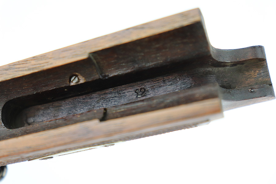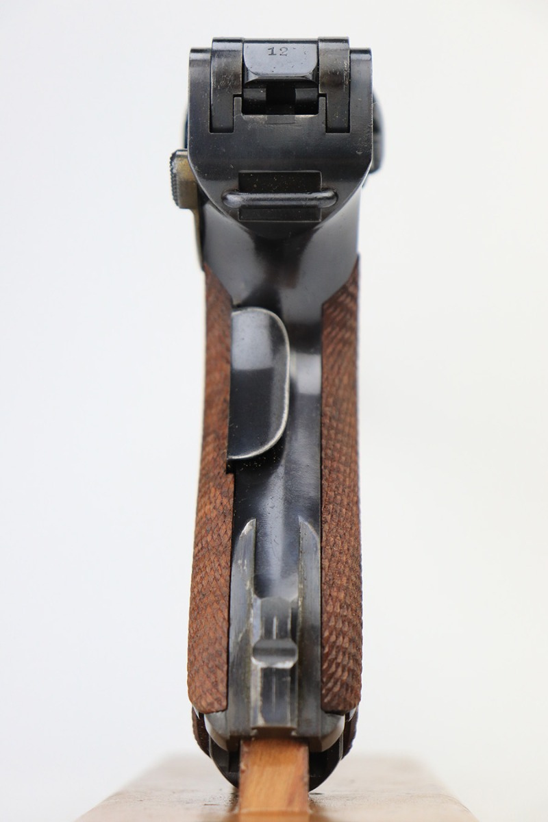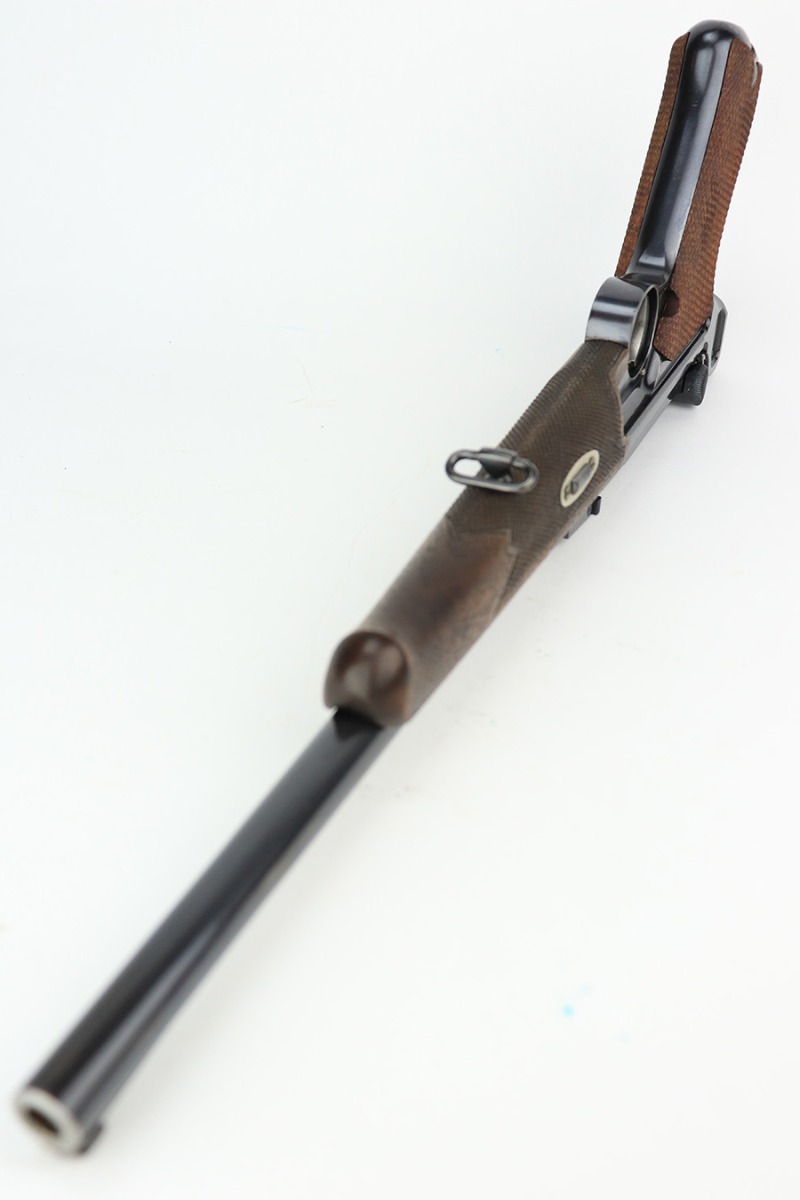 6/14/23 – This is a beautiful example of a mid-production DWM Model 1902 Luger carbine that is complete with it’s original matching walnut shoulder stock. Approximately 2,500 were manufactured. All these early carbines exhibit the very desirable early features such the long frame, flat mainspring, grip safety, dished toggles, toggle lock on the right side, recessed/flat breech bolt, and flat straw colored extractor. One of the most unique features is the 11 3/4 inch carbine barrel with a detachable checkered forearm. The underside of the barrel is fitted with a small lug that engages a small spring actuator located inside the forearm that helps to cycle the heavier carbine barrel during firing. No other Luger has this feature. The top of the chamber has the American Eagle crest, and the front toggle has the standard DWM logo. Fitted with the correct 3-position rear sight (adjustable from 100-300 meters) and a small ramp front sight base fitted with a bead front sight. The full serial number is correctly marked on the frame extension and barrel underside. The last digits of the serial number are discretely marked on the various parts in the correct commercial manner. Fitted with a set of checkered walnut grips with matching serial. It is complete with an original matching numbered walnut shoulder stock that has a fine checkered pattern in the grip area and horn buttplate. Comes with one original commercial magazine with a correct unnumbered wood base. Matching number on the forend. The pistol appears to be in near-mint condition but we believe it’s a high quality restoration from many years ago as there is pitting under the blue on the front strap. The bore has very strong rifling but wasn’t well cared for as there is pitting throughout.