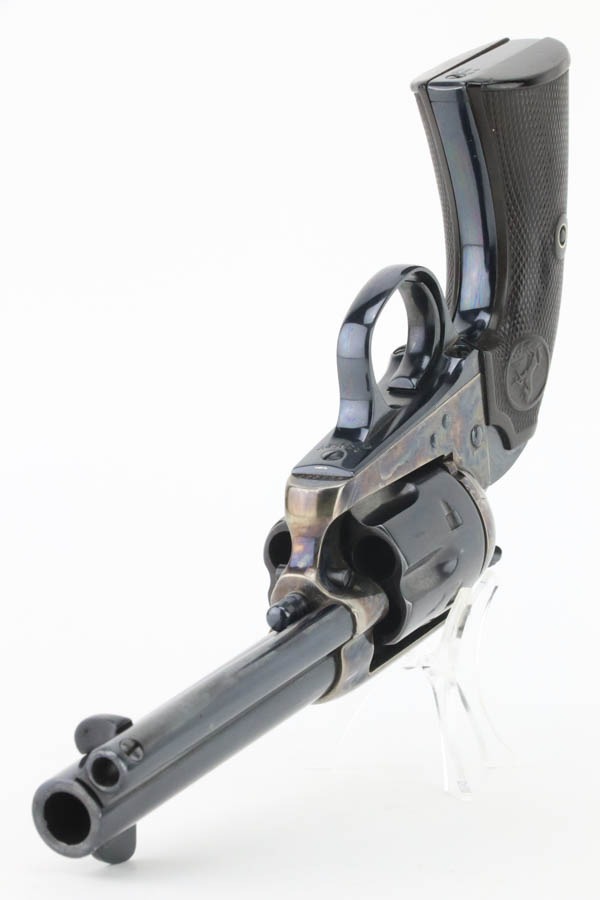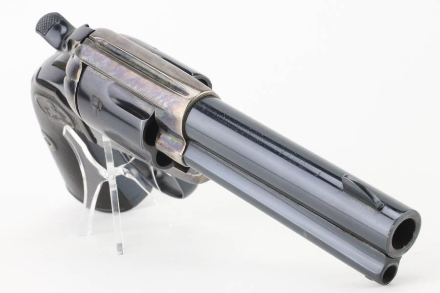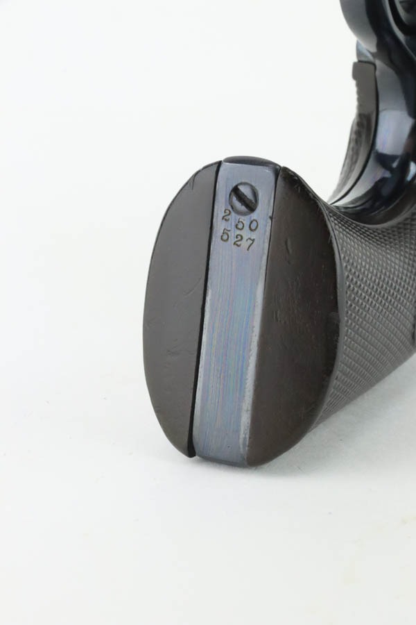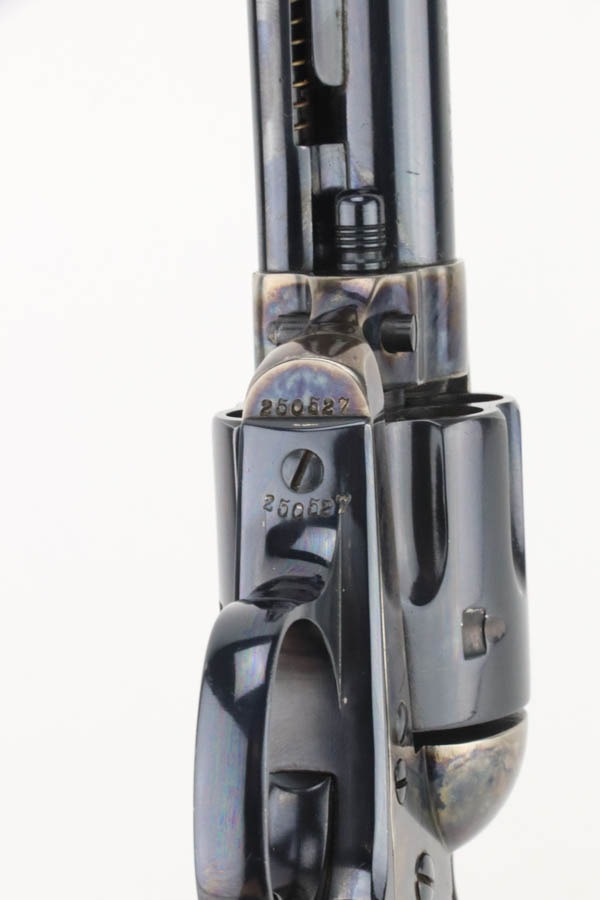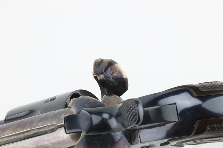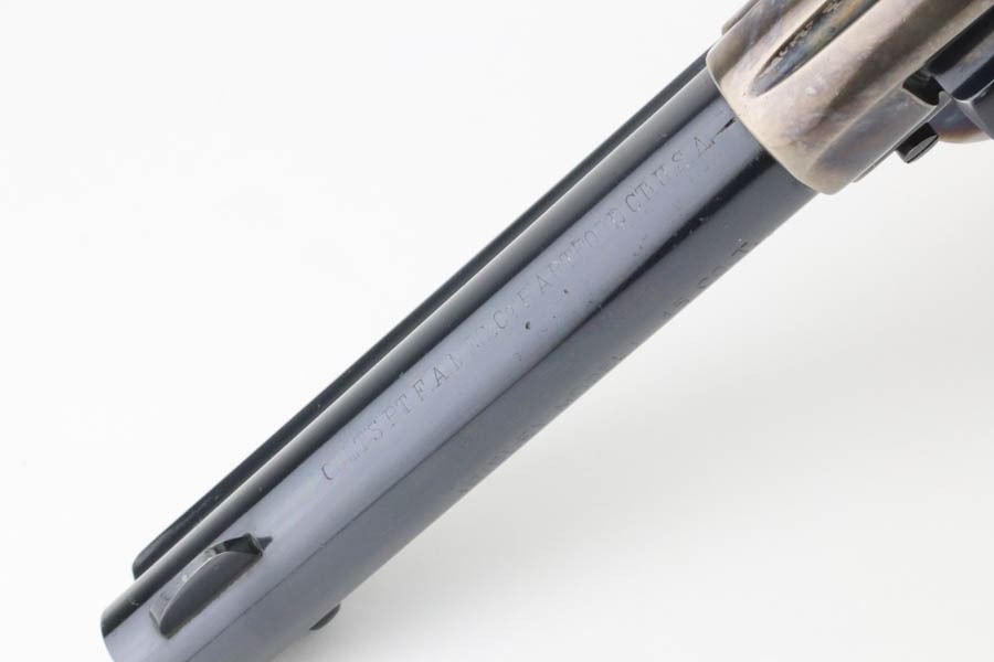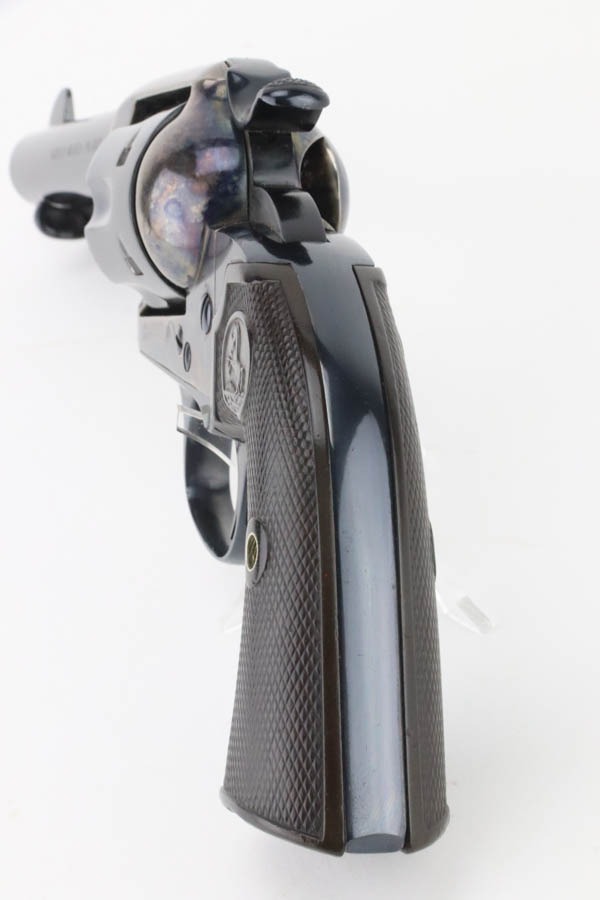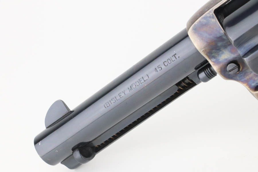 11/14/24 – This is a beautiful Colt Bisley Revolver from 1904. Chambered in .45 Colt with a 4.75″ barrel. All matching. The gun has been completely professionally restored, so the condition is beautiful. Blued barrel, cylinder, and straps. Gorgeous case-hardening on the frame. Just a few tiny marks on the barrel. Fitted with period-correct hard rubber grips – some wear on the bottom edge of the left panel. The bore has pretty good rifling with light pin-pricking throughout. Fully functional.