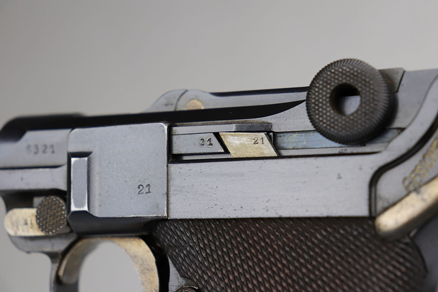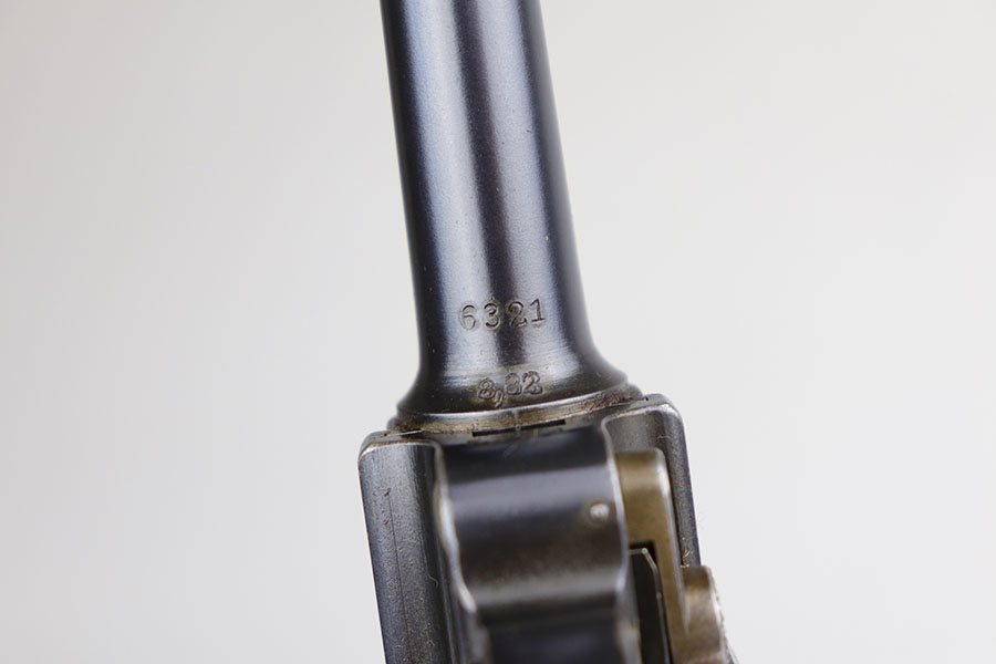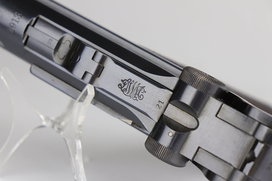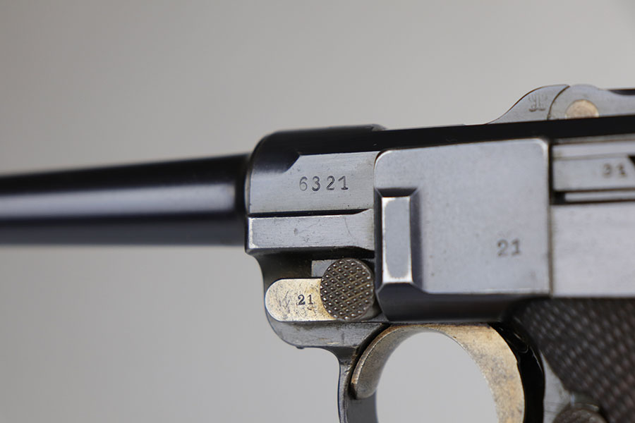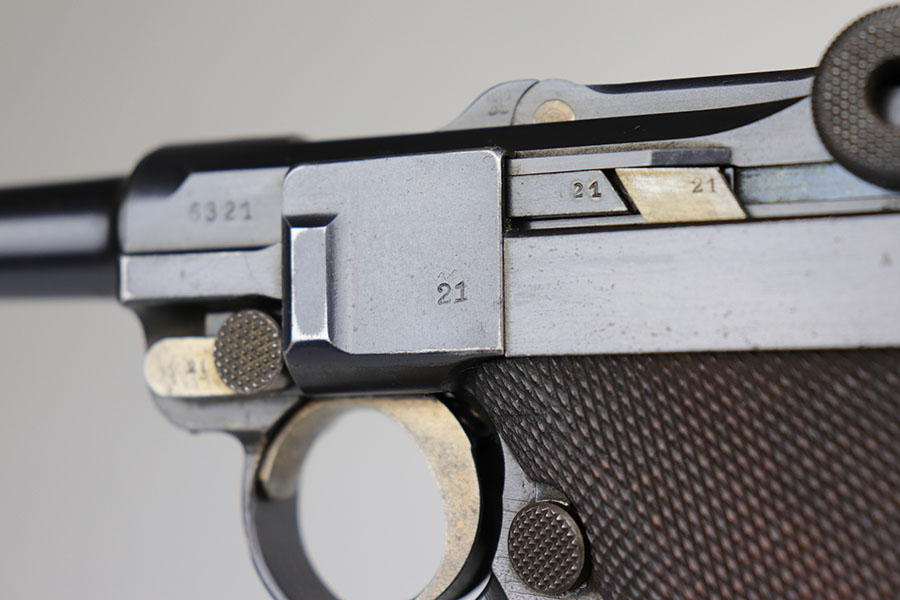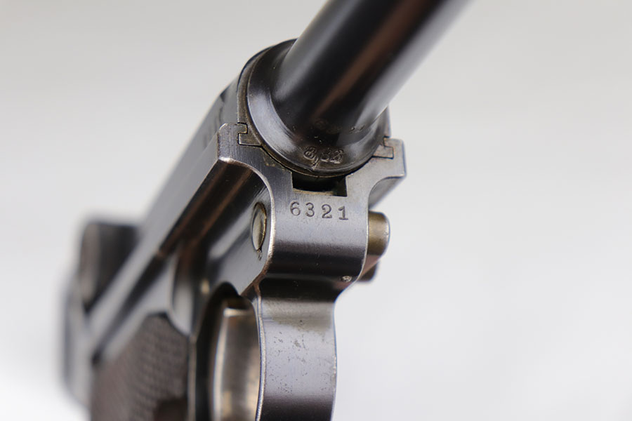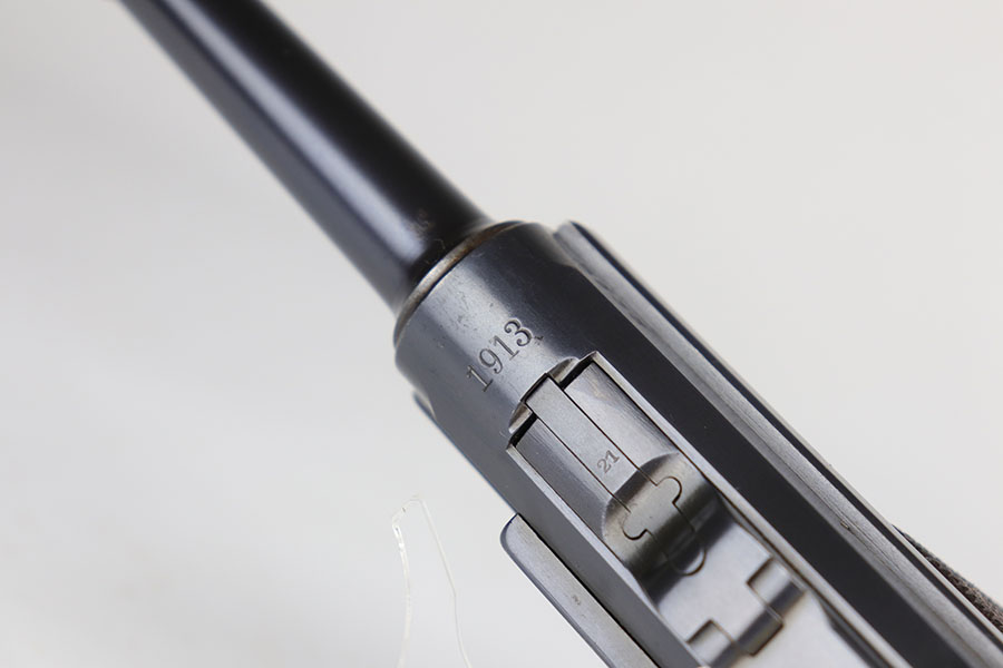 7/15/20 – This is a near-mint DWM Luger from 1913 with holster, tool and spare magazine. This example predates the addition of a stock lug, and has 98% of the original blue remaining. Just a bit of high point wear but hardly any finish loss overall, though there is some oxidation on the straps. All matching numbers throughout, including the original grips. Magazine in the gun is a commercial example with Germany marking on the bottom, and there is a fair amount of surface rust on the tube. The spare magazine is a wartime example from WW2. Original imperial marked tool. Excellent commercial holster that is unmarked. Pistol bore shows some smoothing of the rifling and some freckling throughout.