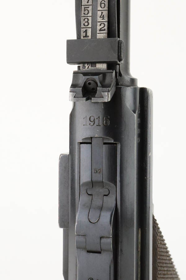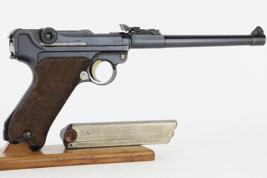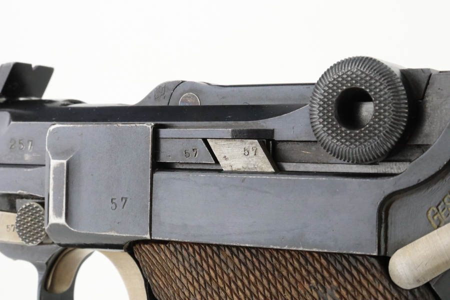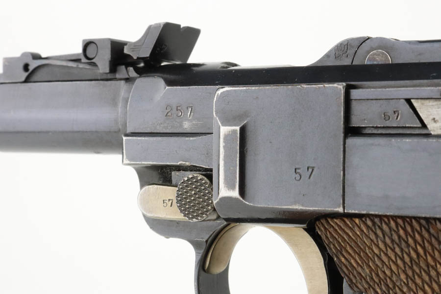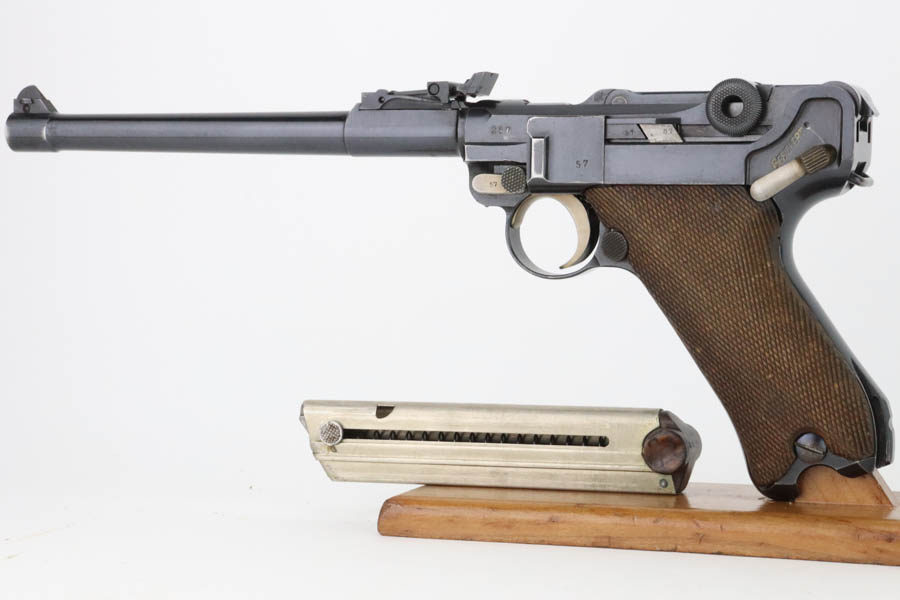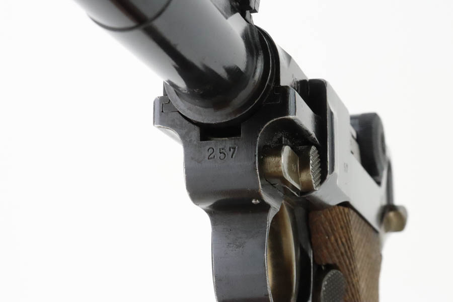 6/13/24 – This is a beautiful and original DWM Artillery Luger from 1916, when only 20,000 such pistols were produced. The gun is all matching and original with about 97% of the blue remaining. Just minor high edge wear but no major blemishes to mention. The trigger has been re-strawed. All numbers matching on metal parts, but the magazine is a mismatched serial. The grips are numbered and matching to each other with Imperial proofs inside, so from the correct era but not original to this gun. Minty bore.