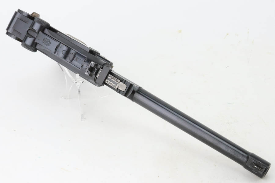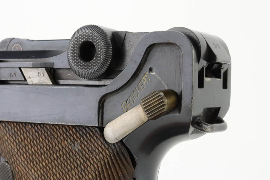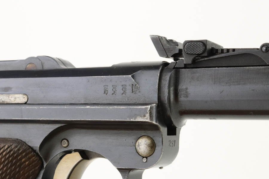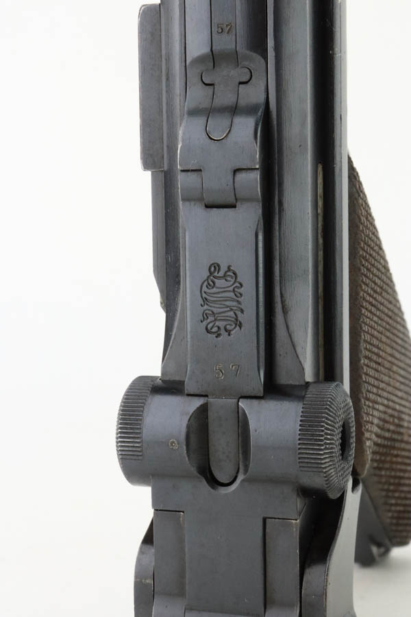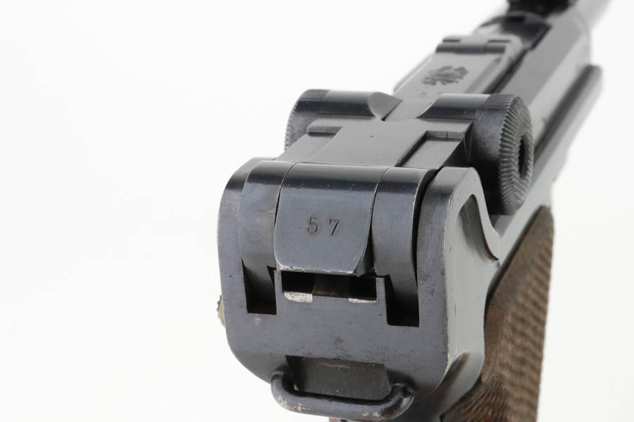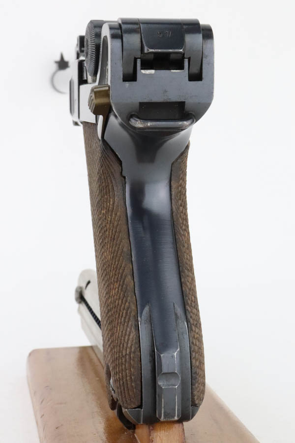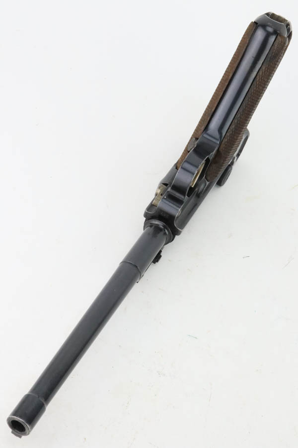 6/13/24 – This is a beautiful and original DWM Artillery Luger from 1916, when only 20,000 such pistols were produced. The gun is all matching and original with about 97% of the blue remaining. Just minor high edge wear but no major blemishes to mention. The trigger has been re-strawed. All numbers matching on metal parts, but the magazine is a mismatched serial. The grips are numbered and matching to each other with Imperial proofs inside, so from the correct era but not original to this gun. Minty bore.