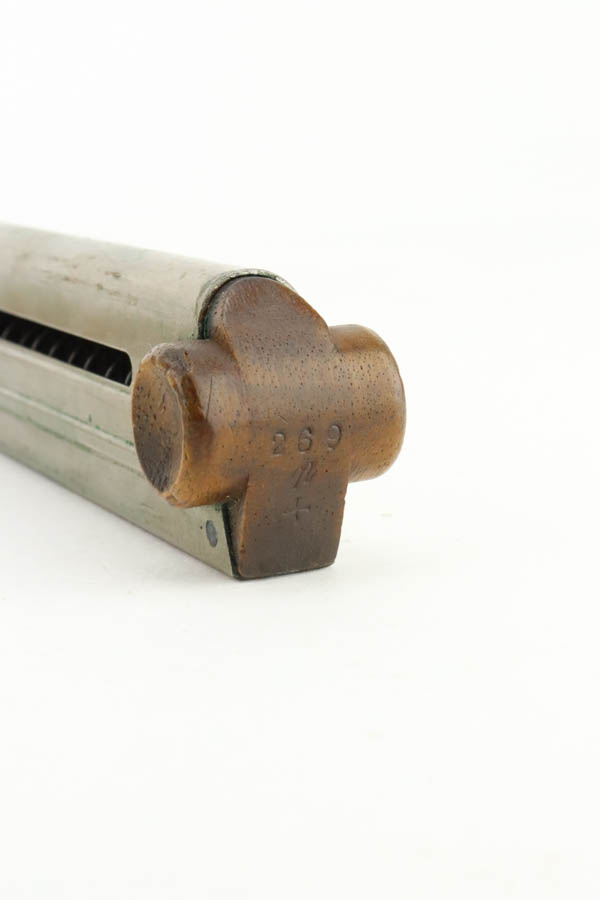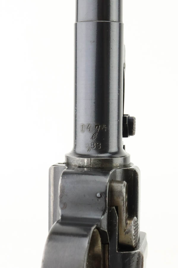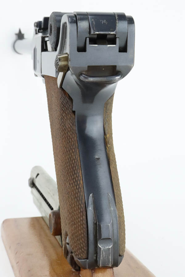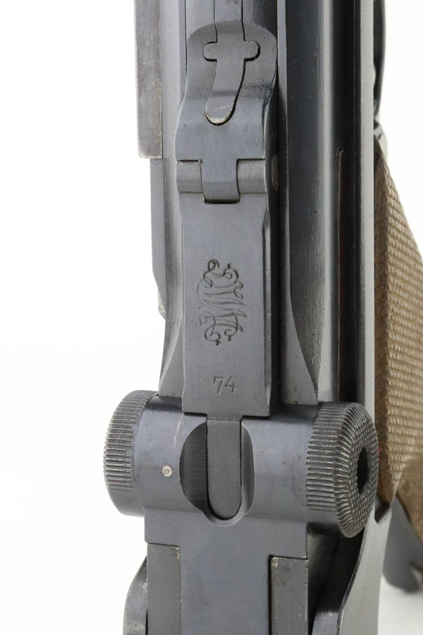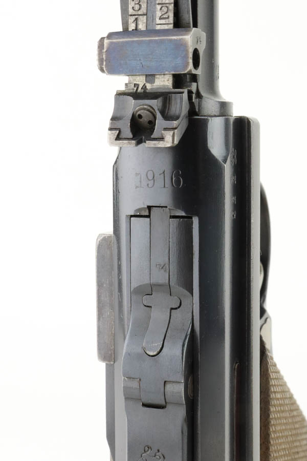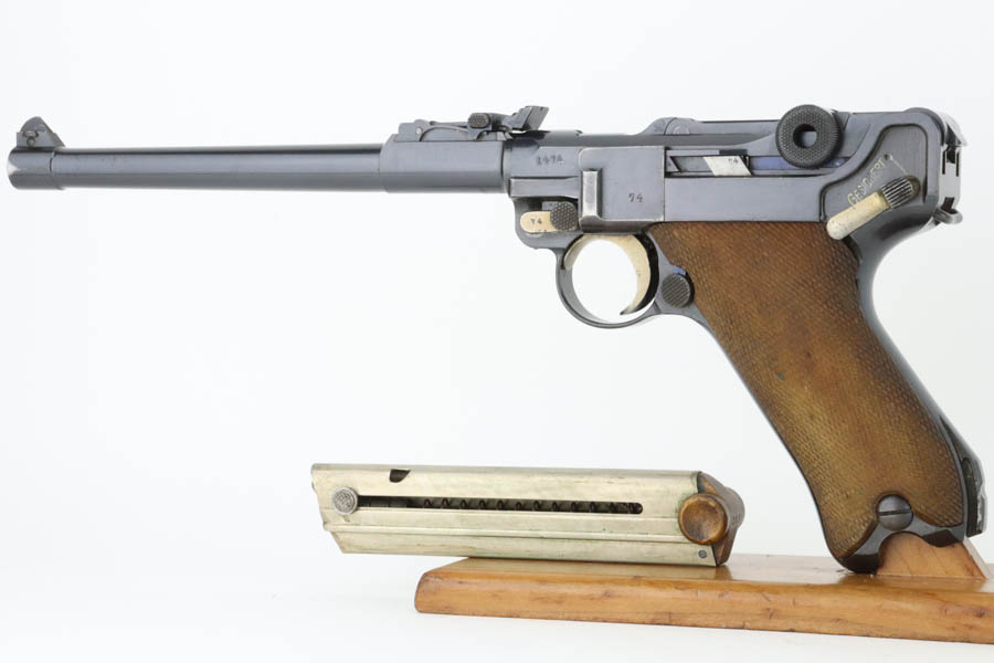 6/21/24 – This is a beautiful example of a DWM Artillery Luger issued to the Imperial German military in 1916. All matching with the proper Imperial proofs. The gun has retained nearly all of its original finish with just very minor wear around the muzzle and on the side plate. Excellent straw-coloring and fire-bluing on the small parts. Fitted with un-numbered wood grips (tiny chip on the left side) and comes with a mismatched but period-correct magazine. Excellent bore with strong rifling.