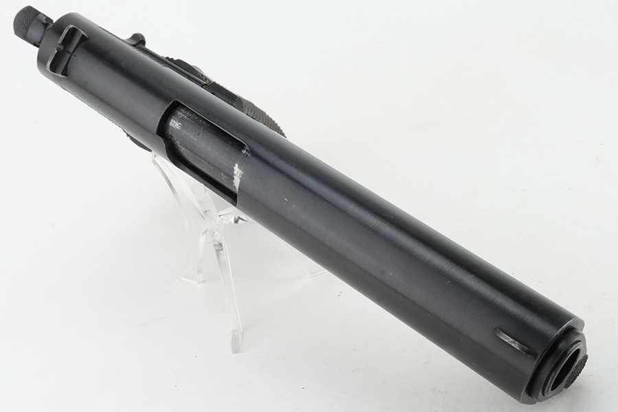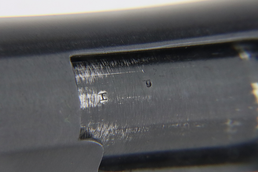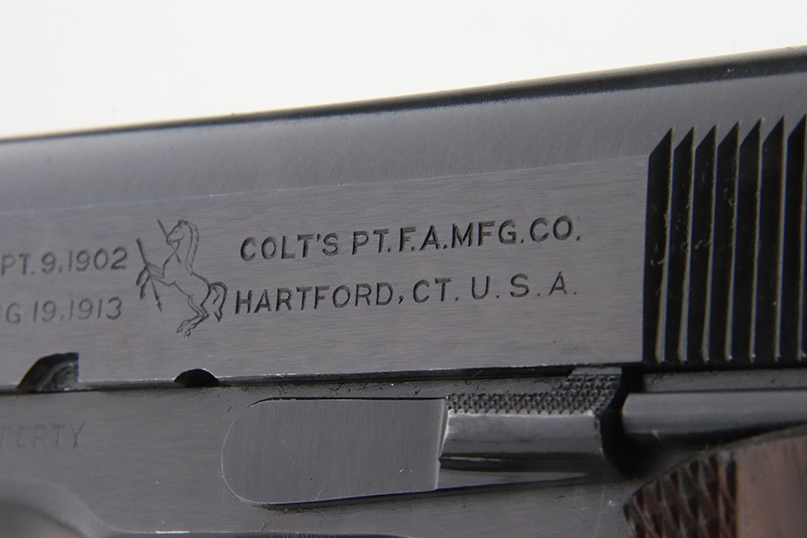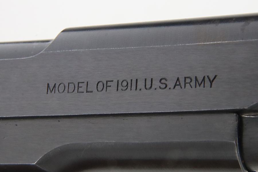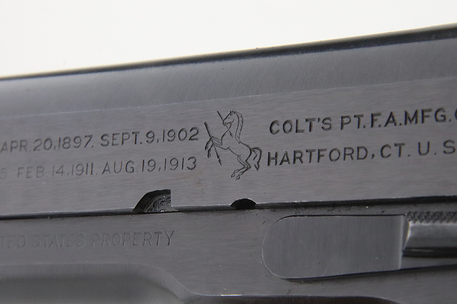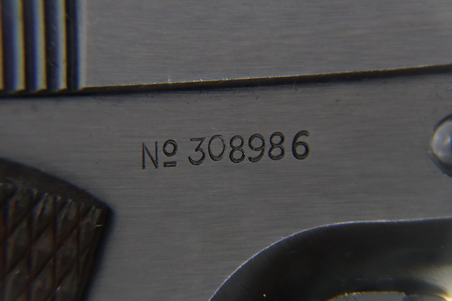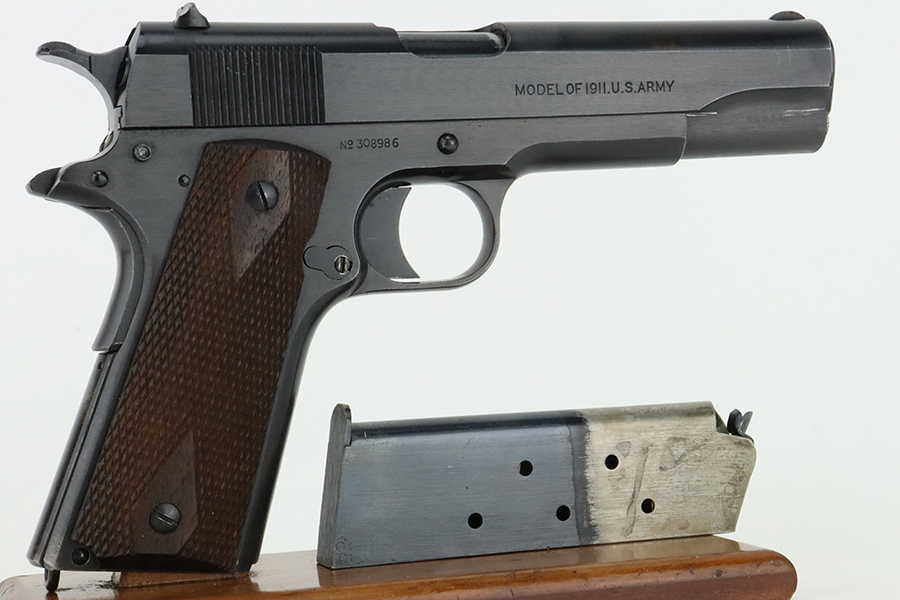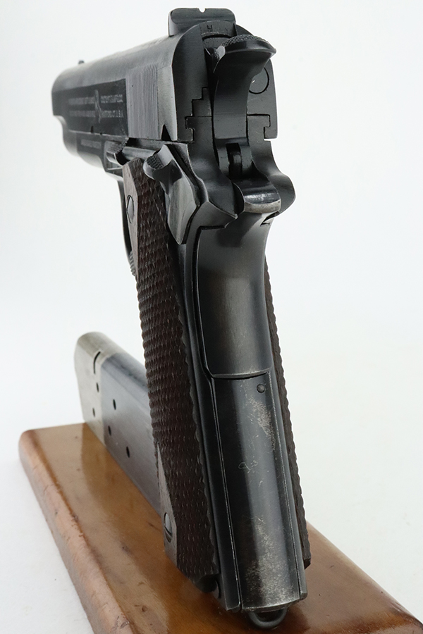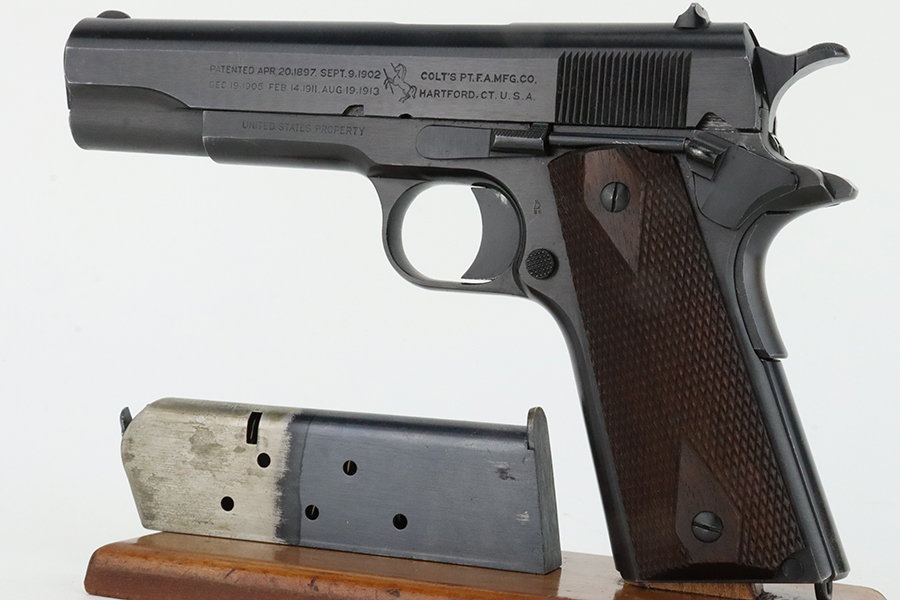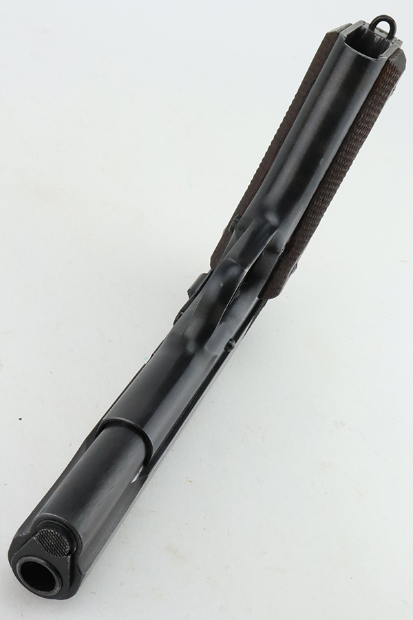 1/29/24 – This is a beautiful Colt Model 1911 issued to the US military in 1918. It is all-correct and has the proper “H P” Colt barrel. Its original finish is stunning and rates about 96-97%. Almost all of the wear comes in the form of minor spotty discoloration on the back strap. So the profile views are gorgeous. Fitted with mint wood grips and comes with a period-correct two-tone magazine. Mint bore.