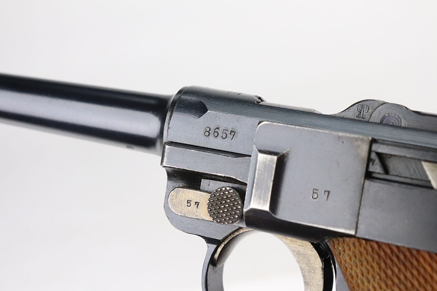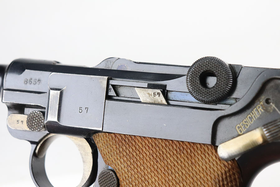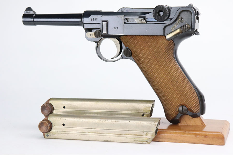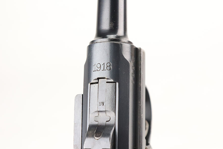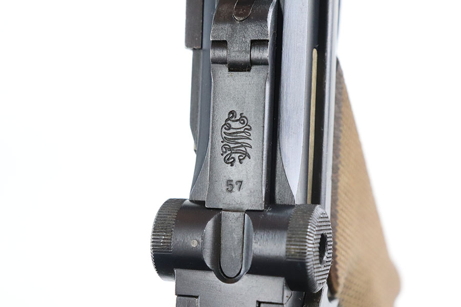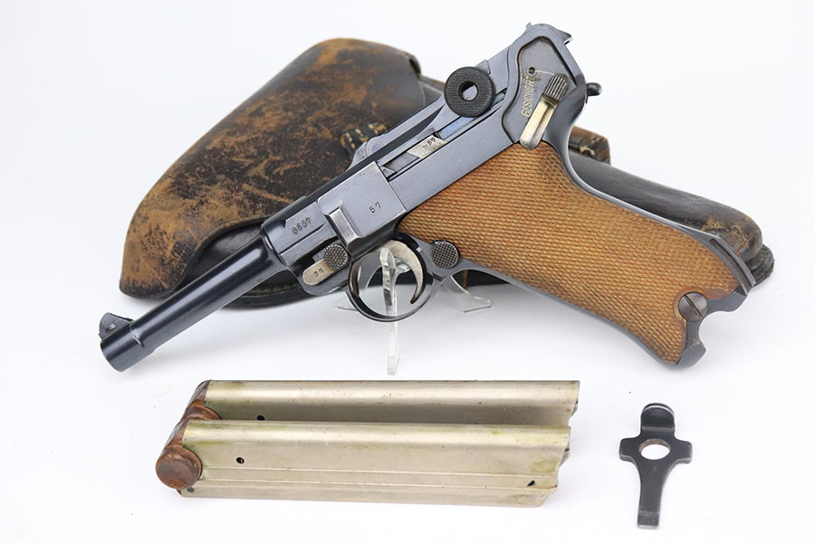 7/21/21 – This is a gorgeous 1918 military DWM Luger rig with both of its original, matching magazines. The pistol is fully matching throughout, including the grips. It has 97-98% of the original blue remaining with just a bit of bluing loss on the ears of the receiver and the sideplate. Minty bore and grips. Just one of the nicest examples you’ll see with both numbered mags still remaining. The rig is completed with an unmarked tool and a 1916 dated holster which is fairly worn throughout.