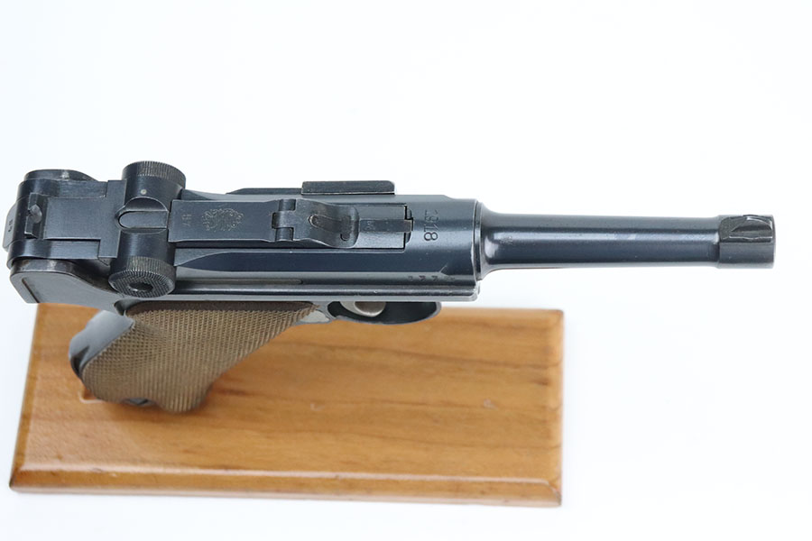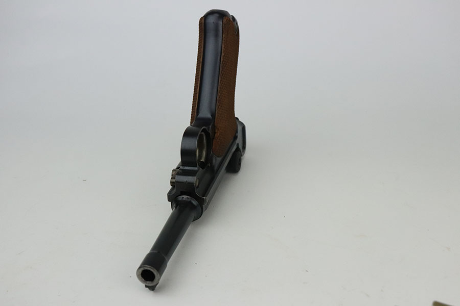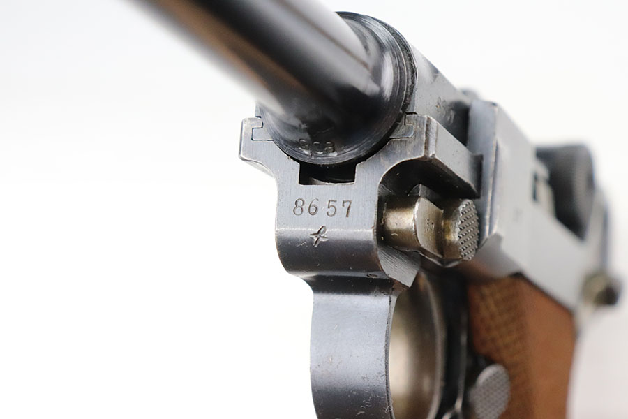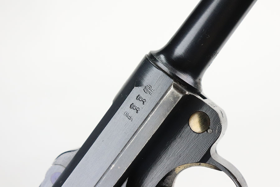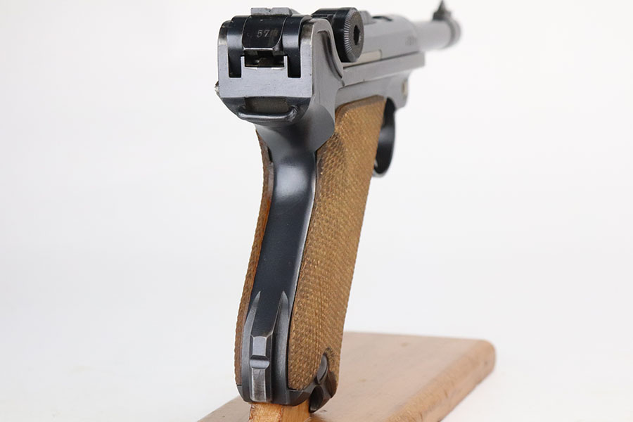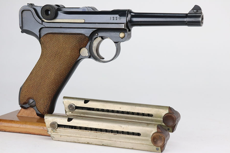 7/21/21 – This is a gorgeous 1918 military DWM Luger rig with both of its original, matching magazines. The pistol is fully matching throughout, including the grips. It has 97-98% of the original blue remaining with just a bit of bluing loss on the ears of the receiver and the sideplate. Minty bore and grips. Just one of the nicest examples you’ll see with both numbered mags still remaining. The rig is completed with an unmarked tool and a 1916 dated holster which is fairly worn throughout.