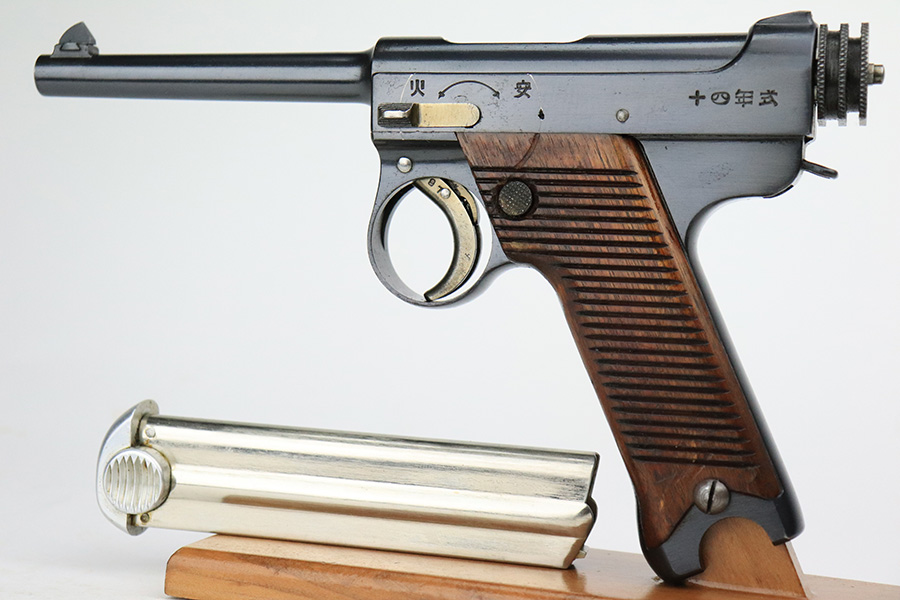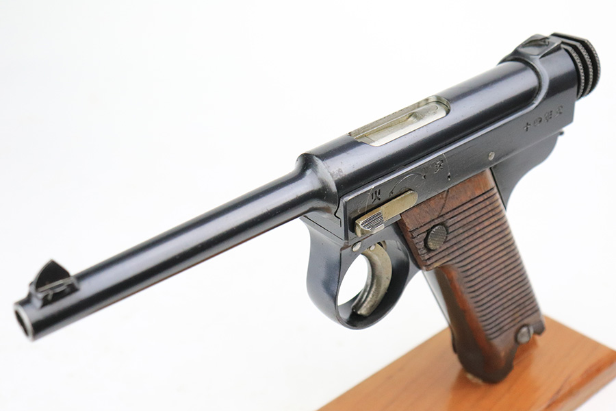 8/11/22 – This is a beautiful example of a Nambu Type 14 issued to the Japanese military in November of 1935. It is all matching and comes as a rig with a nice leather shoulder holster, one original matching-numbered magazine, a nickeled cleaning rod, and a spare firing pin. The gun itself has retained virtually all of its bluing with a small spot of very minor oxidation on the chamber and a small area of discoloration on the right side of the slide. Comes with excellent wood grips that are hand-numbered to match the gun. Mint bore.