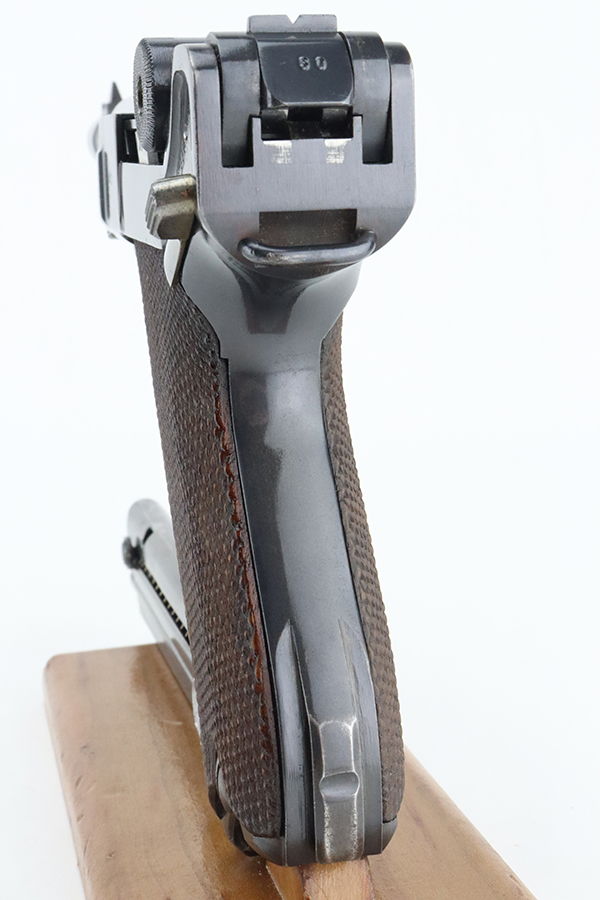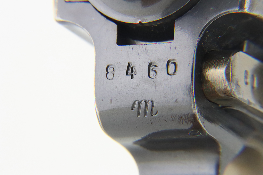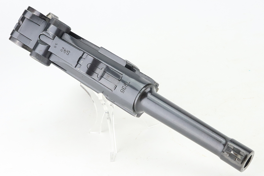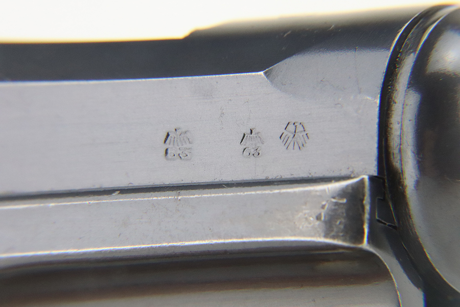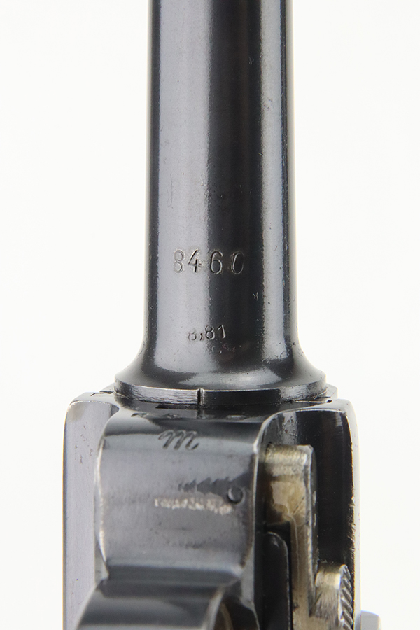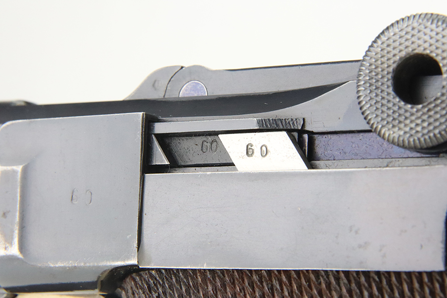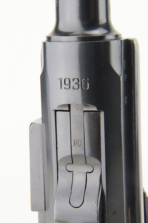 4/5/24 – This is a beautiful Mauser Luger issued to the Nazi military in 1936. All matching with the proper “Eagle 63” military acceptance proofs. Comes with one original matching-numbered magazine. The gun has retained nearly all of its original finish with just hints of high edge and muzzle wear. Excellent straw-coloring on the small parts. Fitted with minty un-numbered grips – the inside of the left panel reads “B. I. Smith Oran Africa 7-24-43”. Very nice bore with good rifling.