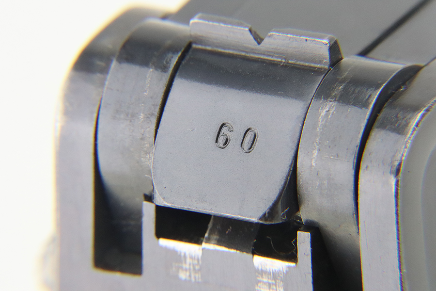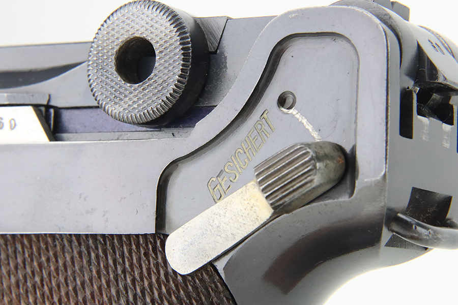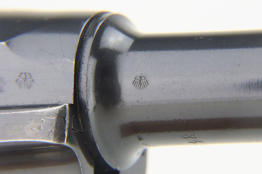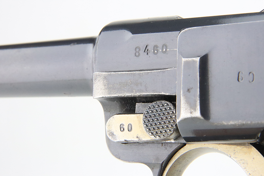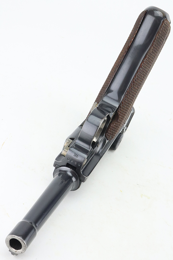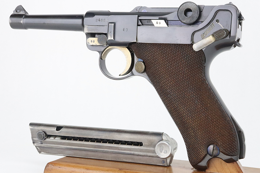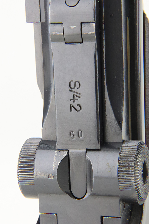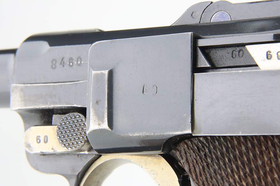 4/5/24 – This is a beautiful Mauser Luger issued to the Nazi military in 1936. All matching with the proper “Eagle 63” military acceptance proofs. Comes with one original matching-numbered magazine. The gun has retained nearly all of its original finish with just hints of high edge and muzzle wear. Excellent straw-coloring on the small parts. Fitted with minty un-numbered grips – the inside of the left panel reads “B. I. Smith Oran Africa 7-24-43”. Very nice bore with good rifling.