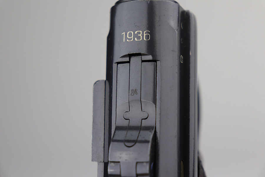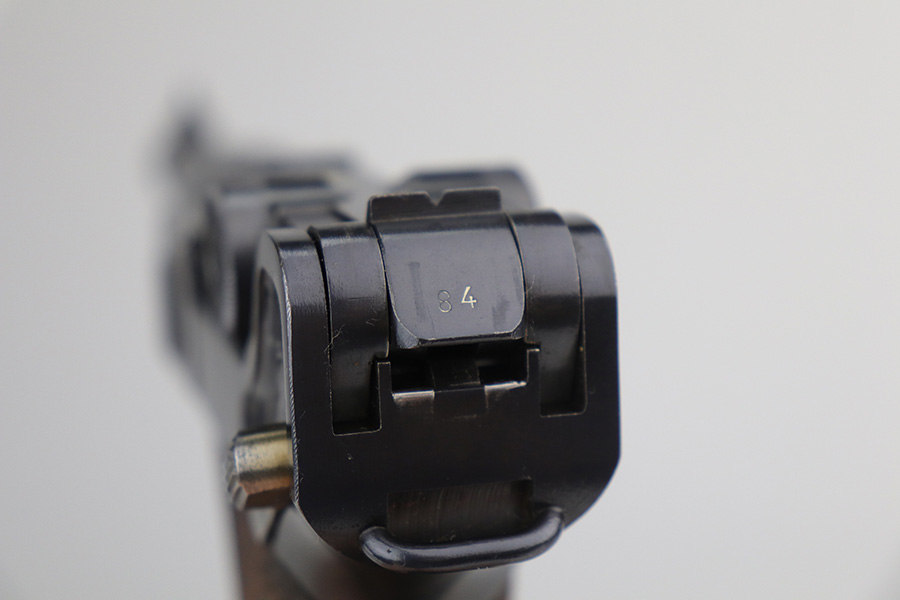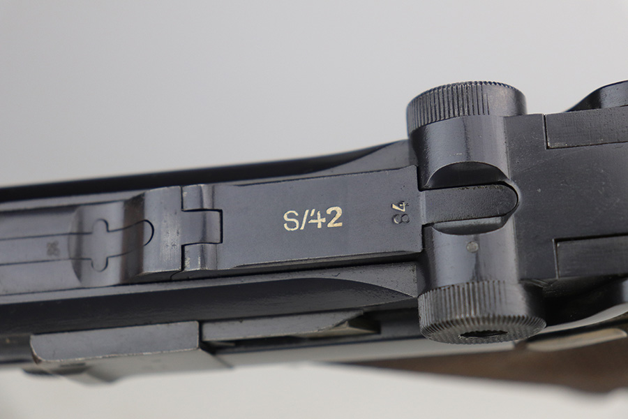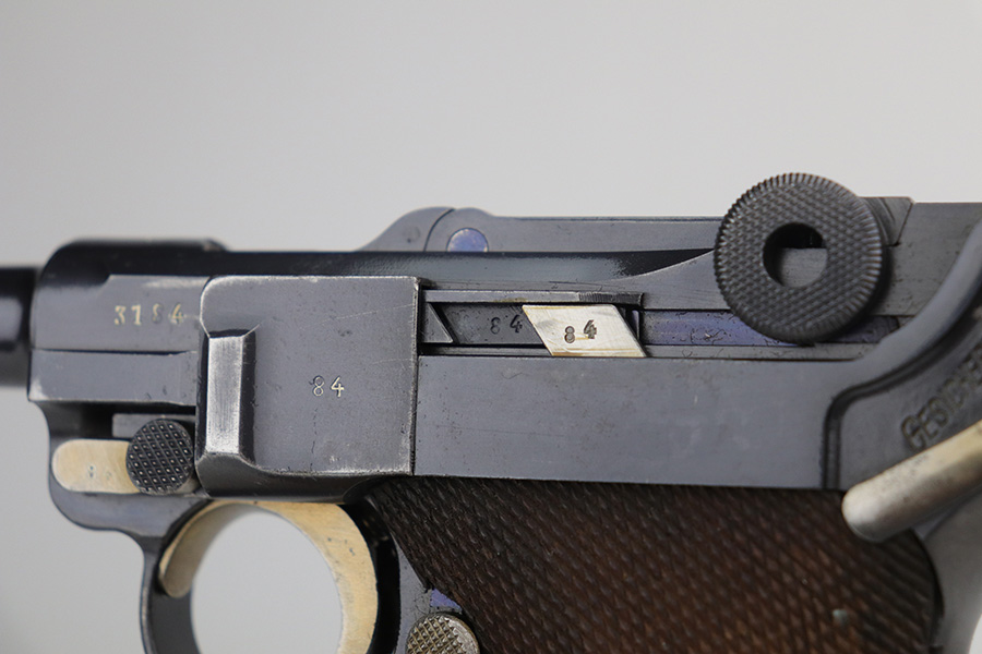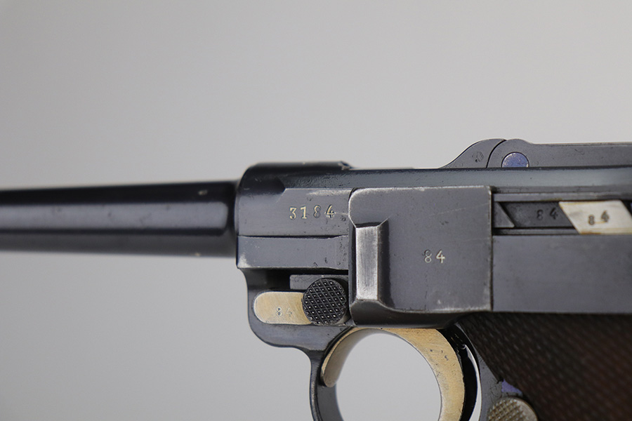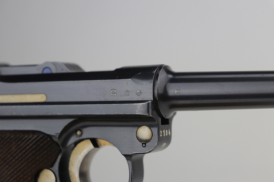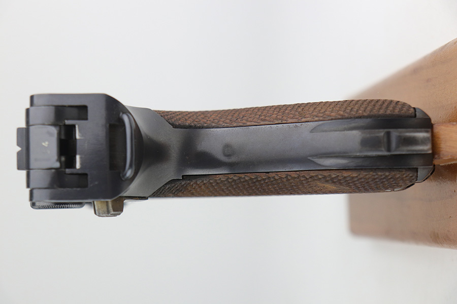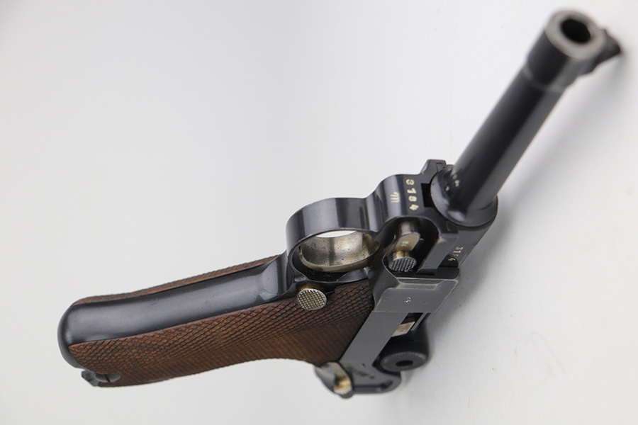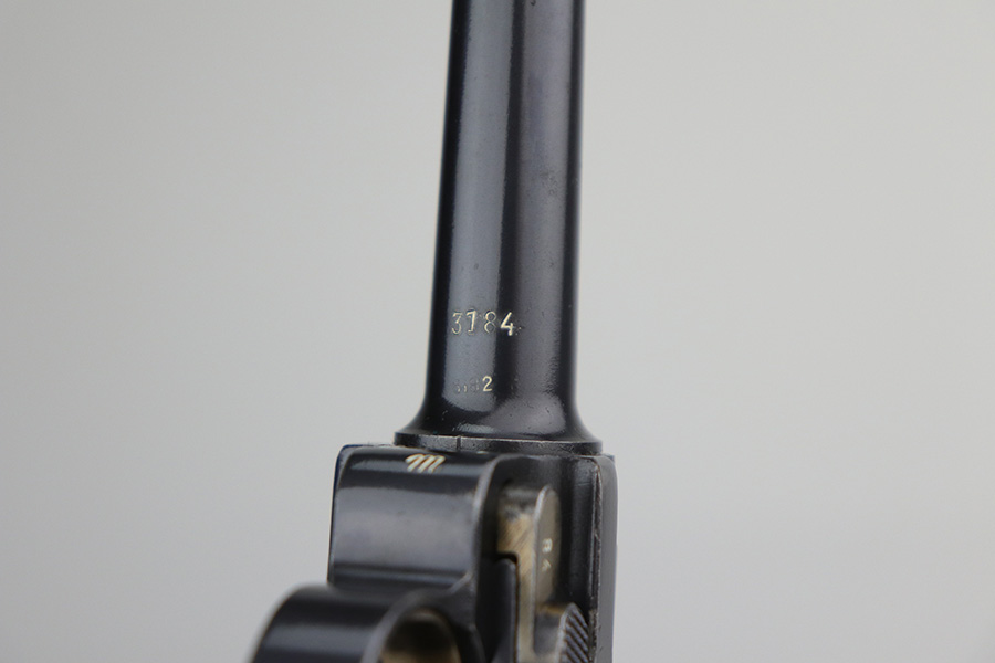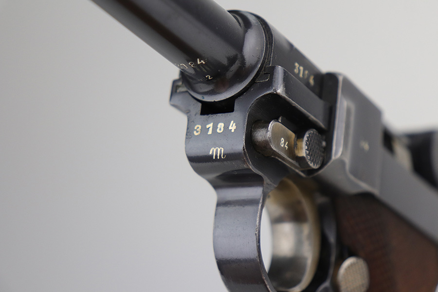 11/8/21 – This is an excellent Nazi Mauser Luger from 1936. Matching numbers throughout with about 96% of the original blue remaining. Most of the bluing loss is on the sideplate and left side of muzzle. The straw rates at ~95%. The grips are correctly unnumbered and have no cracks or chips, but there is a patch of smoothing on the left panel. Magazine is period correct but the serial is mismatched. The bore is somewhat worn with a little frost throughout.