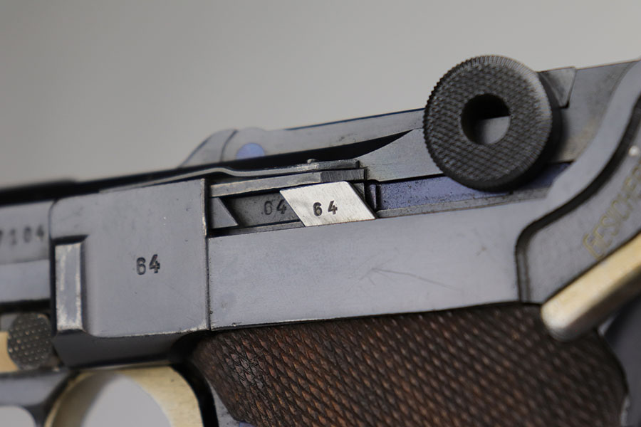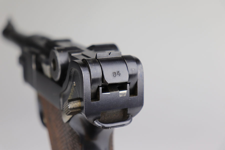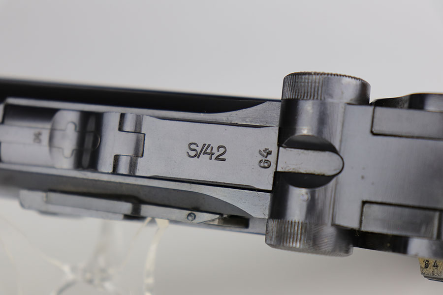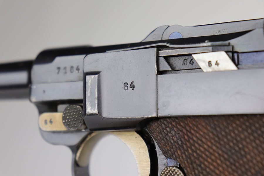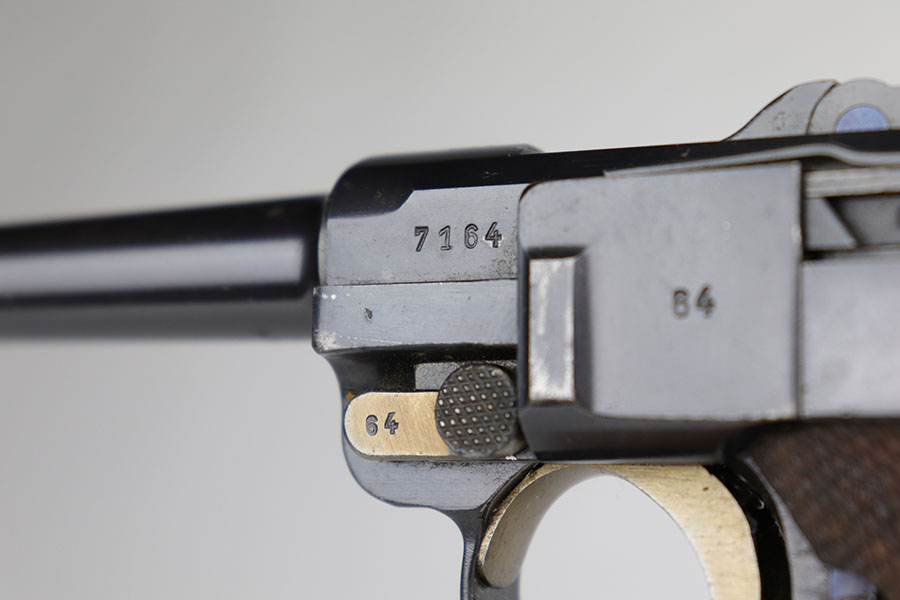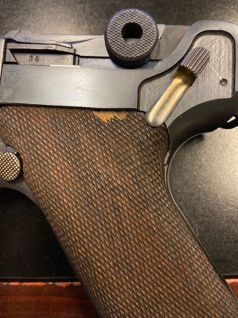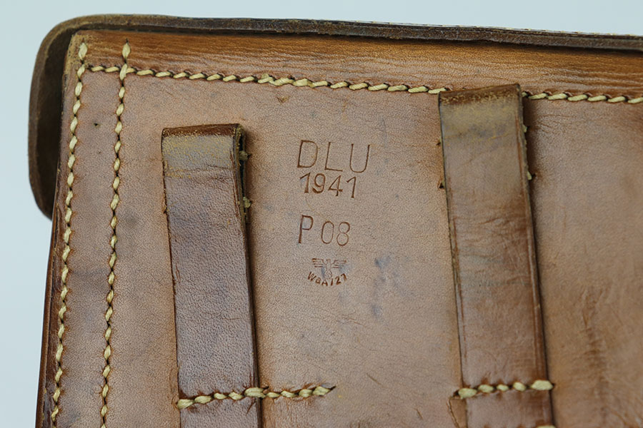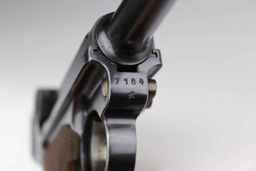 8/12/20 – This is an excellent 1937 Mauser Luger with original matching magazine and grips. The pistol has about 96% of the original blue with holster wear on the muzzle, sideplate and bottom of front strap. Excellent bore with minor signs of use. The grips are minty aside from a chip in the top of the left panel, which is in the listing photos. This pistol has an added sear safety, so likely ended up at a police arsenal at some point. Rig includes a mismatched spare magazine that’s numbered in the police style, and a police marked tool. It’s completed by a fantastic 1941 holster with ‘DLU’ maker mark and sharp waffenamt.