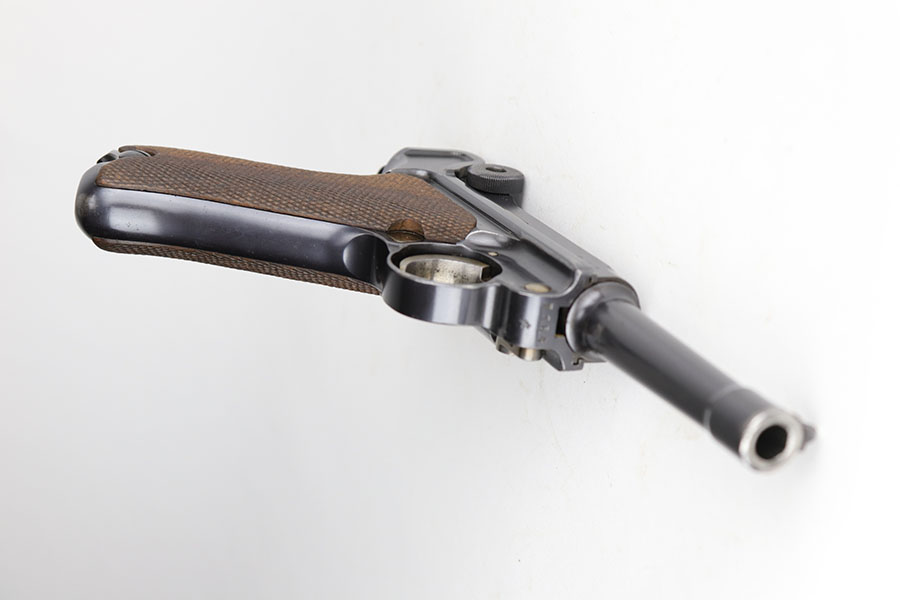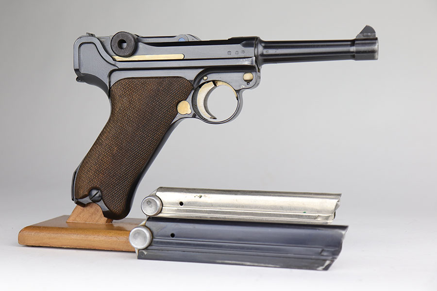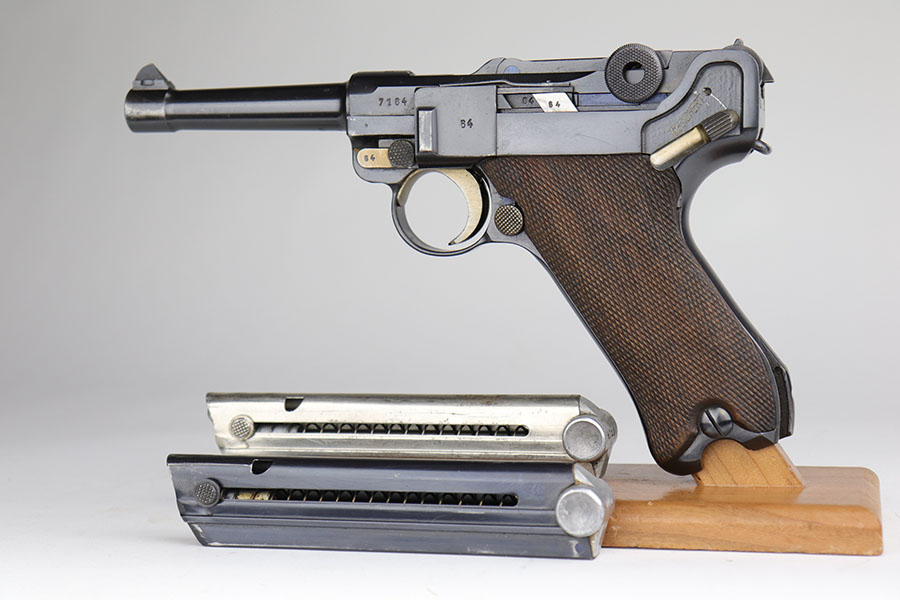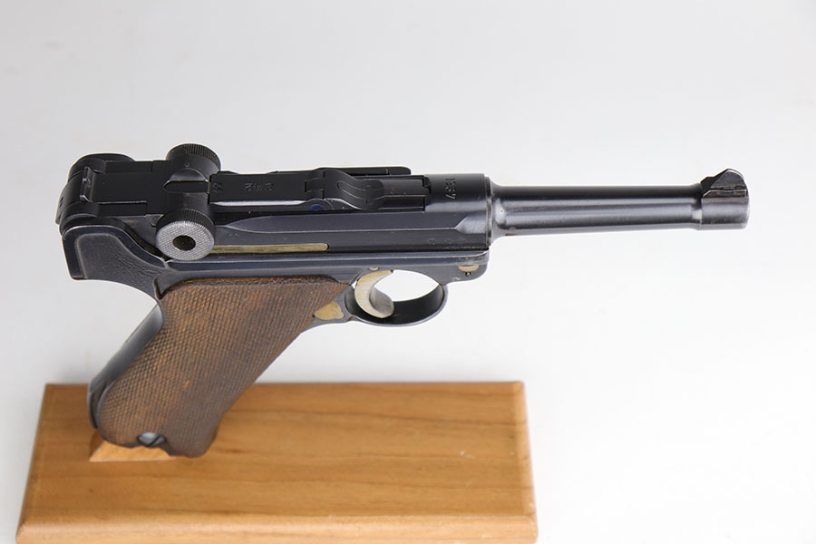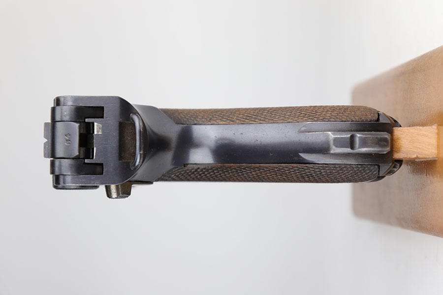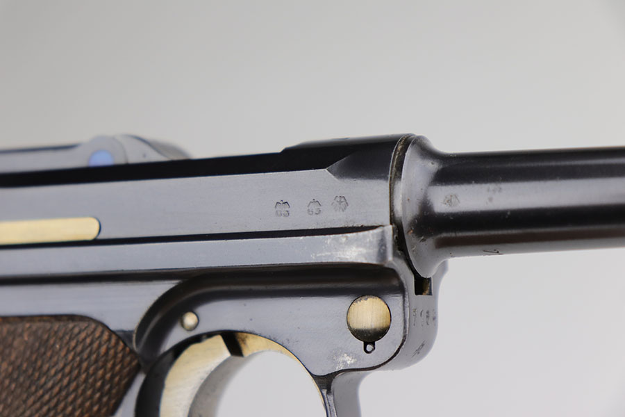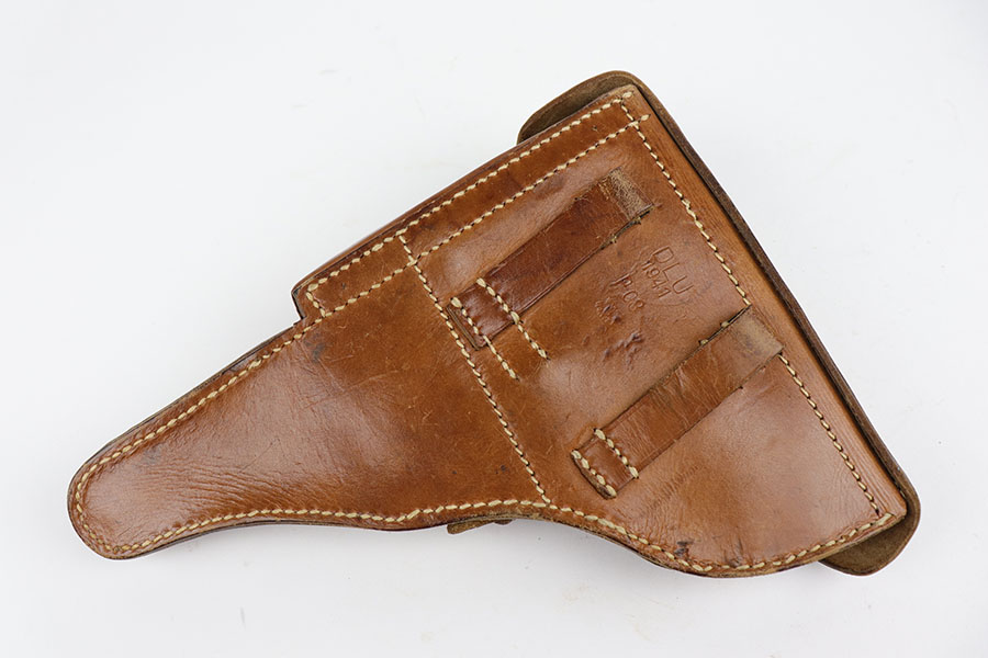 8/12/20 – This is an excellent 1937 Mauser Luger with original matching magazine and grips. The pistol has about 96% of the original blue with holster wear on the muzzle, sideplate and bottom of front strap. Excellent bore with minor signs of use. The grips are minty aside from a chip in the top of the left panel, which is in the listing photos. This pistol has an added sear safety, so likely ended up at a police arsenal at some point. Rig includes a mismatched spare magazine that’s numbered in the police style, and a police marked tool. It’s completed by a fantastic 1941 holster with ‘DLU’ maker mark and sharp waffenamt.
