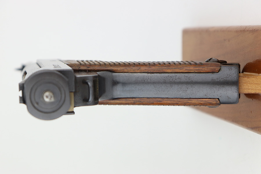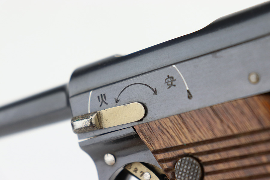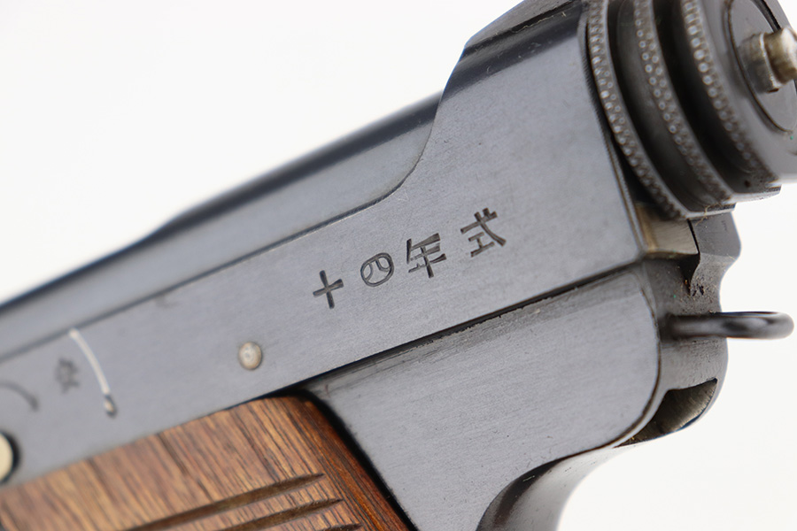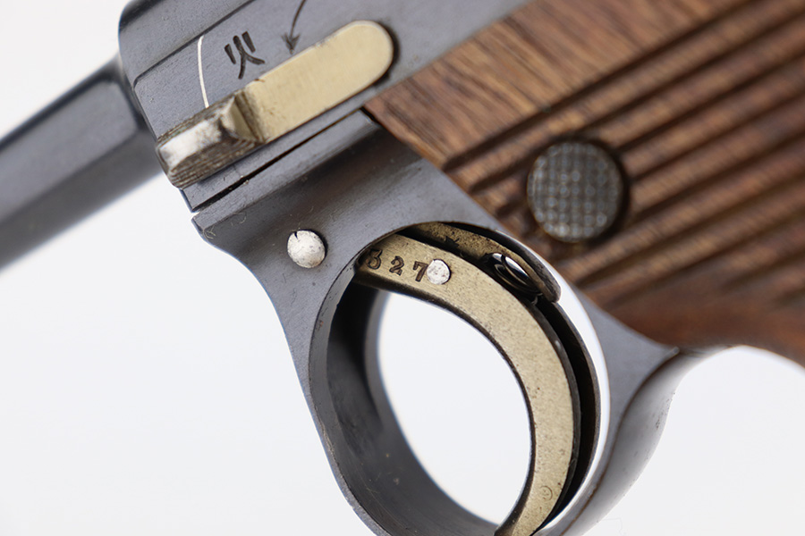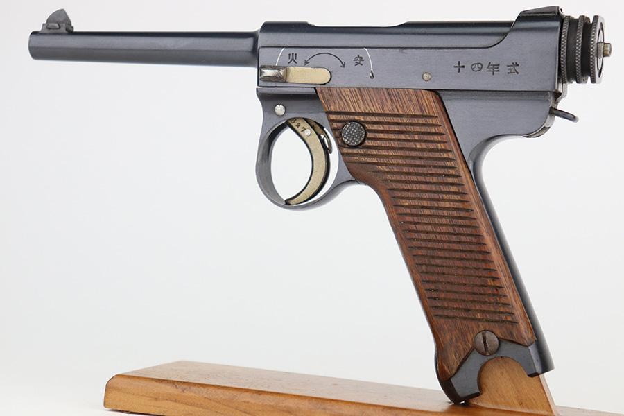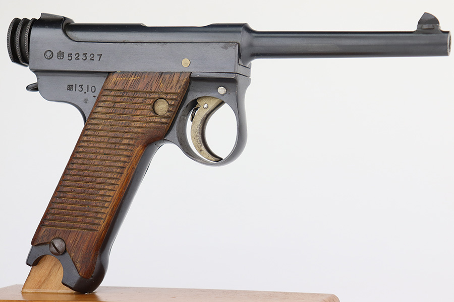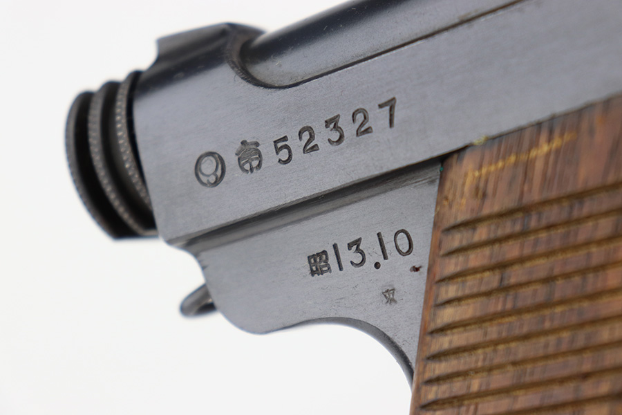 11/28/22 – This is a beautiful example of a Nambu Type 14 issued to the Japanese military in October of 1938. It is all matching and has all of the proper earlier-war features. It comes as a rig with an excellent period-correct hard shell holster, two original matching-numbered magazines, a nickeled cleaning rod, and a spare firing pin. The gun itself is in near-mint condition, retaining virtually all of its original finish. There is just some very light pin-pricking on both grip straps. Comes with excellent period-correct wood grips. They are hand-numbered on the inside – the right panel appears to be matching, the left does not appear to match. Mint bore.