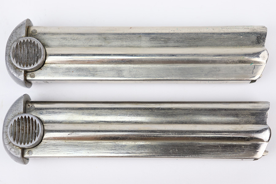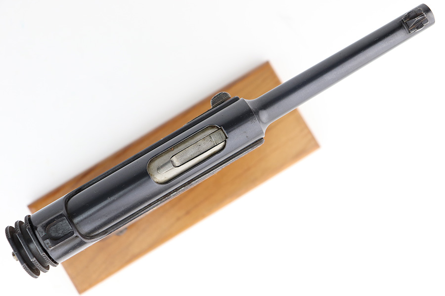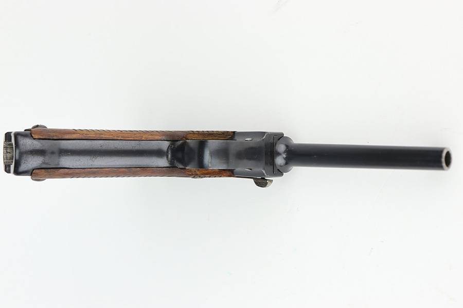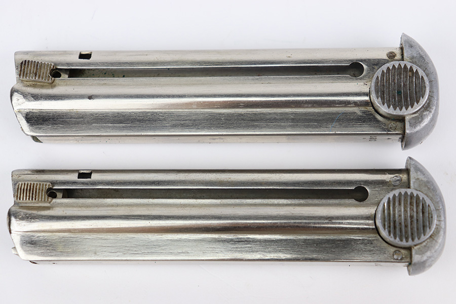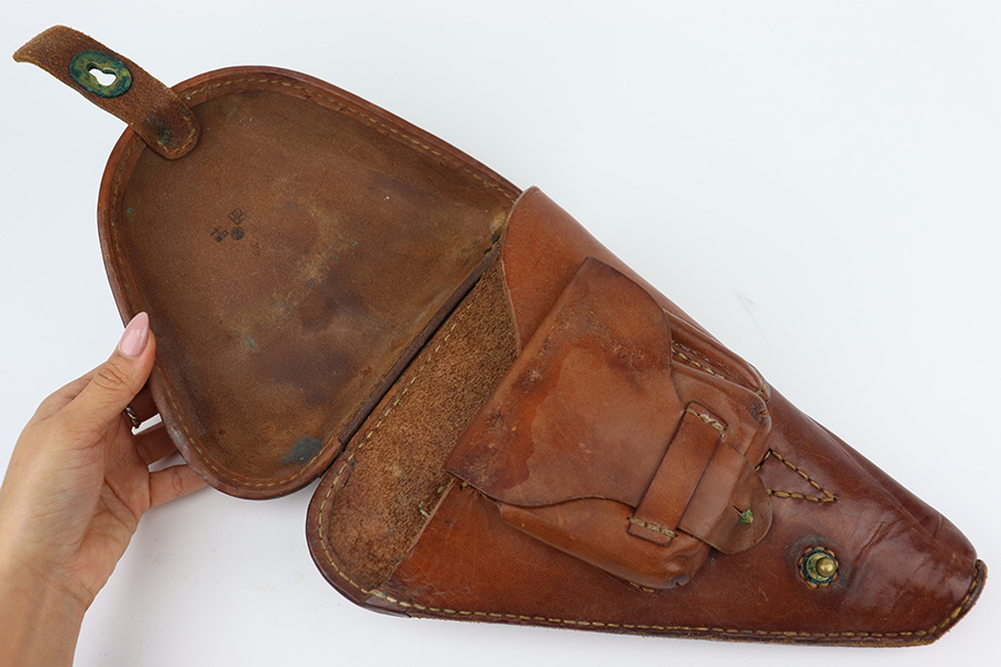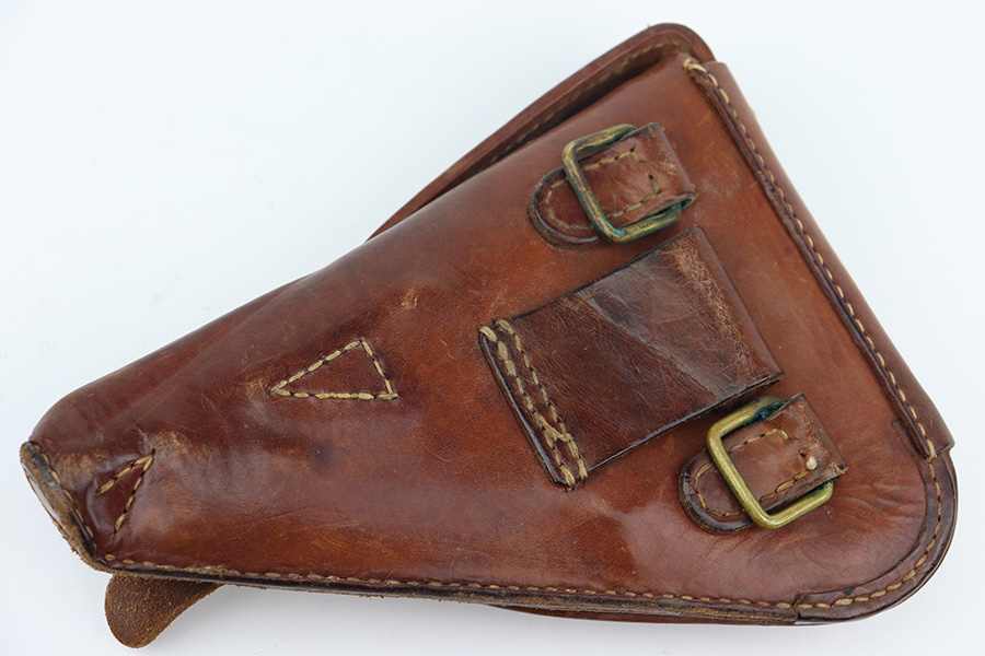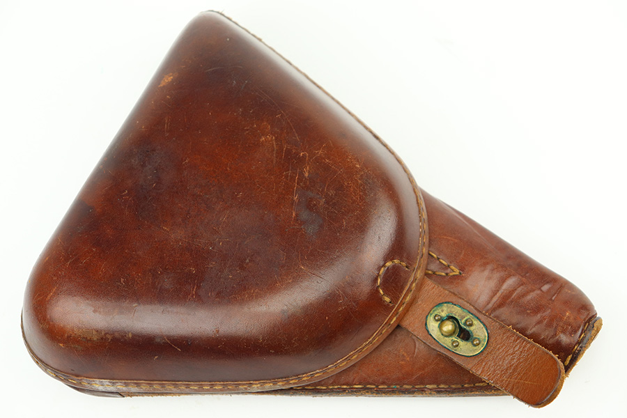 11/28/22 – This is a beautiful example of a Nambu Type 14 issued to the Japanese military in October of 1938. It is all matching and has all of the proper earlier-war features. It comes as a rig with an excellent period-correct hard shell holster, two original matching-numbered magazines, a nickeled cleaning rod, and a spare firing pin. The gun itself is in near-mint condition, retaining virtually all of its original finish. There is just some very light pin-pricking on both grip straps. Comes with excellent period-correct wood grips. They are hand-numbered on the inside – the right panel appears to be matching, the left does not appear to match. Mint bore.