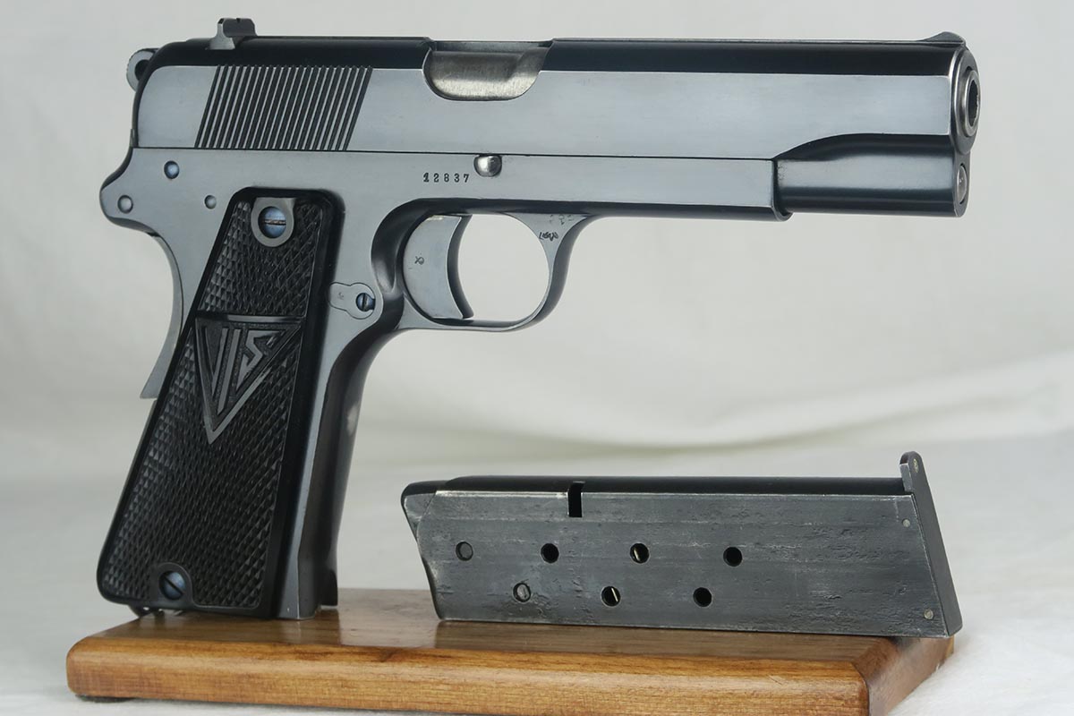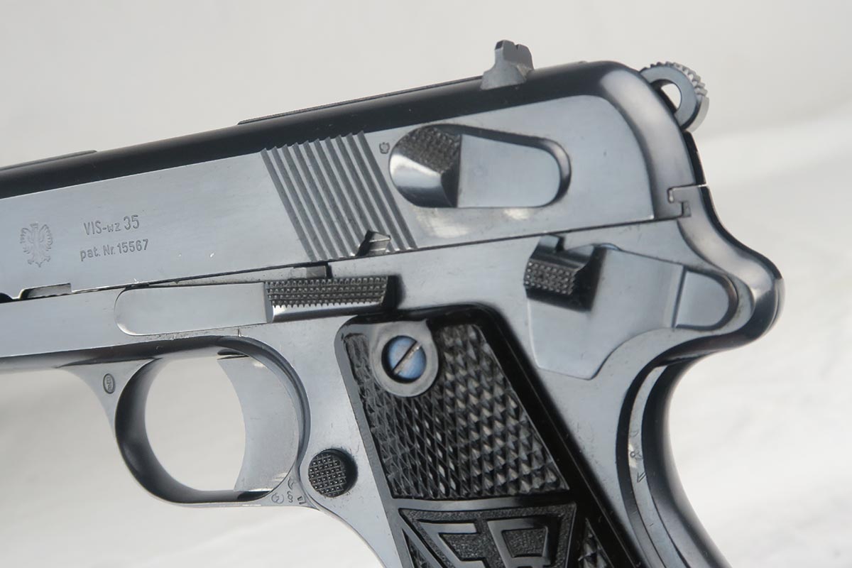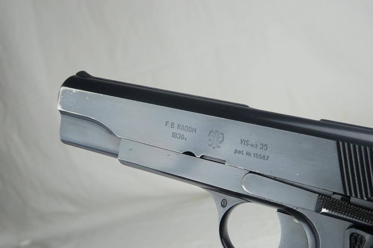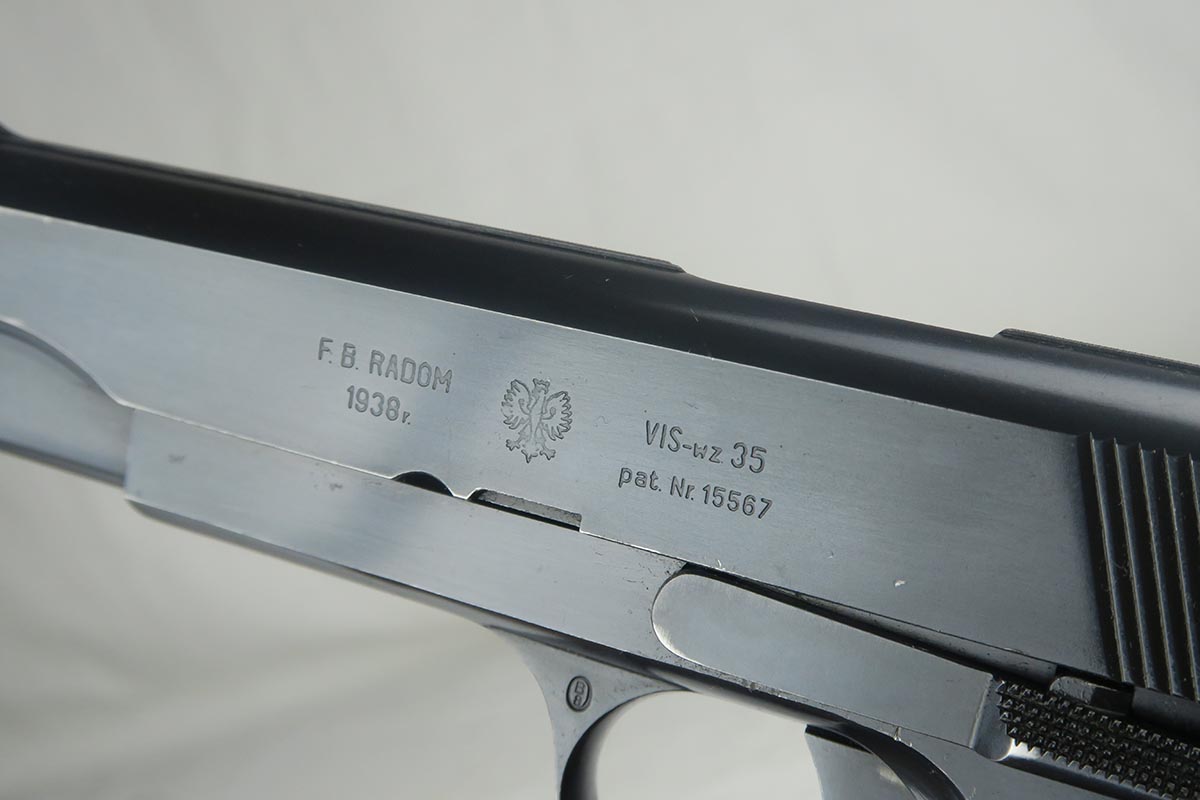 11/24/17 – This is a beautiful and rare Radom vis 35 with Polish Eagle on slide.  Manufactured in 1938, this pistol is all original and matching with about 97% blue remaining.  There is a spot of finish loss on the front strap and another on the left side of the slide.  Rare G2 proofed magazine.  Excellent black grips.  Fantastic bore.