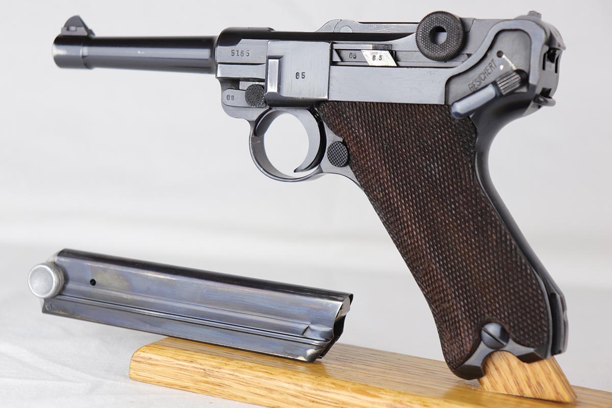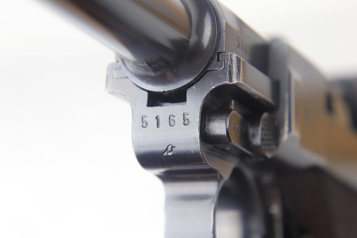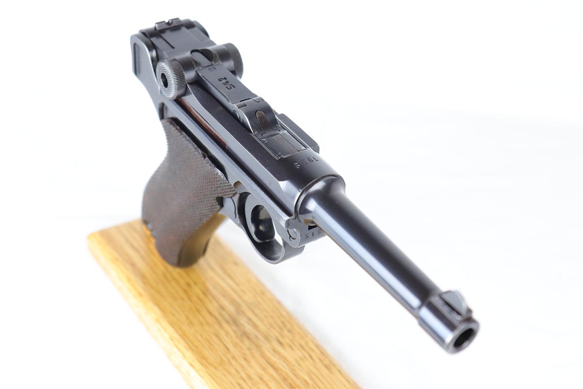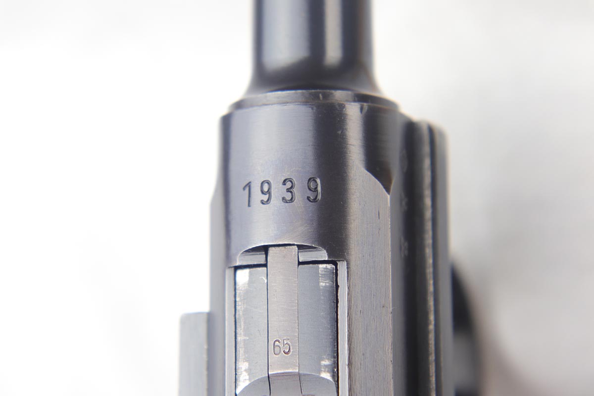 7/26/18 – The is a beautiful 1939 Mauser Luger from World War II. It is all matching including the magazine and grips! The original finish is about 98%, with only minor wear on the sideplate and muzzle. E/63 proofs on the right side. Nice grips and original magazine. Excellent bore.