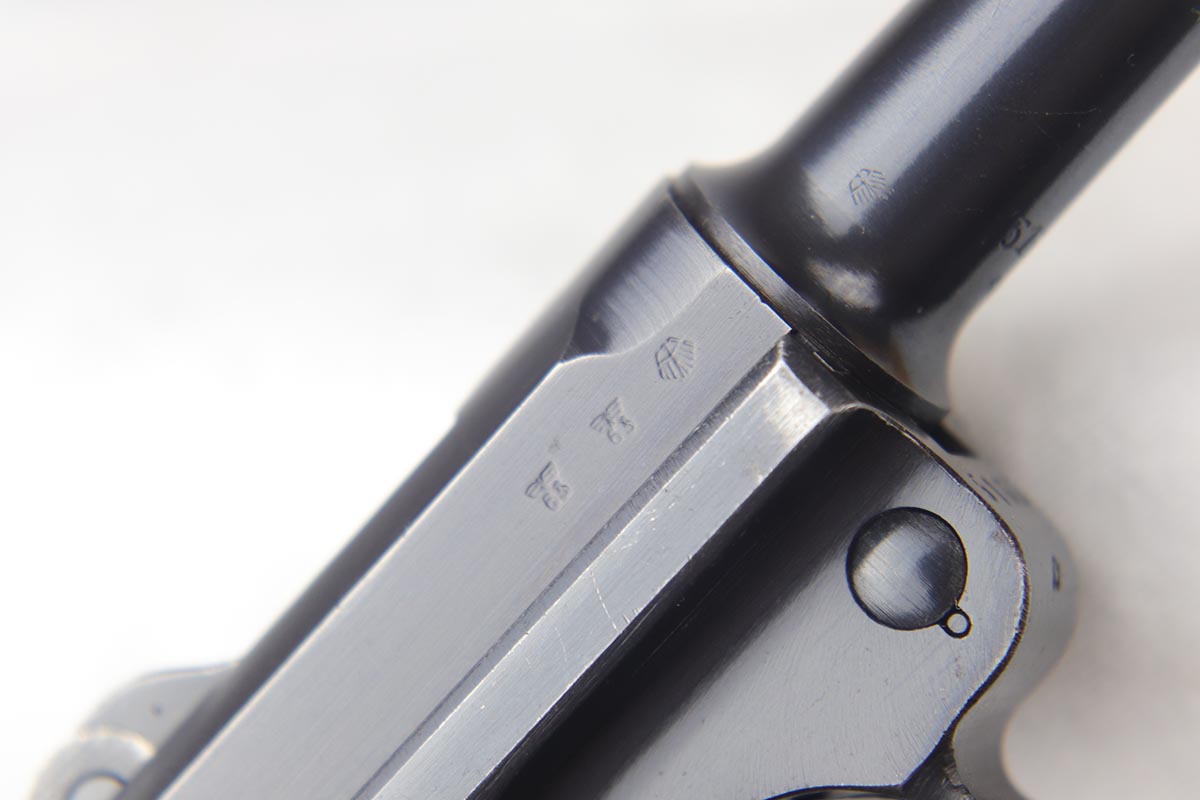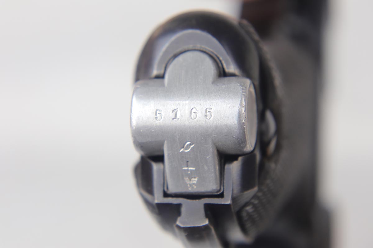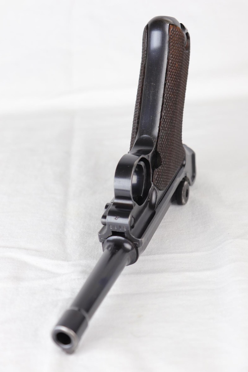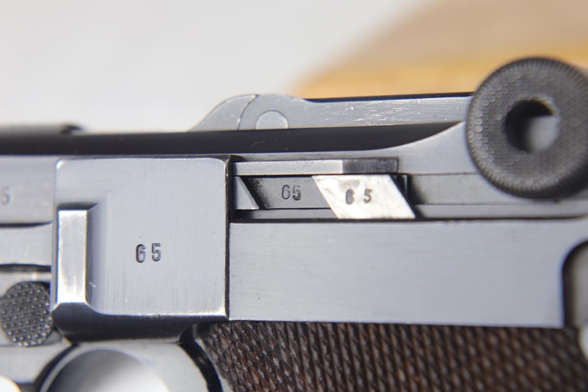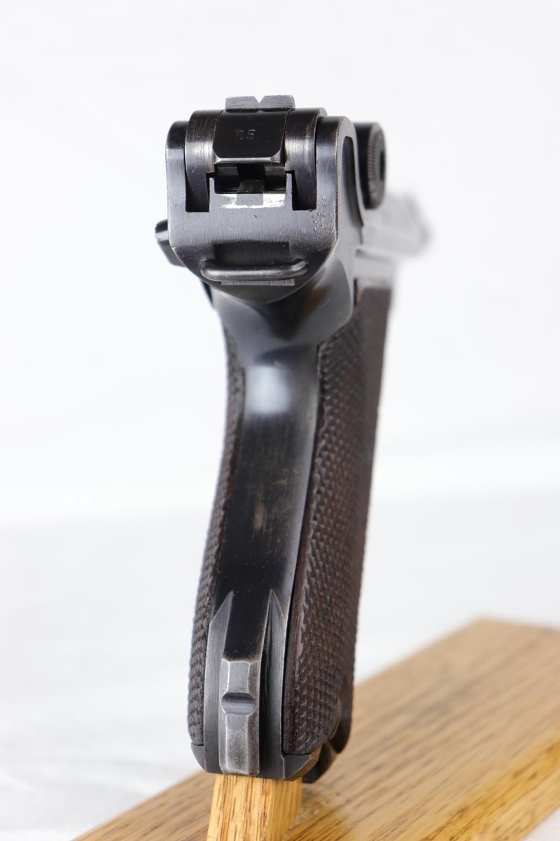 7/26/18 – The is a beautiful 1939 Mauser Luger from World War II. It is all matching including the magazine and grips! The original finish is about 98%, with only minor wear on the sideplate and muzzle. E/63 proofs on the right side. Nice grips and original magazine. Excellent bore.