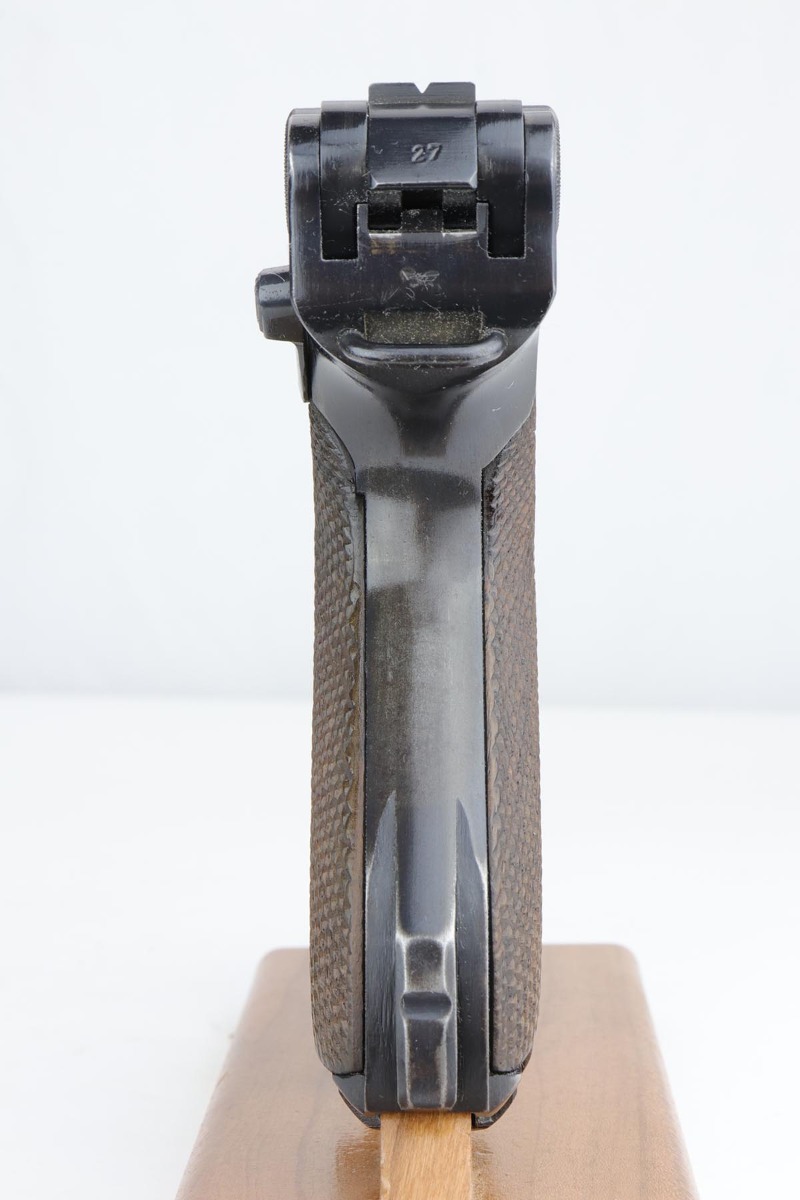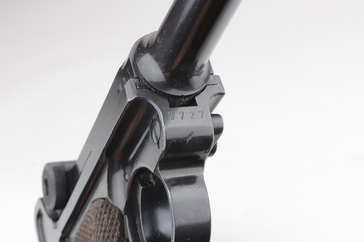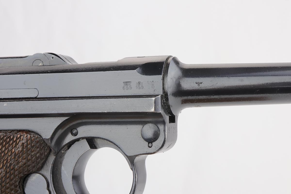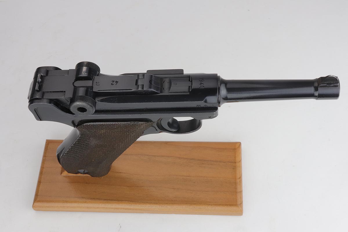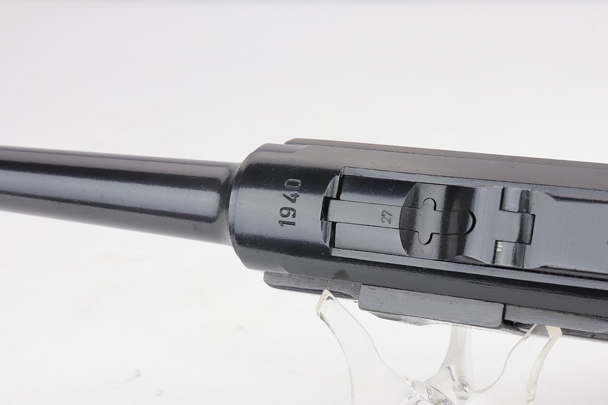 9/24/19 – This is a beautiful Mauser Luger from 1940 that was issued to the German Army. It has the original matching grips, and the magazine is also matching but the numbering is not factory original. The bluing rates at about 98% with minor high point wear, and a spot of finish loss on the bottom of the front strap. The grips show some handling wear but no cracks or chips. Bore is shiny with strong rifling, but has a hint of frost.