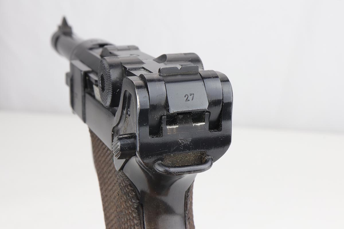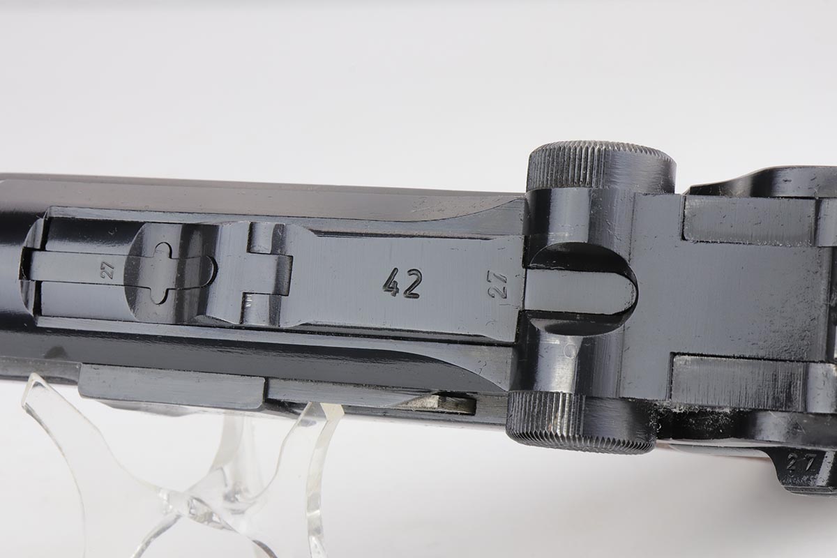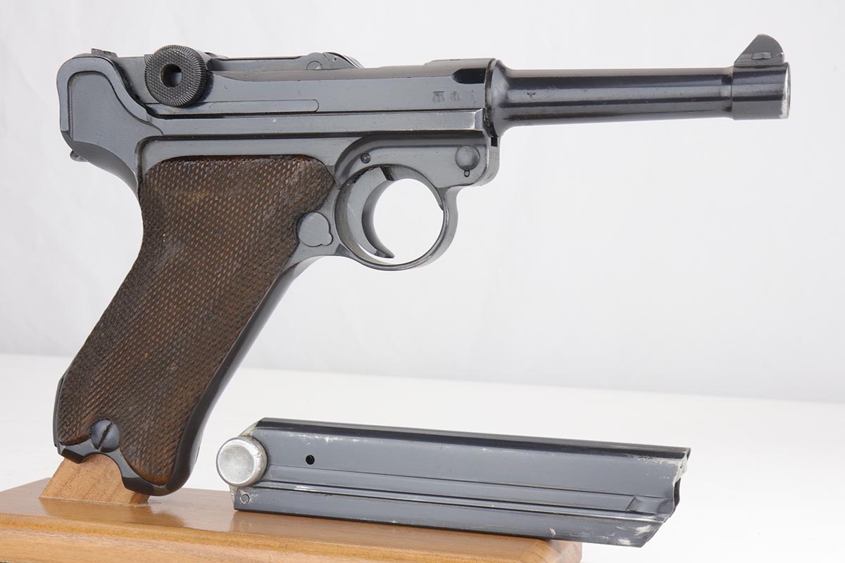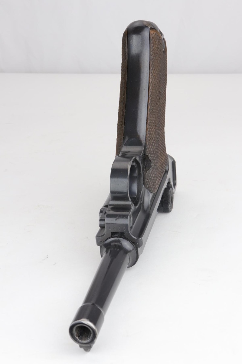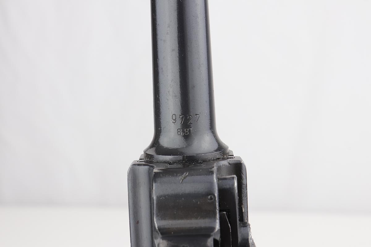 9/24/19 – This is a beautiful Mauser Luger from 1940 that was issued to the German Army. It has the original matching grips, and the magazine is also matching but the numbering is not factory original. The bluing rates at about 98% with minor high point wear, and a spot of finish loss on the bottom of the front strap. The grips show some handling wear but no cracks or chips. Bore is shiny with strong rifling, but has a hint of frost.