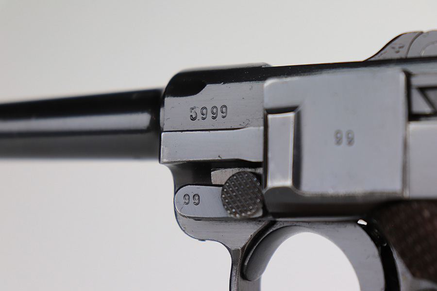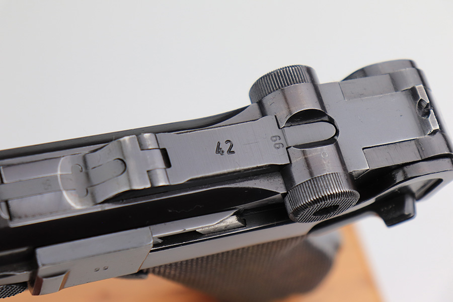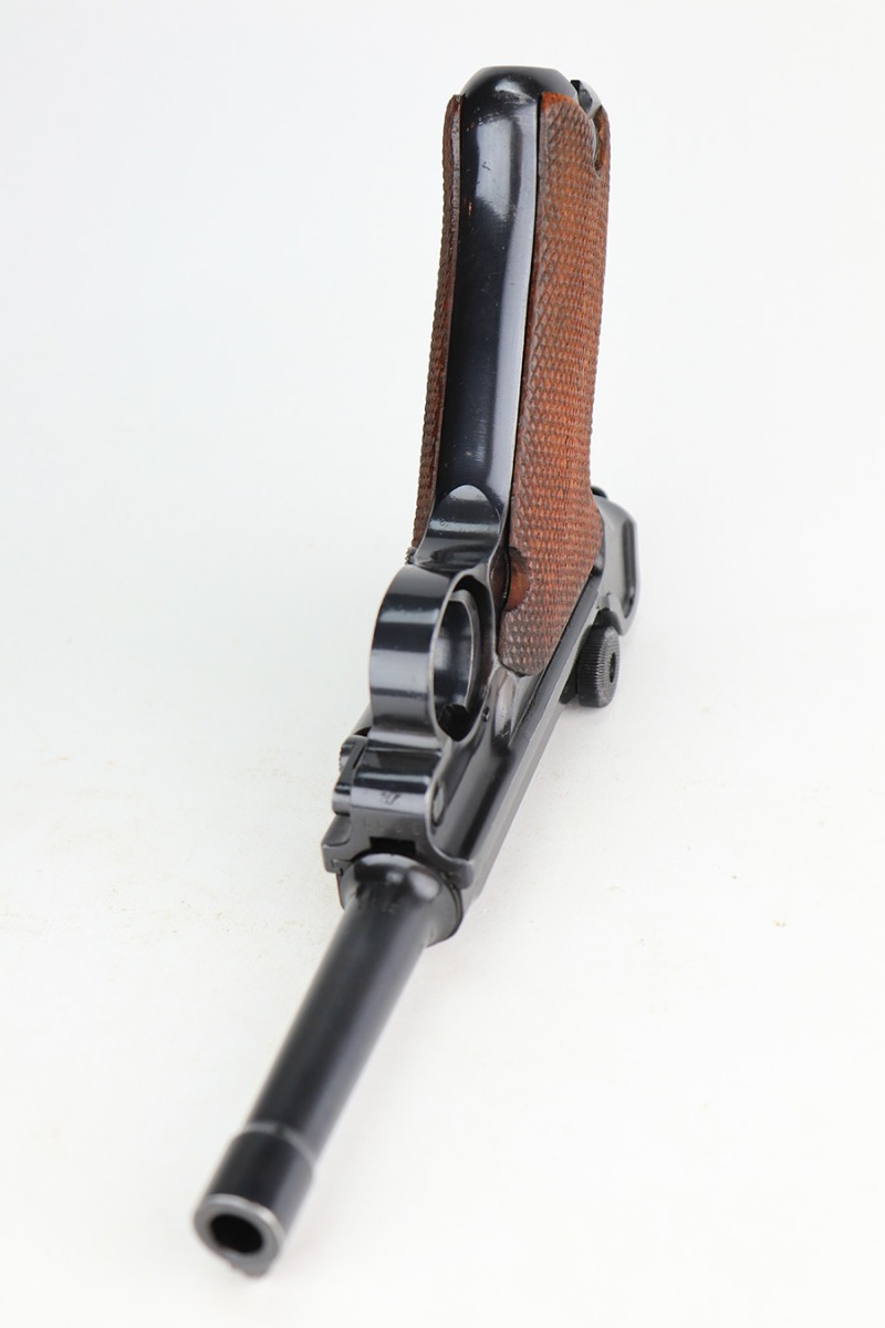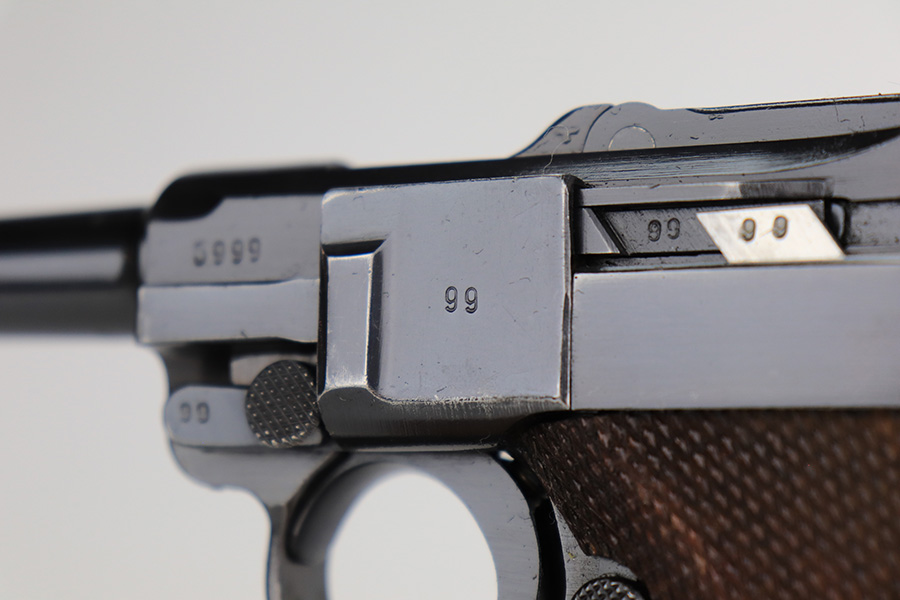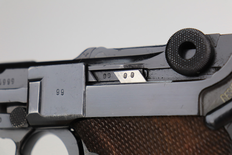4/19/23 – This is a beautiful example of a Mauser Luger issued to the Nazi military in 1940. It is all matching and has the proper “Eagle 655” military acceptance proofs. It is in near-mint condition, retaining virtually all of its original bluing. There are just hints of wear on some of the high edges and a few light surface scratches on the front strap. Fitted with minty matching-numbered wood grips and comes with two force-matched magazines. The bore is near-mint.