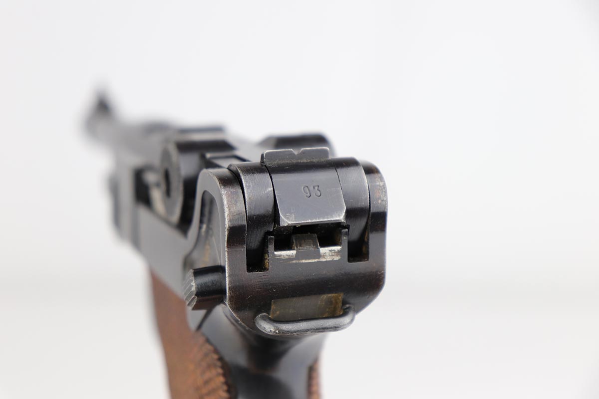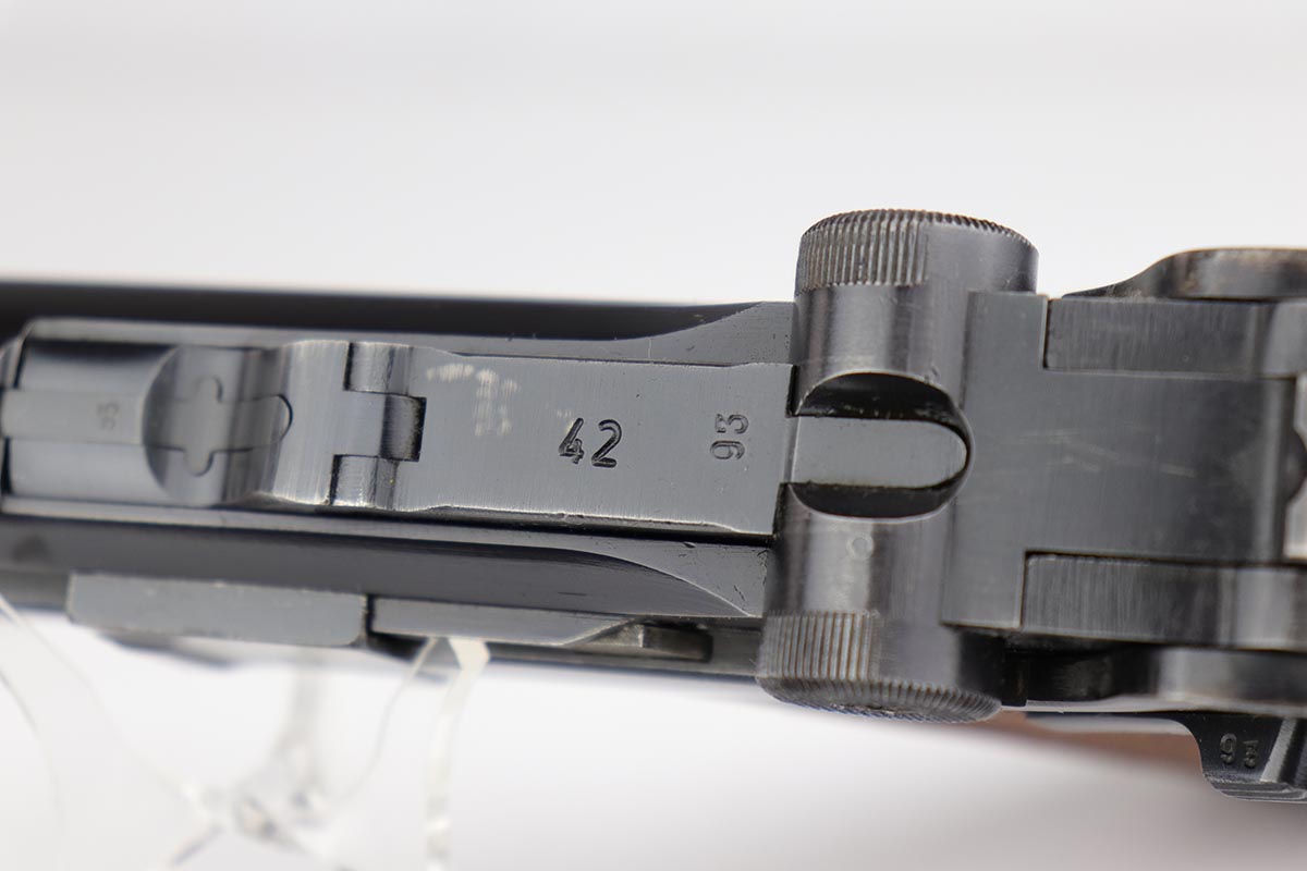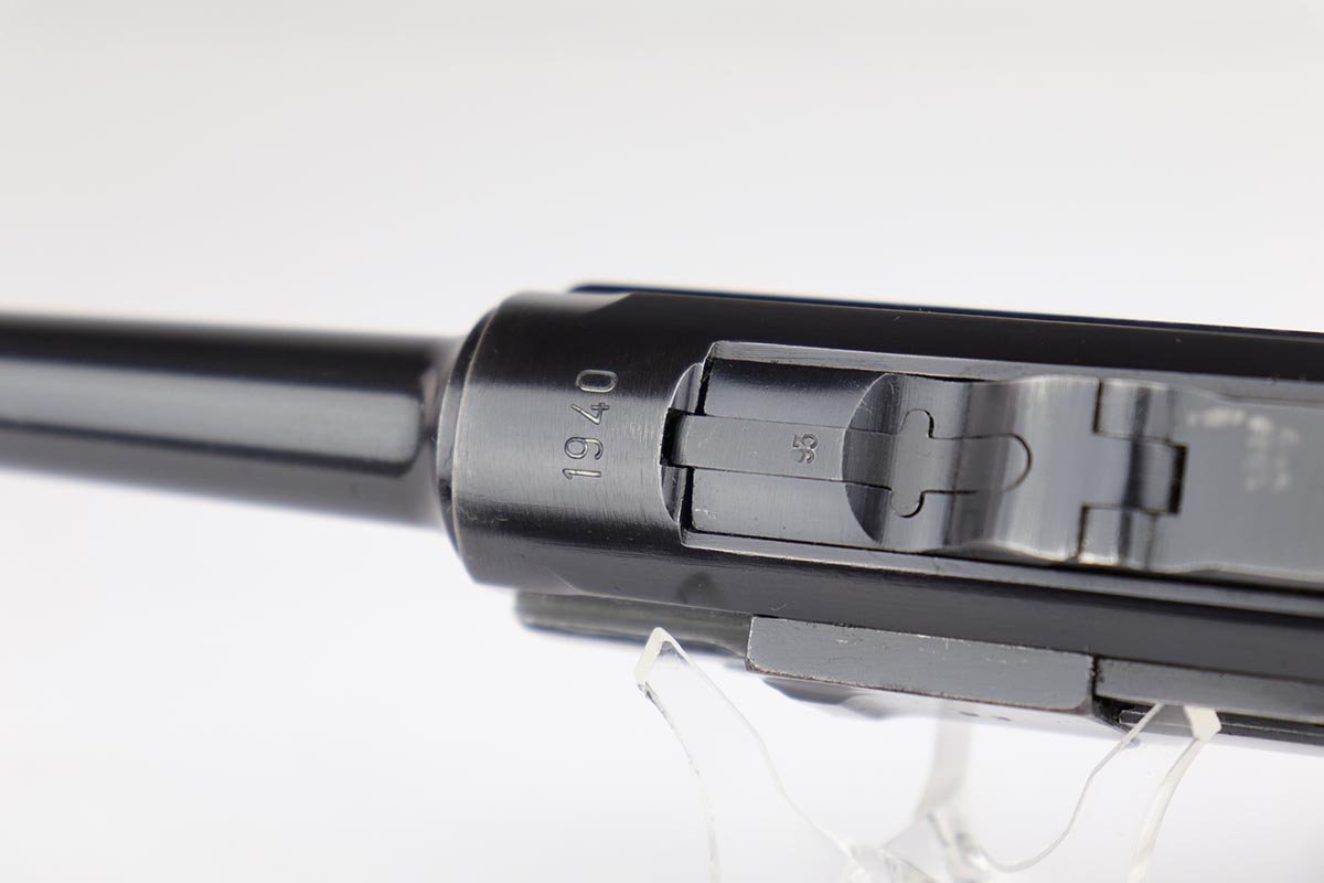 9/2/20 – This is an early wartime Nazi Luger made in 1940. The original finish is a deep, and remarkable quality blue, rating at about 98%. All of the parts, including internal small parts are matching numbers. This includes the grips, the hold open, toggle pin and the firing pin. The mechanics are excellent, and the bore is shiny/ clean. The magazine is period correct and most likely a factory replacement as it is Eagle/655 proofed but with no number and no sign of the number being removed. So it is a blank bottom magazine and therefore, technically not a “mismatch”. A very desirable magazine.