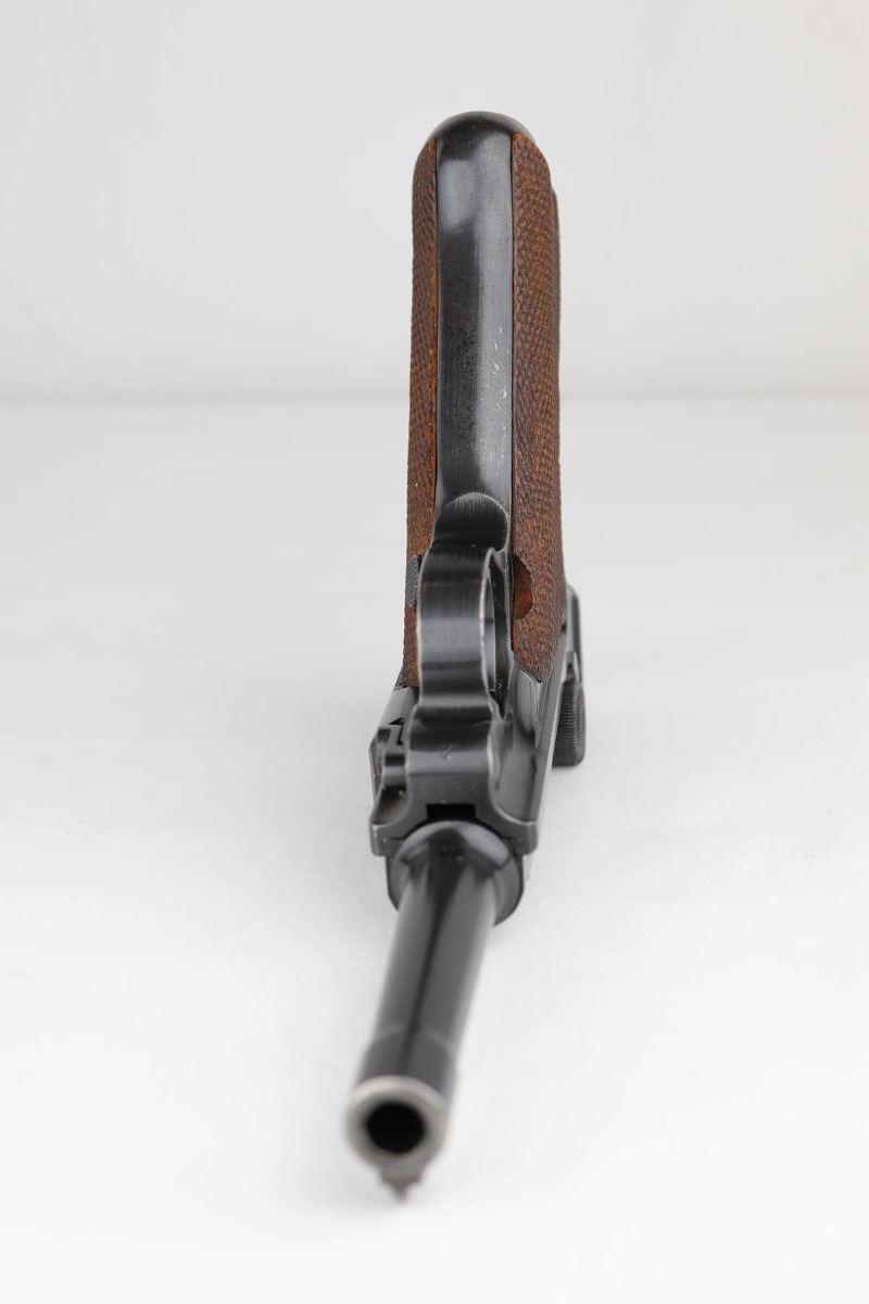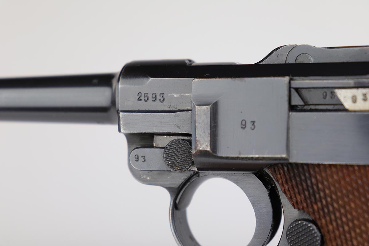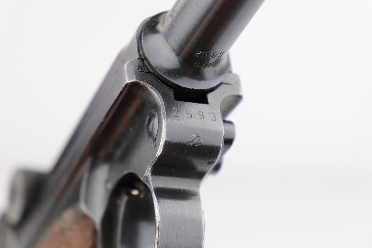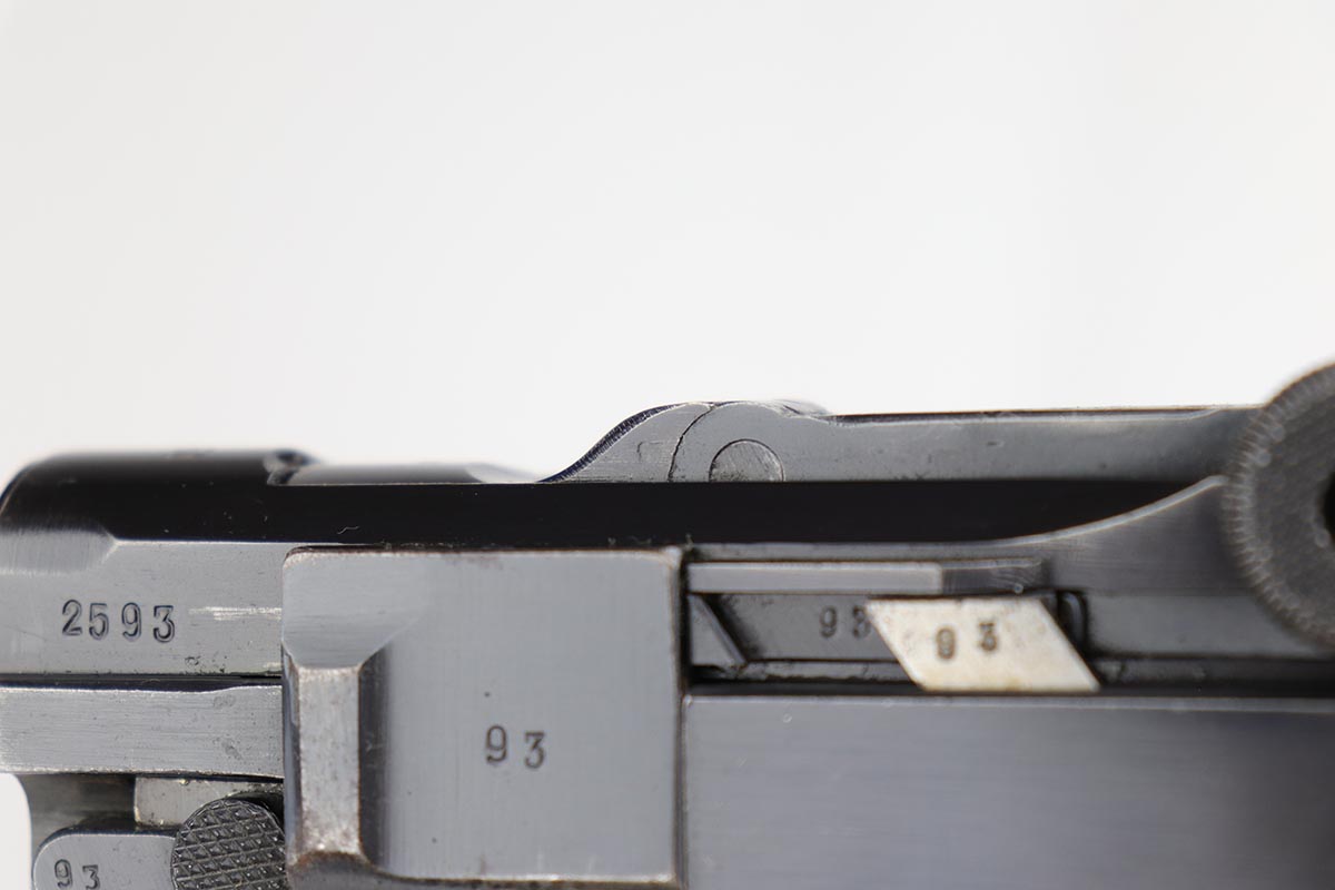 9/2/20 – This is an early wartime Nazi Luger made in 1940. The original finish is a deep, and remarkable quality blue, rating at about 98%. All of the parts, including internal small parts are matching numbers. This includes the grips, the hold open, toggle pin and the firing pin. The mechanics are excellent, and the bore is shiny/ clean. The magazine is period correct and most likely a factory replacement as it is Eagle/655 proofed but with no number and no sign of the number being removed. So it is a blank bottom magazine and therefore, technically not a “mismatch”. A very desirable magazine.