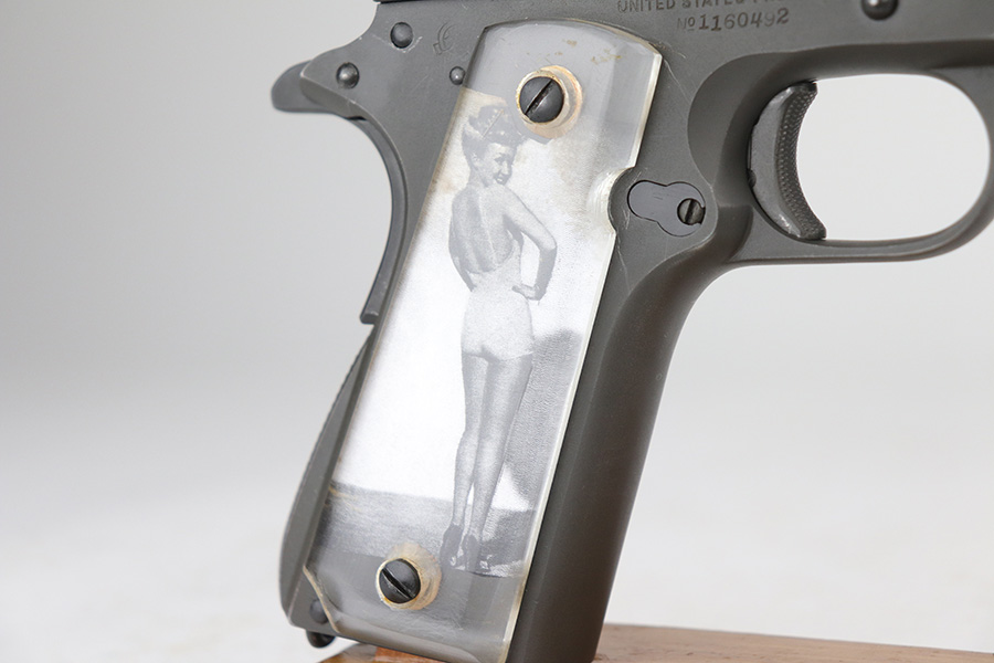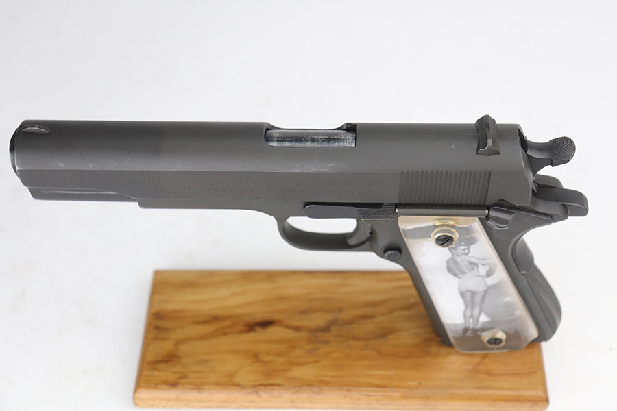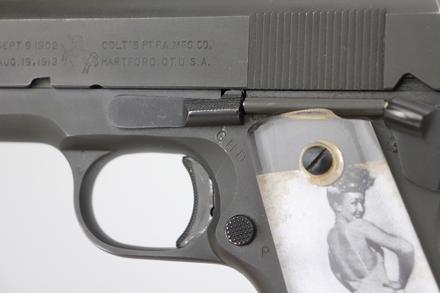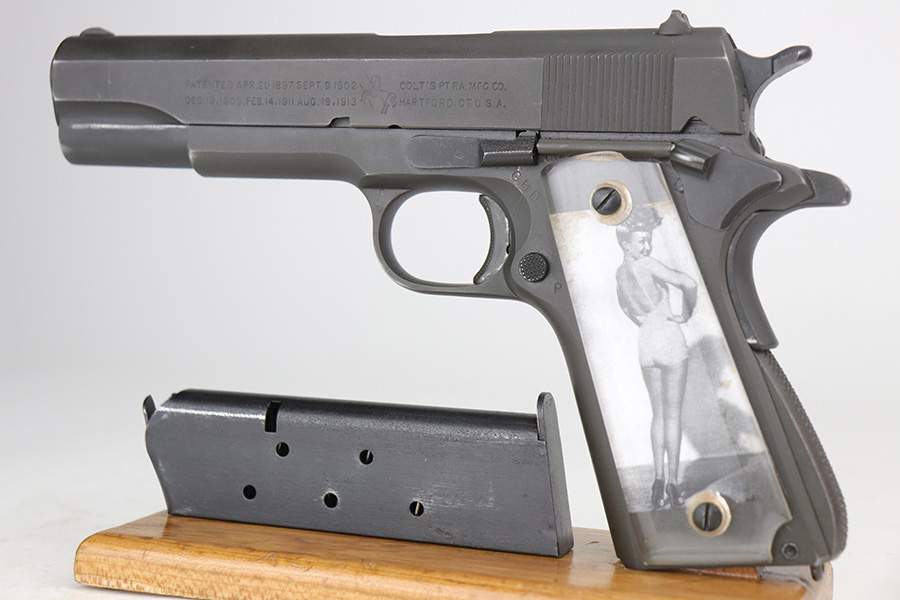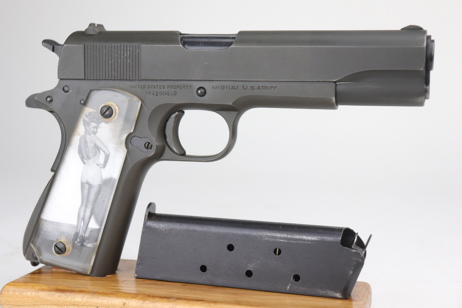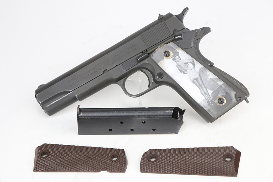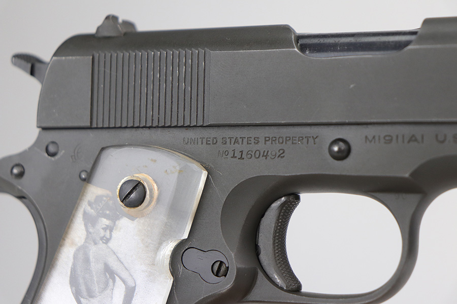 11/5/21 – This is a beautiful example of a Colt Model 1911A1 issued to the US Military in Early 1944. It is all-correct, – “United States Property” marked, has the proper cross-canon military cartouche on the right side of the frame, and has the proper “GHD” inspector initials. It has a “Colt Auto .45” barrel with a small “F” under the lug – correct for this year. This one also has a pair of original “sweetheart” acrylic grips that feature a black and white photo of a woman. Also included with this gun is a pair of original period-correct grips if you wanted to swap them out. The gun is in beautiful, near-mint condition, retaining about 99% of its original parkerized finish with just a hint of wear on some of the high edges. Unfortunately, someone very lightly scratched the initials “ATC” on the front strap just below the trigger guard. The bore has decent rifling but there is minor pin-pricking throughout.