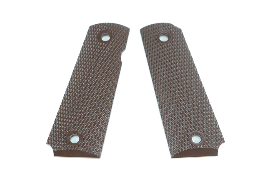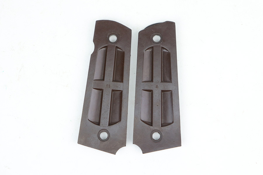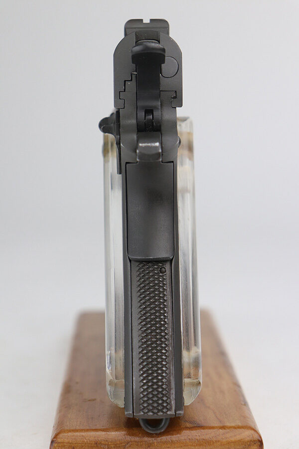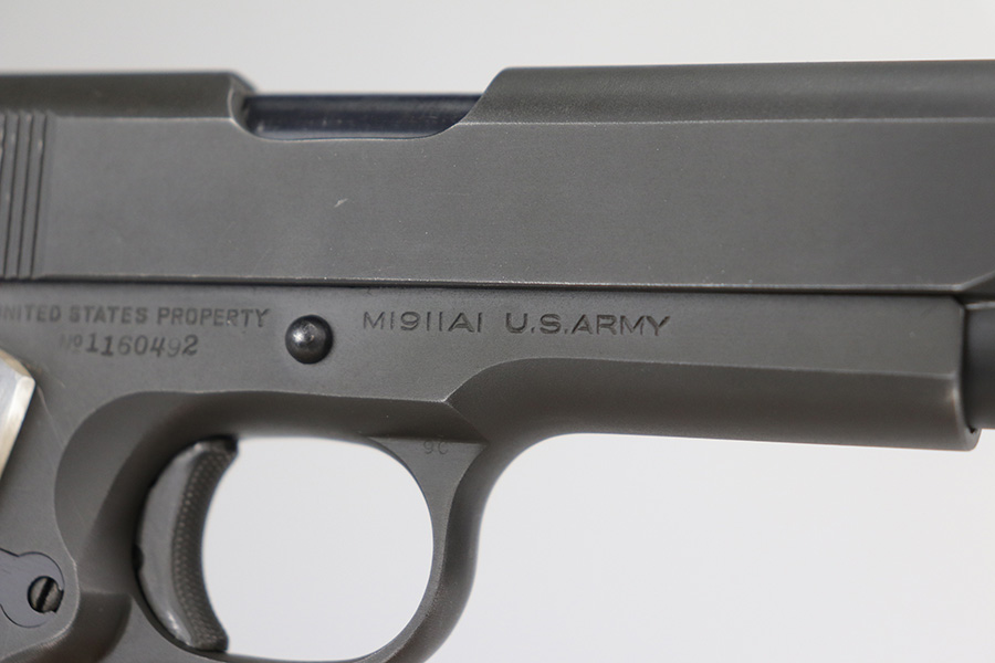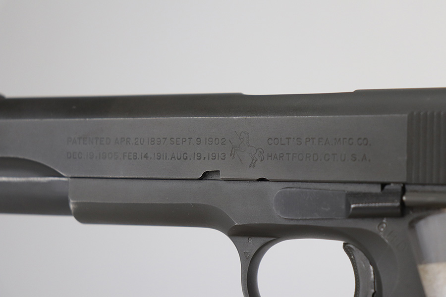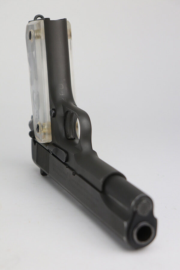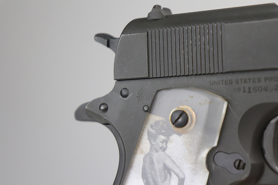 11/5/21 – This is a beautiful example of a Colt Model 1911A1 issued to the US Military in Early 1944. It is all-correct, – “United States Property” marked, has the proper cross-canon military cartouche on the right side of the frame, and has the proper “GHD” inspector initials. It has a “Colt Auto .45” barrel with a small “F” under the lug – correct for this year. This one also has a pair of original “sweetheart” acrylic grips that feature a black and white photo of a woman. Also included with this gun is a pair of original period-correct grips if you wanted to swap them out. The gun is in beautiful, near-mint condition, retaining about 99% of its original parkerized finish with just a hint of wear on some of the high edges. Unfortunately, someone very lightly scratched the initials “ATC” on the front strap just below the trigger guard. The bore has decent rifling but there is minor pin-pricking throughout.