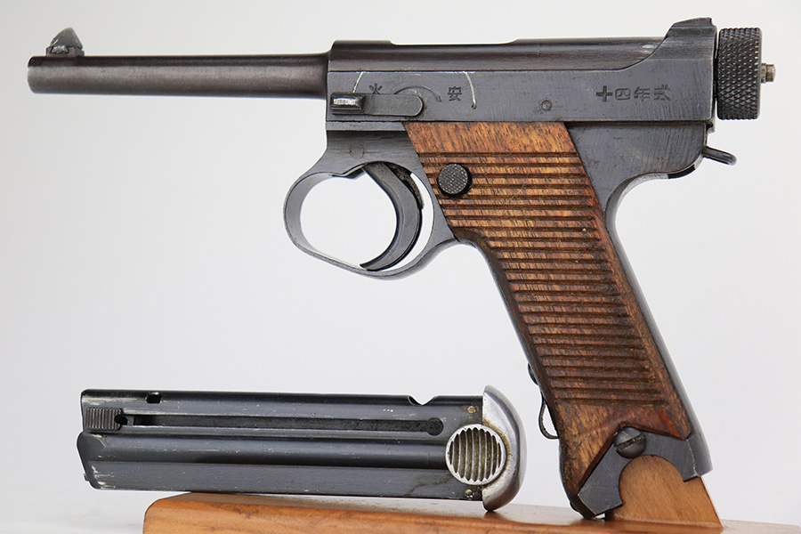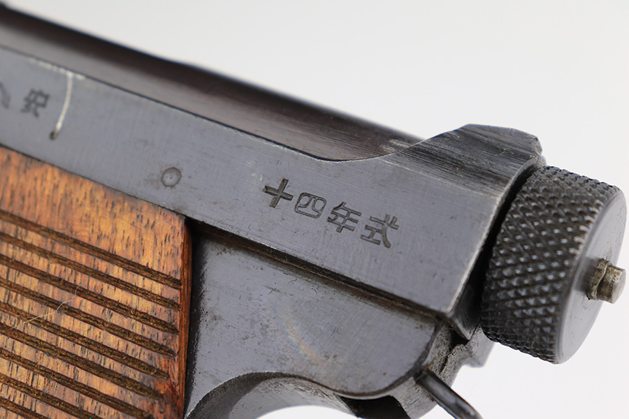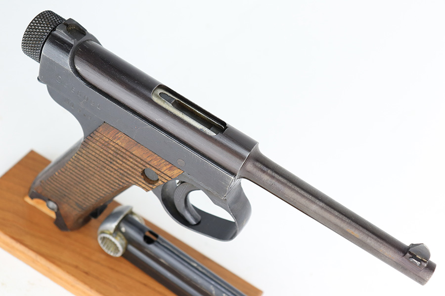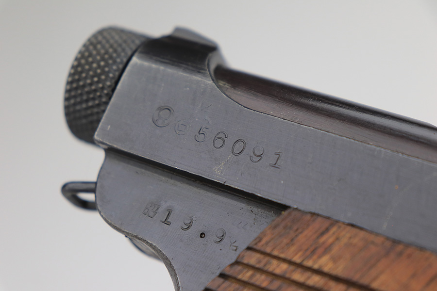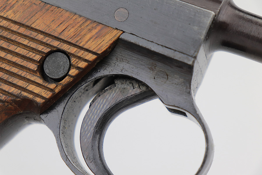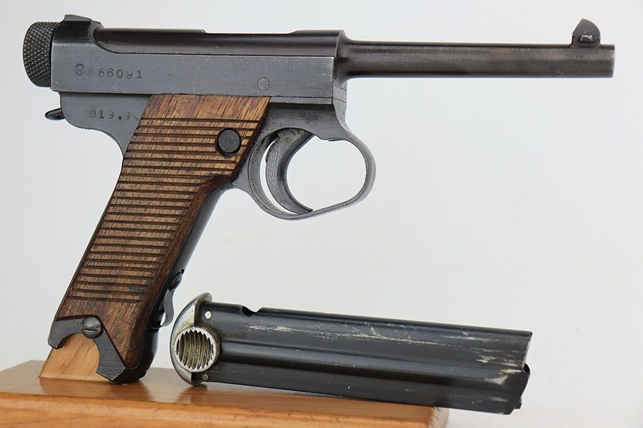 4/19/23 – This is a beautiful example of a Nambu Type 14 issued to the Japanese military in September of 1944. It is all matching and has retained nearly all of its original bluing. The finish on the slide and barrel has a slight plum color to it. There are just hints of wear on some of the high edges and a couple of very light scratches on the right side of the gun. Fitted with excellent matching-numbered grips. Comes with a period-correct but mismatched magazine. Mint bore.