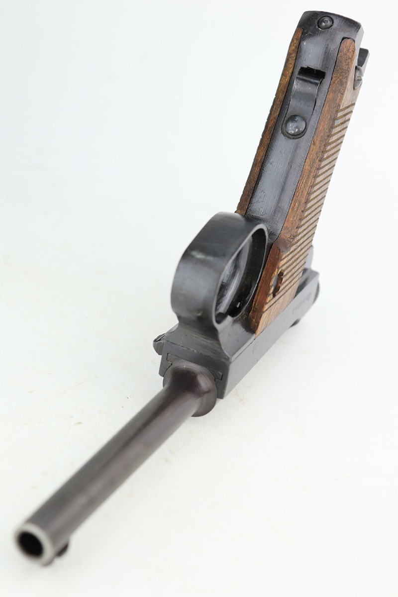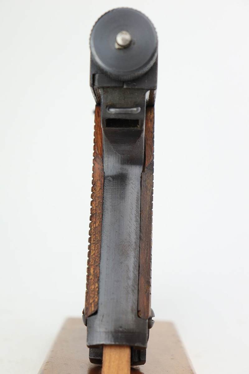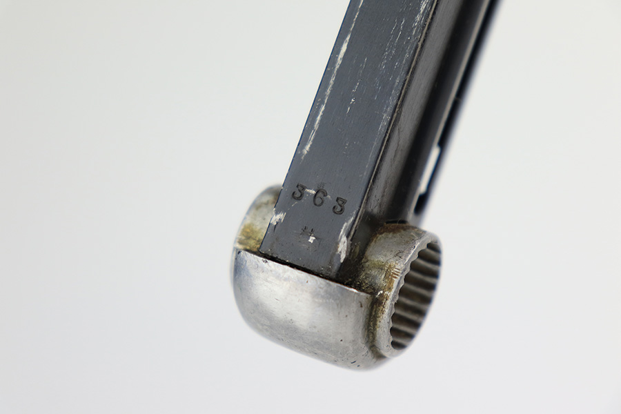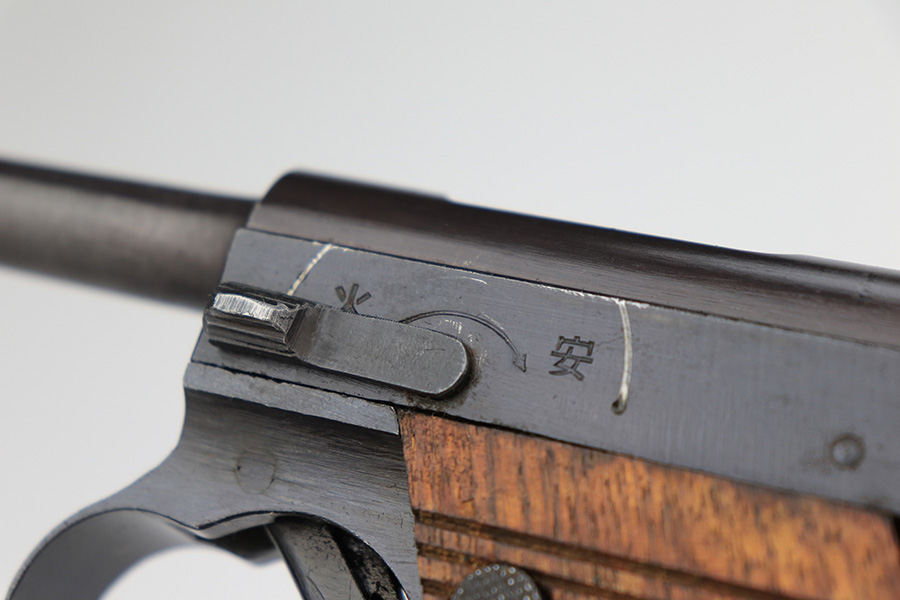 4/19/23 – This is a beautiful example of a Nambu Type 14 issued to the Japanese military in September of 1944. It is all matching and has retained nearly all of its original bluing. The finish on the slide and barrel has a slight plum color to it. There are just hints of wear on some of the high edges and a couple of very light scratches on the right side of the gun. Fitted with excellent matching-numbered grips. Comes with a period-correct but mismatched magazine. Mint bore.