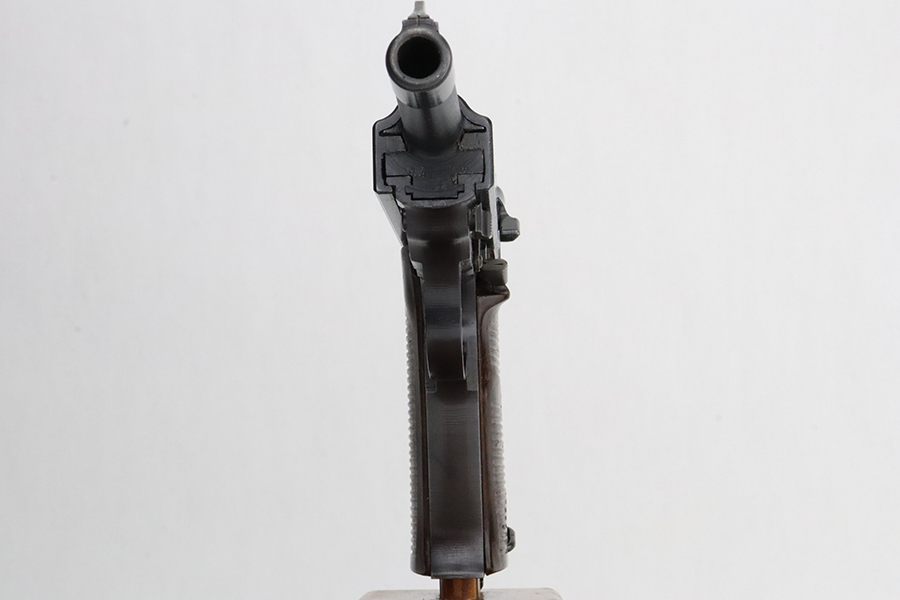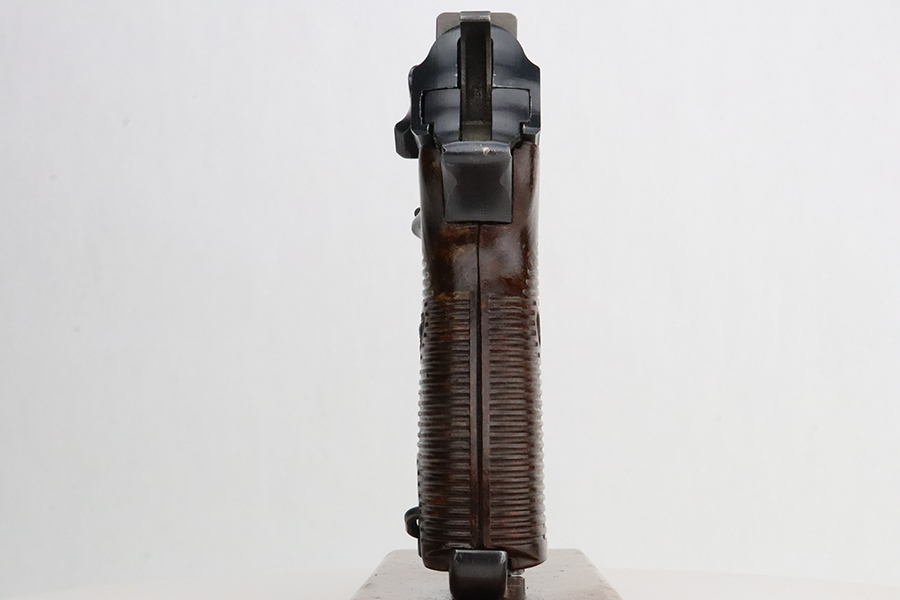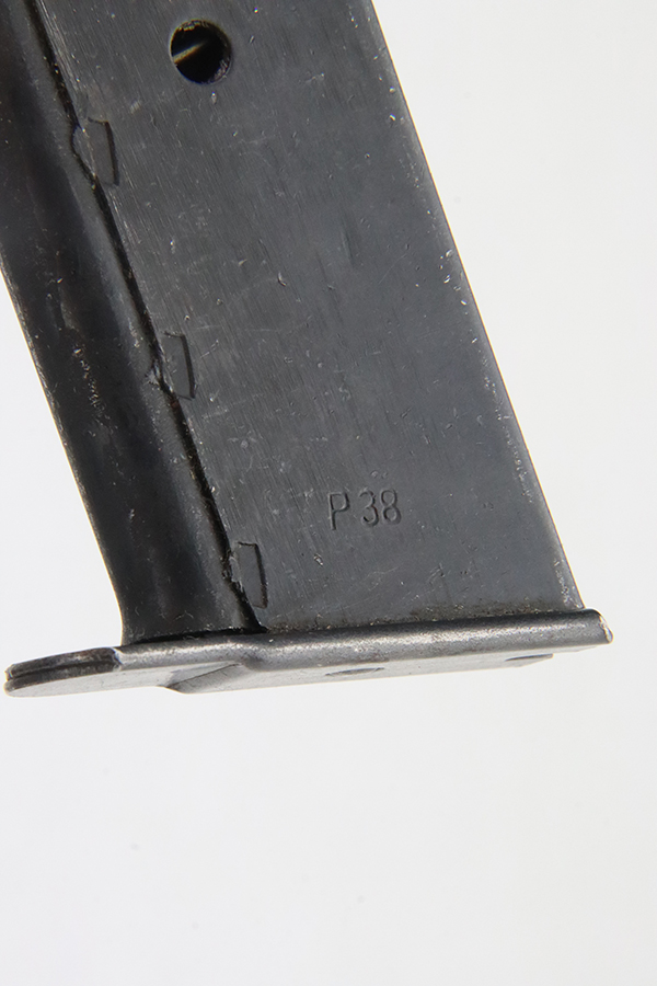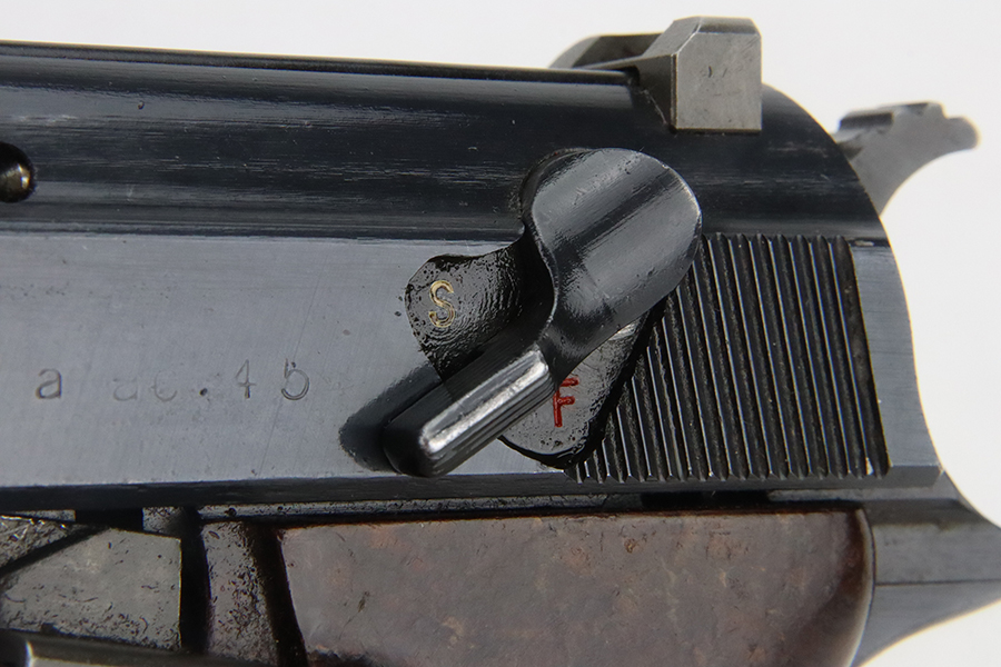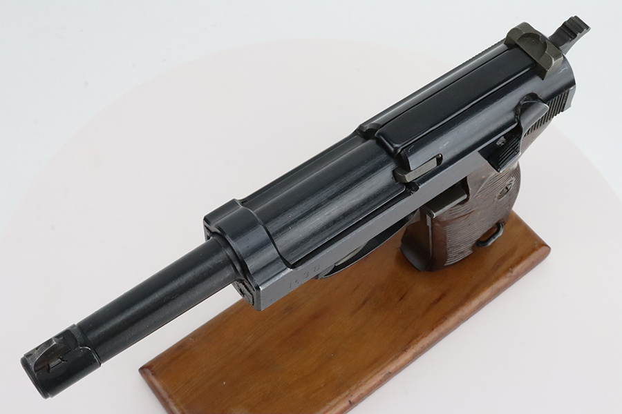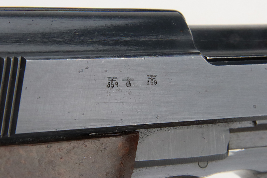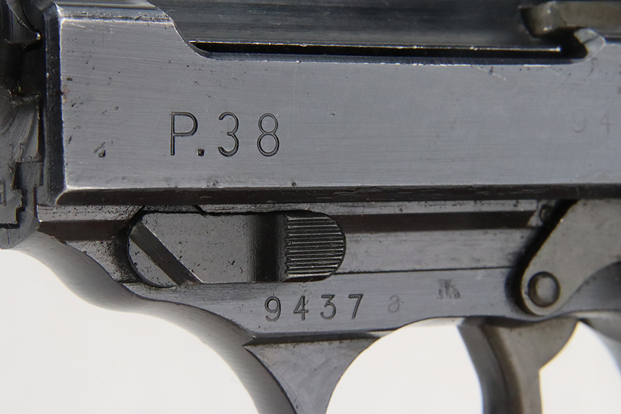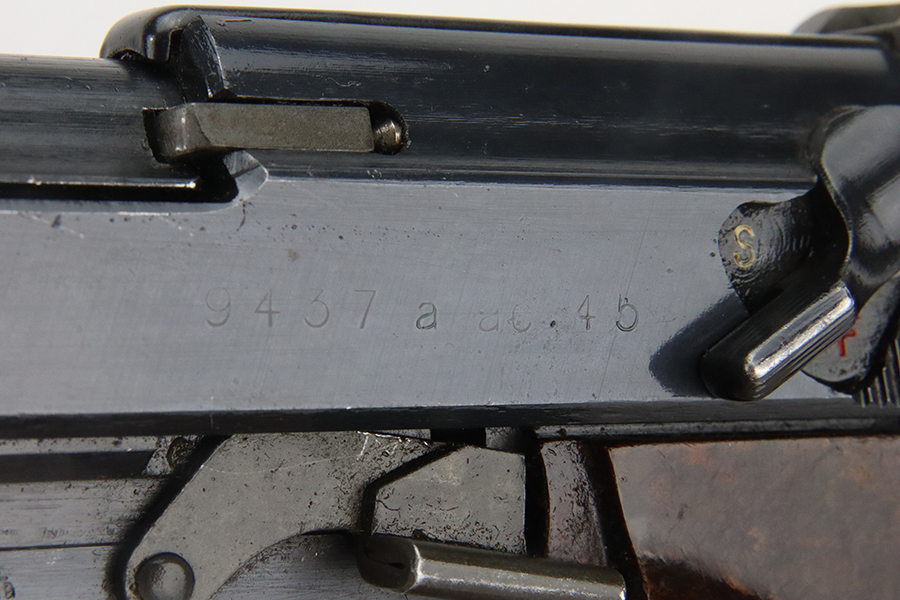 3/1/24 – This is a beautiful example of an AC 45 Walther P.38 issued to the Nazi military in 1945. All matching with the proper “Eagle 359” military acceptance proofs throughout. It has a correct late-war cog-style hammer and a mixture of blued and phosphate parts. It has retained nearly all of its original finish with almost no signs of wear. Fitted with excellent period-correct reddish bakelite grips. Comes with a period-correct “Eagle 359” marked Walther magazine. Mint bore. De-cocker is functional.