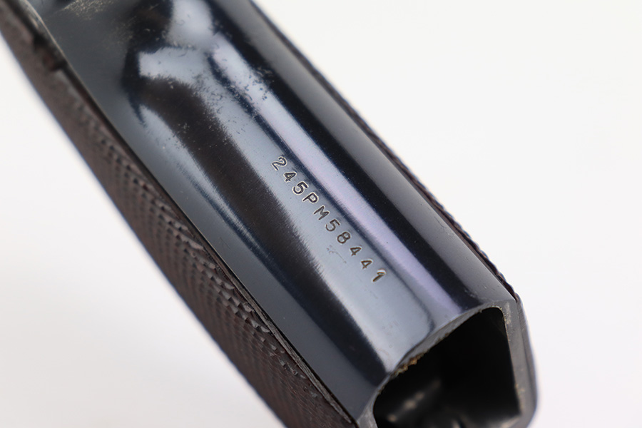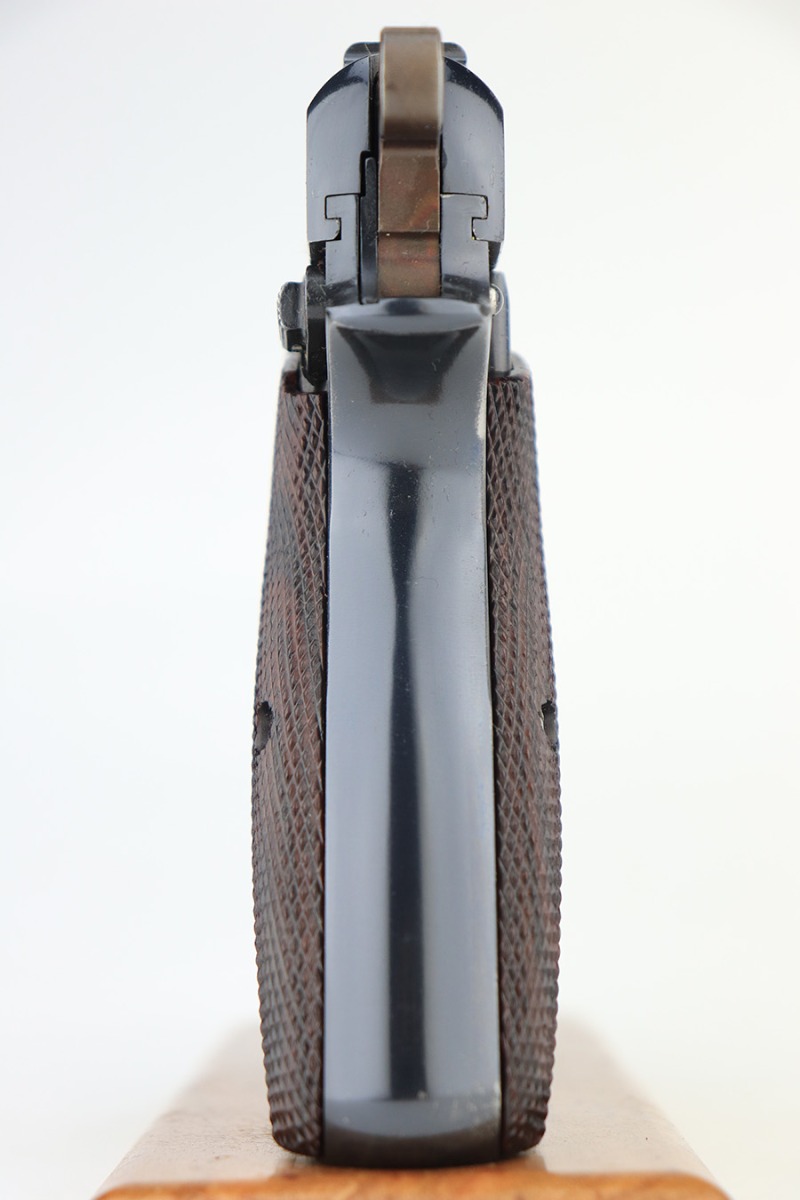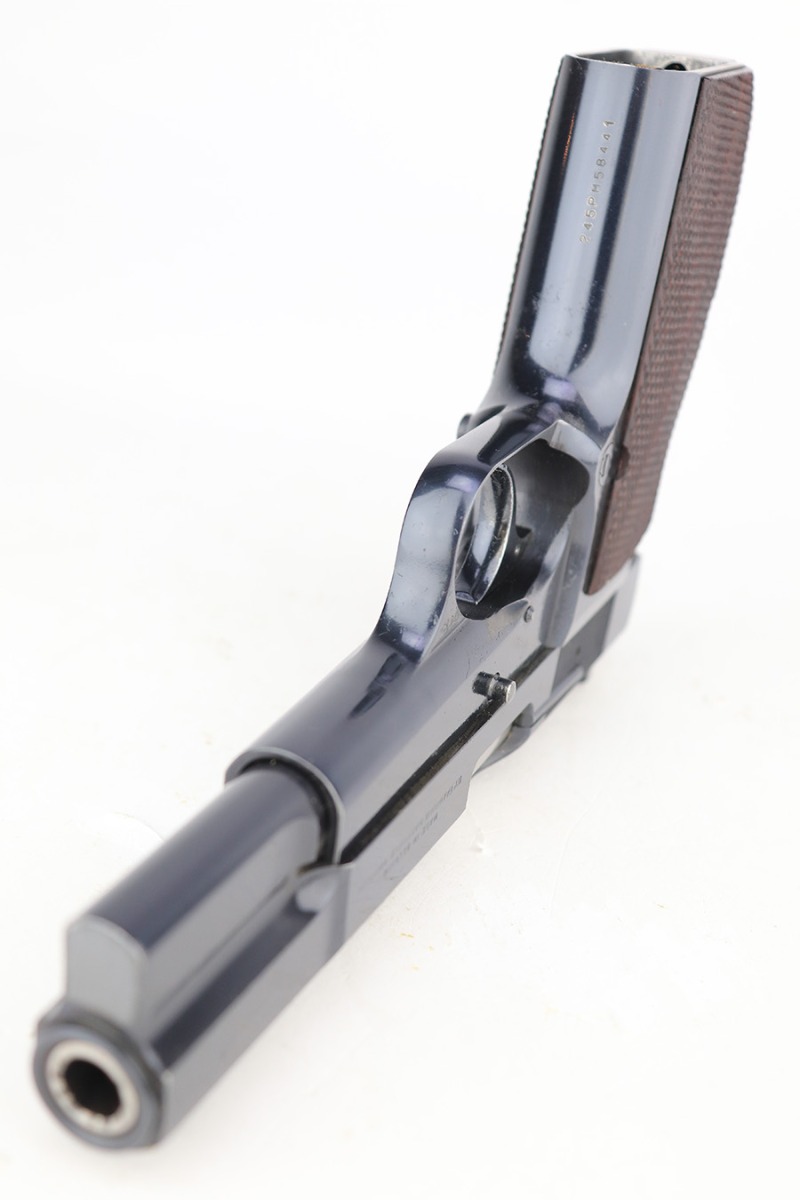 4/18/23 – This is a beautiful example of a Browning Hi Power, manufactured in 1980 in Belgium and chambered in 9mm. It comes with one proper magazine and a Browning soft case. The gun has retained virtually all of its high polish finish with just a few tiny scratches on the right side of the slide. Excellent reddish-brown plastic grips. Minty bore.
