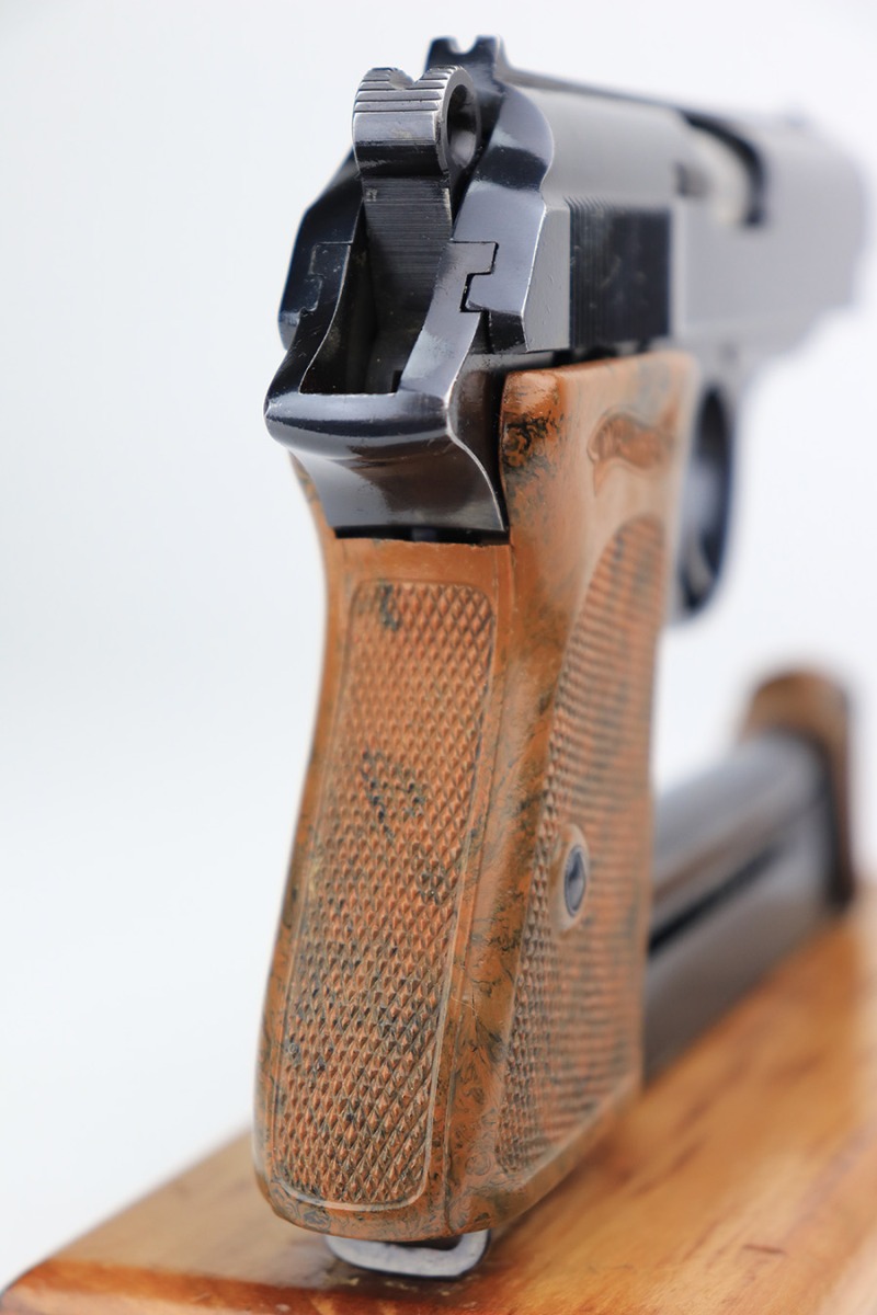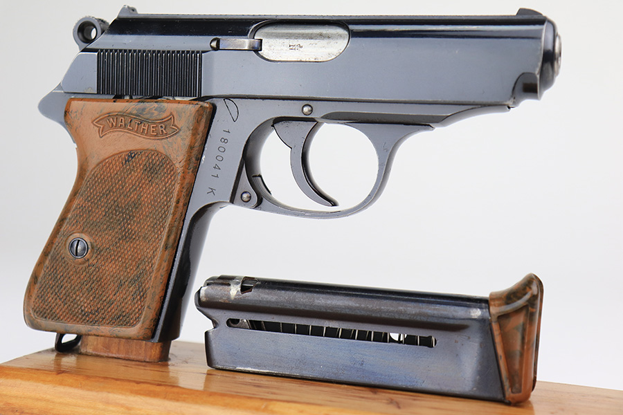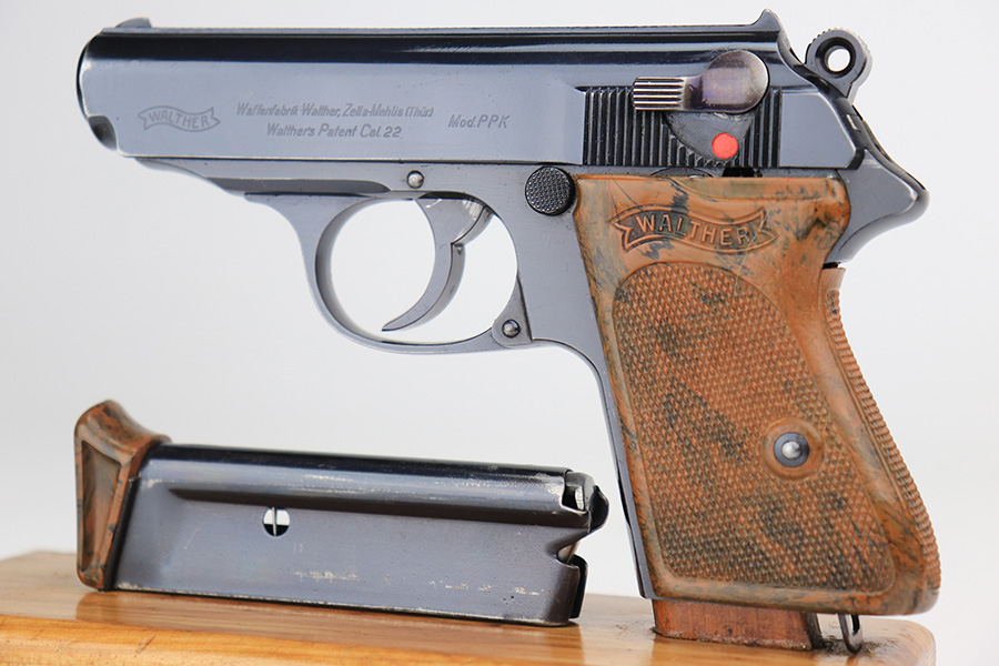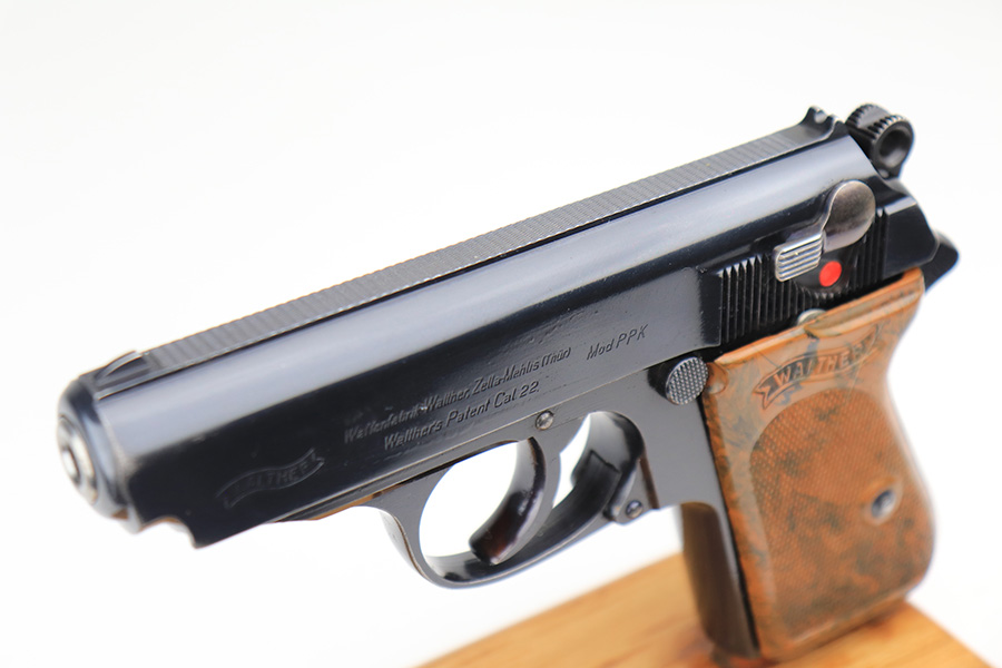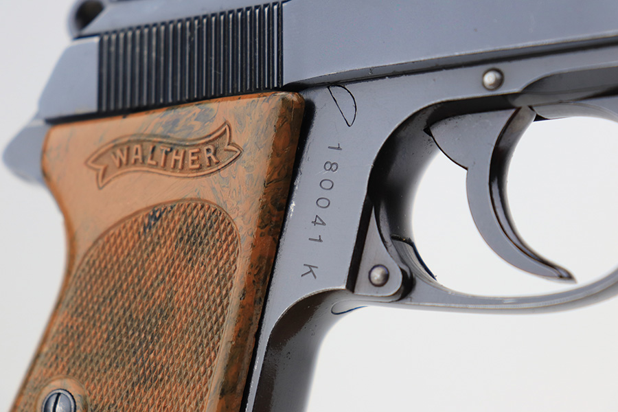 4/13/22 – This is a beautiful example of a .22 Caliber Walther PPK sold in the commercial market in 1938. It is all matching and has the proper “Crown N” commercial proofs. The gun is in near-mint condition with just a hint of wear around the muzzle and a light streak of wear on the round edge of the right side of the slide. Comes with an excellent period-correct brown Walther grip (no chips or cracks) and a period-correct .22 caliber finger extension magazine. Mint bore.