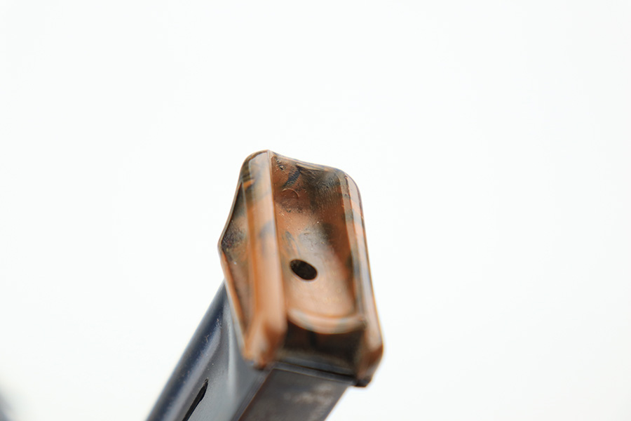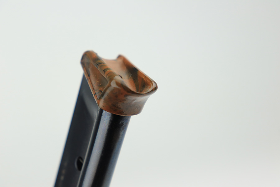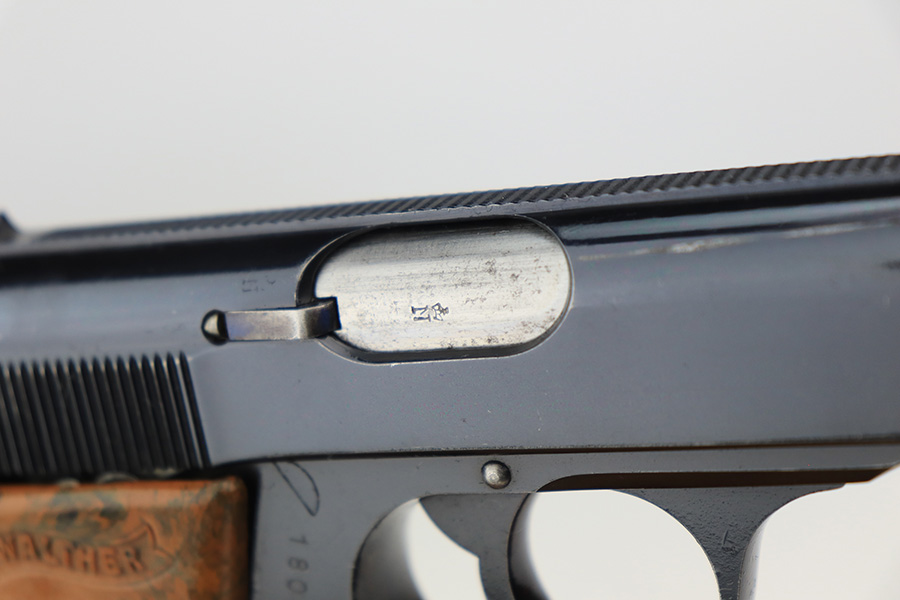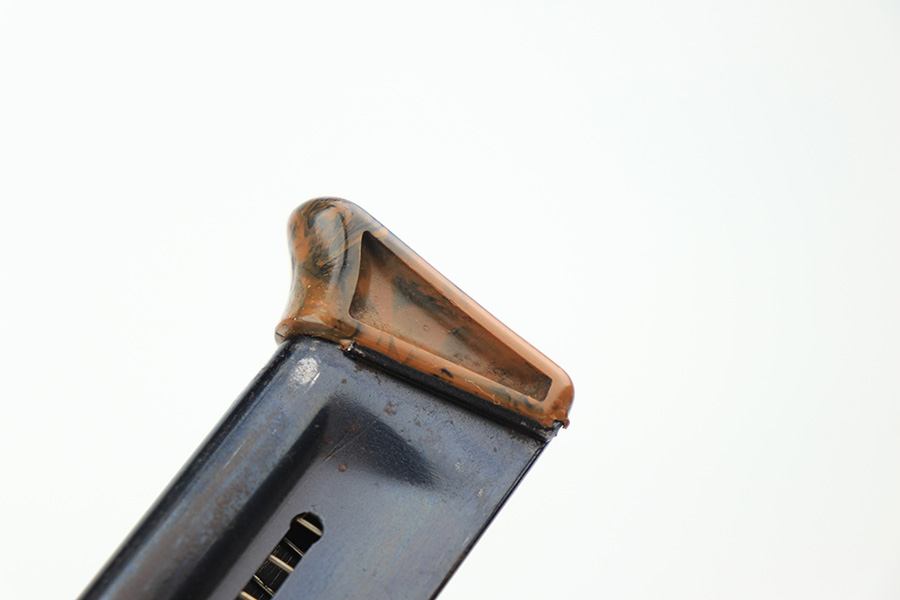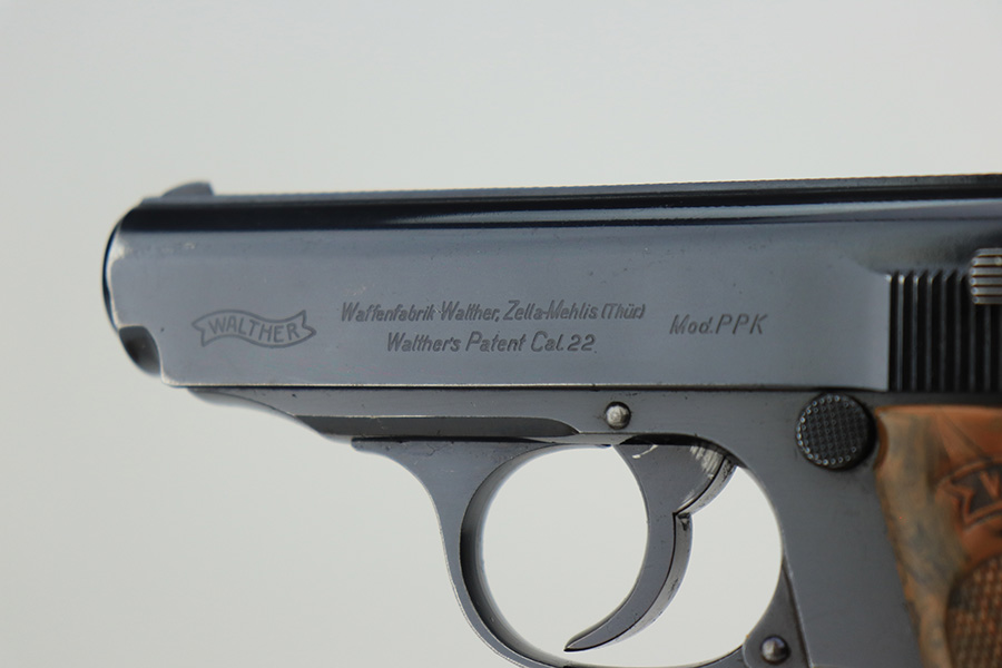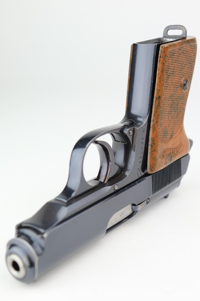 4/13/22 – This is a beautiful example of a .22 Caliber Walther PPK sold in the commercial market in 1938. It is all matching and has the proper “Crown N” commercial proofs. The gun is in near-mint condition with just a hint of wear around the muzzle and a light streak of wear on the round edge of the right side of the slide. Comes with an excellent period-correct brown Walther grip (no chips or cracks) and a period-correct .22 caliber finger extension magazine. Mint bore.