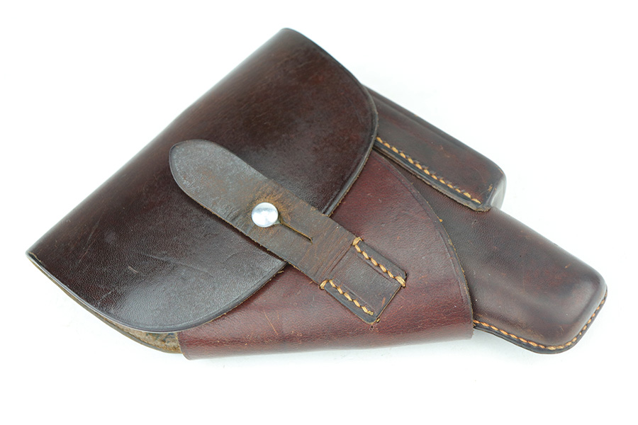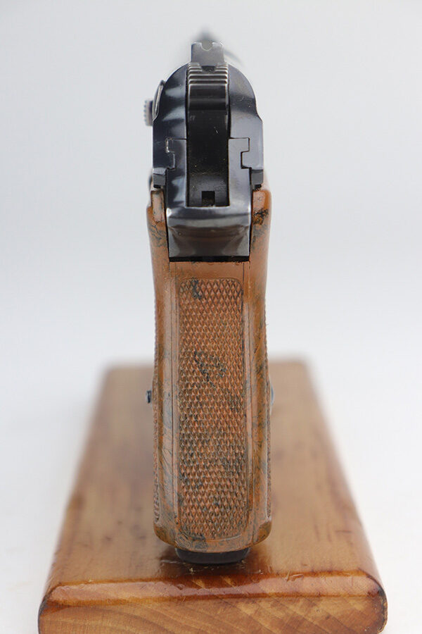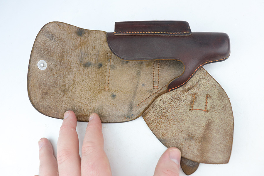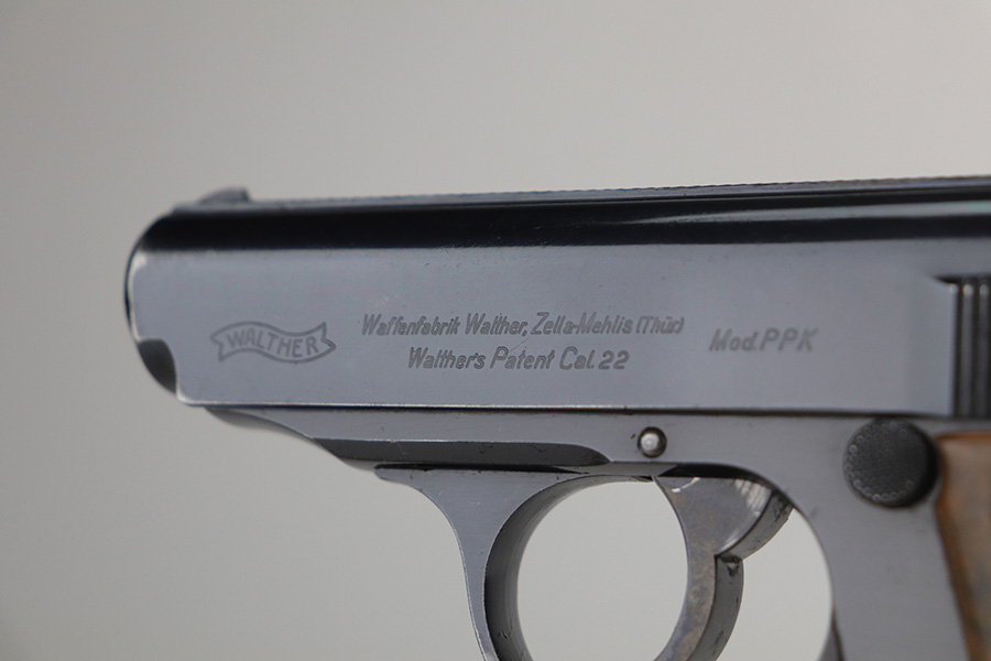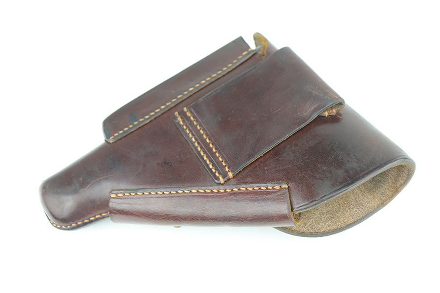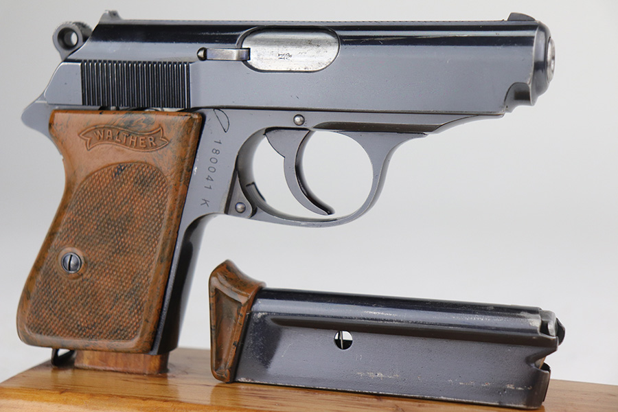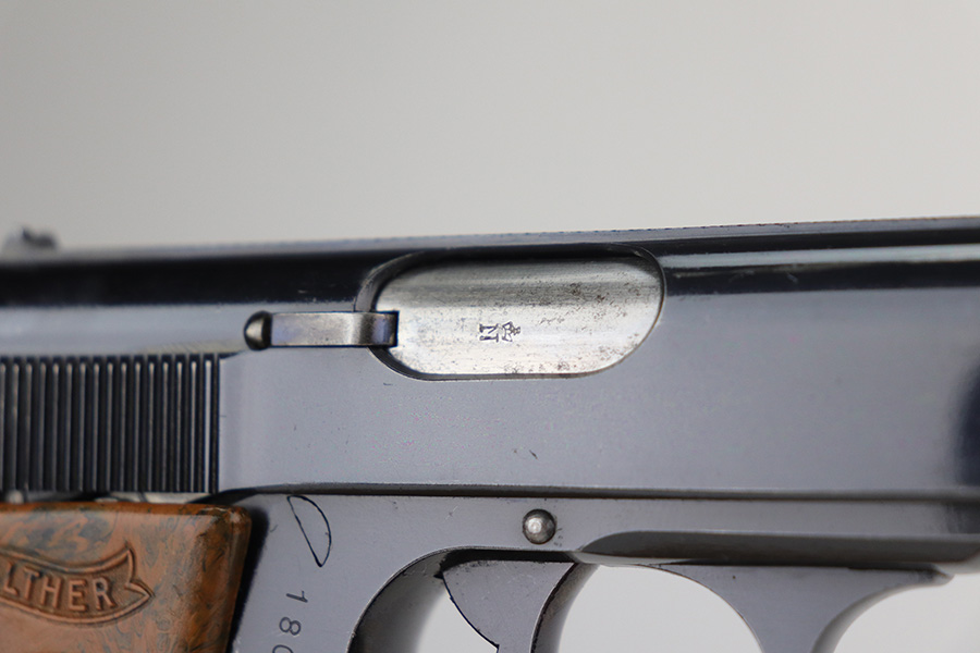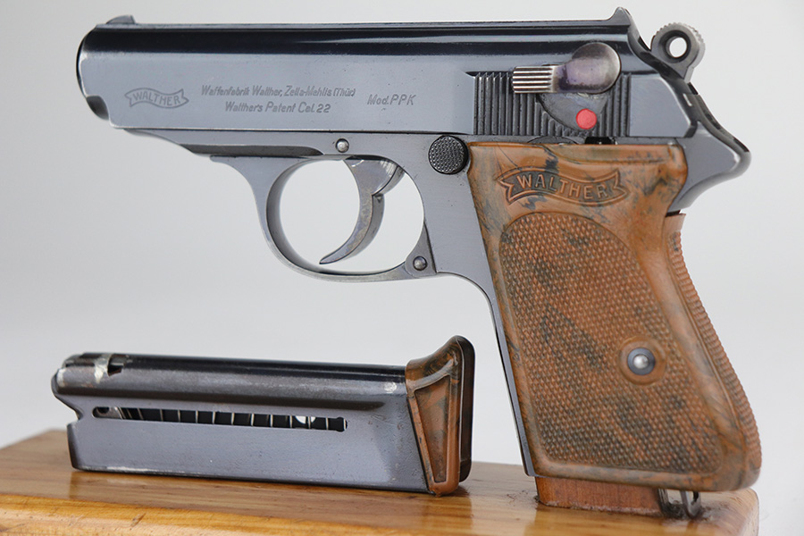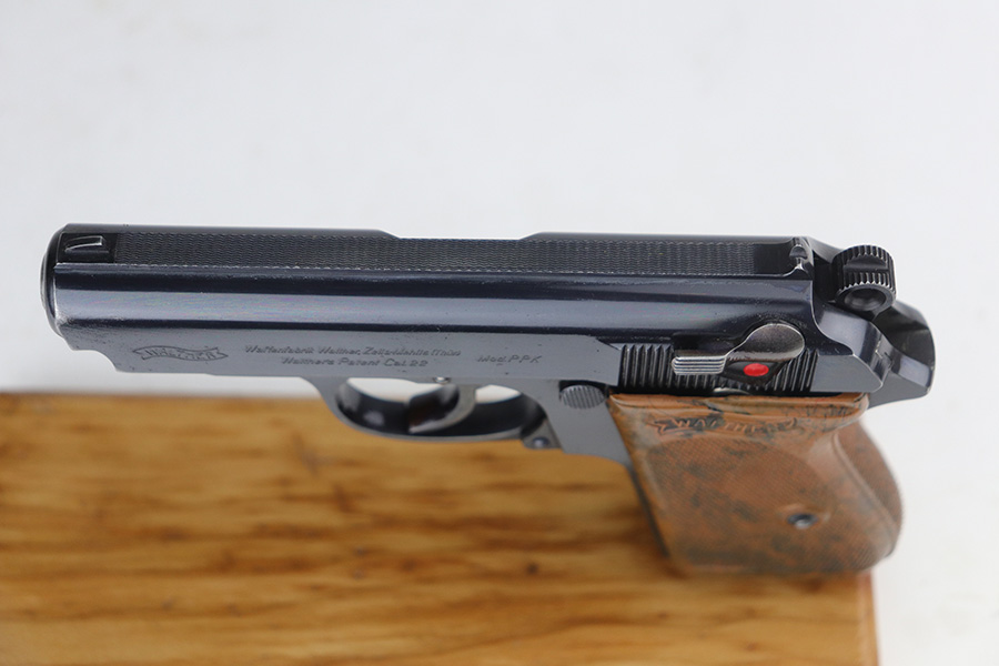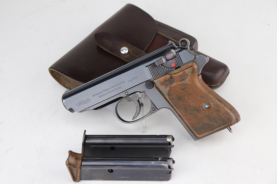 11/5/21 – This is a beautiful example of a .22 Caliber Walther PPK sold in the commercial market in 1938. It is all matching and has the proper “Crown N” commercial proofs. It comes as a rig with a near-mint leading-edge Akah brown leather holster, one period-correct finger extension magazine, and one flat bottom magazine (likely post-war). The gun is in near-mint condition with just a hint of wear around the muzzle and a light streak of wear on the round edge of the right side of the slide. Comes with an excellent period-correct brown Walther grip. Mint bore.