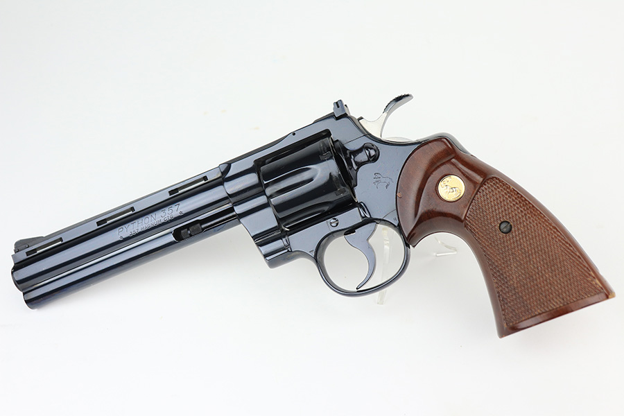 6/28/22 – This is a beautiful example of a Colt Python revolver manufactured in 1979. It is chambered in .357 Magnum and has a 6″ barrel. The gun is in mint condition, retaining virtually all of its original Colt bluing. There is just barely a hint of a roll mark on the cylinder and a few tiny handling marks here and there. Comes with excellent wood Colt grips – just a few tiny handling marks and scuffs here and there. Mint bore. The cylinder is tight, and the action is extremely smooth.