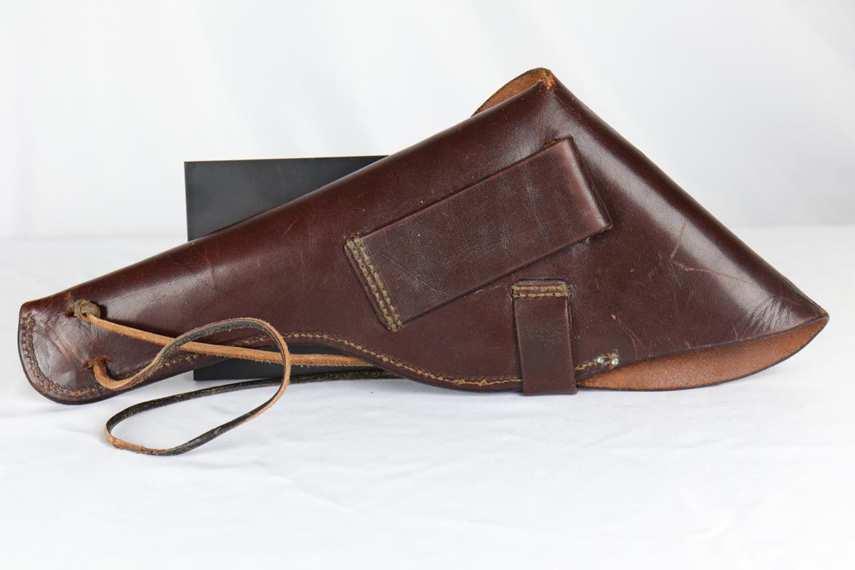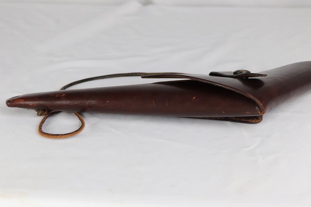 3/21/18 – This is a beautiful brown leather holster made by the famous Abercrombie & Fitch company of New York in the late ’20s to early ’30s. It is in near mint condition with a sharp A&F marking in the leather and an A&F logo on the snap. Appears to be made for a small frame Colt or S&W revolver with a barrel length of 6 inches. It could probably house any other small frame revolver as well. Please see photos and feel free to ask any questions!