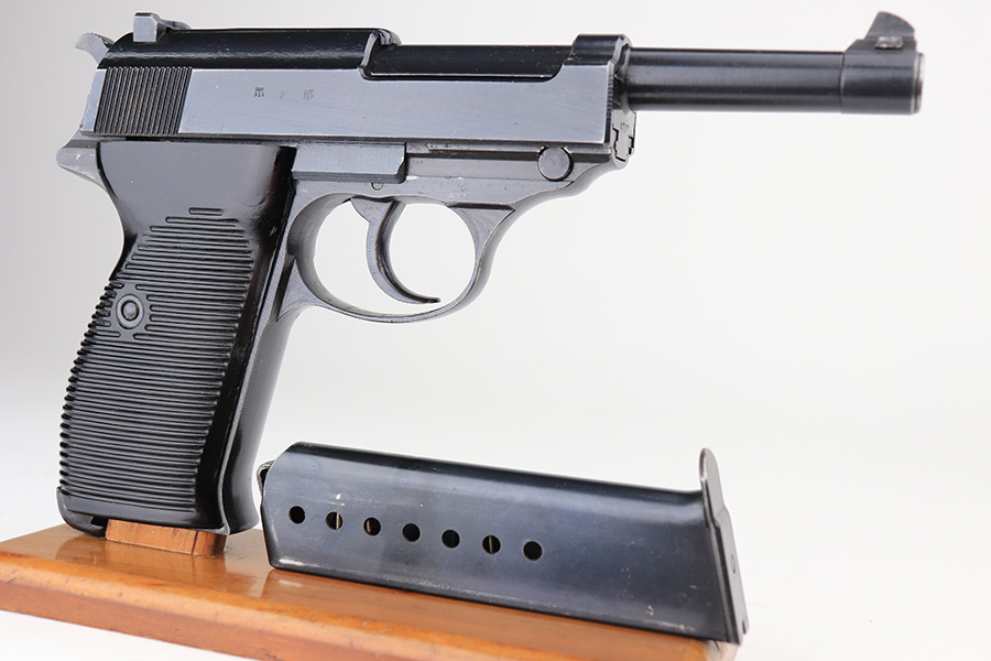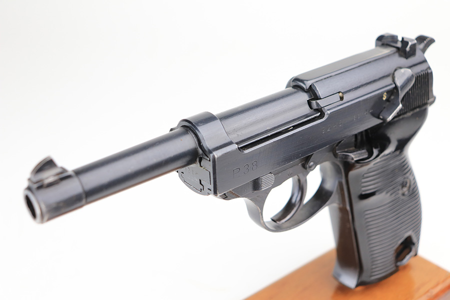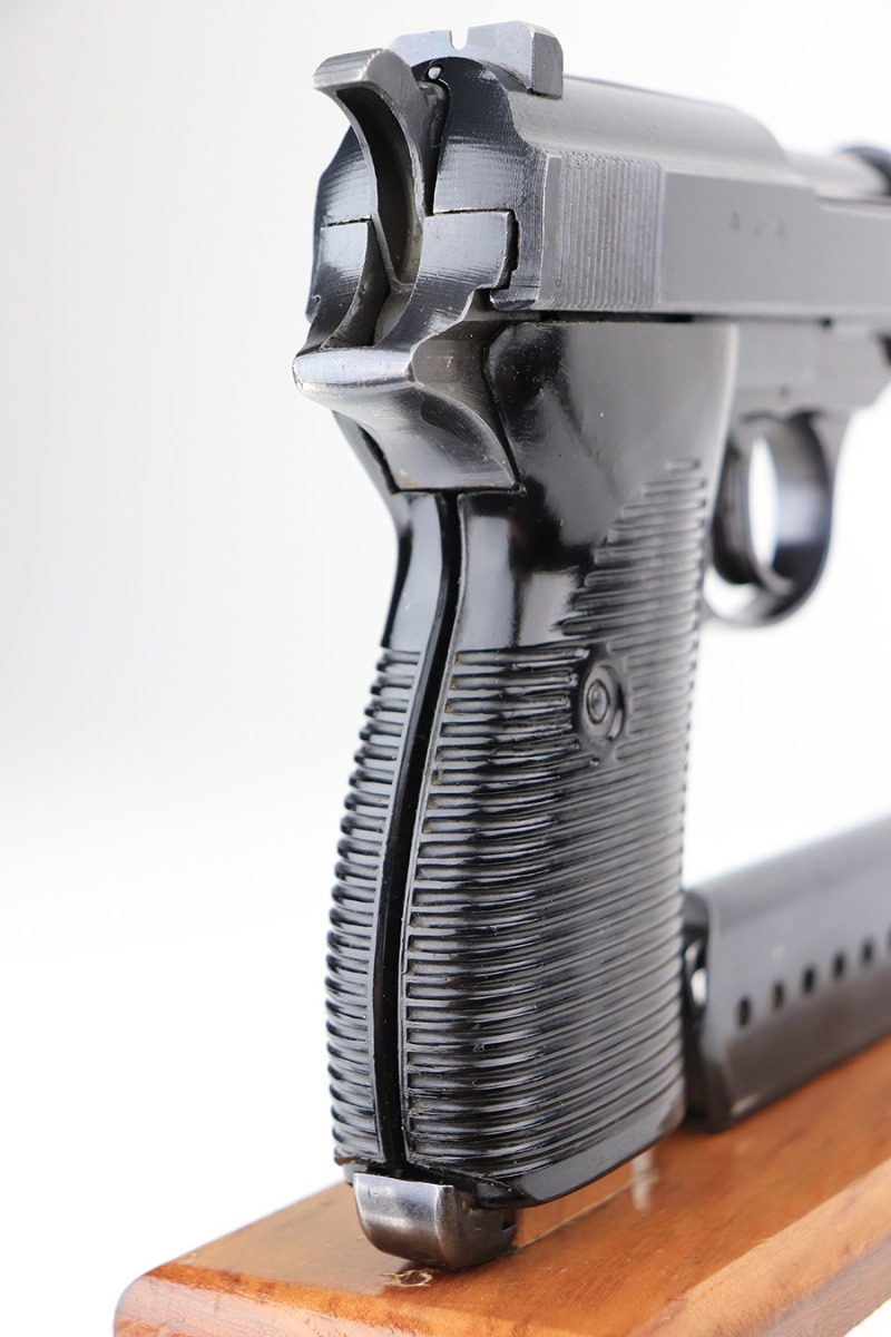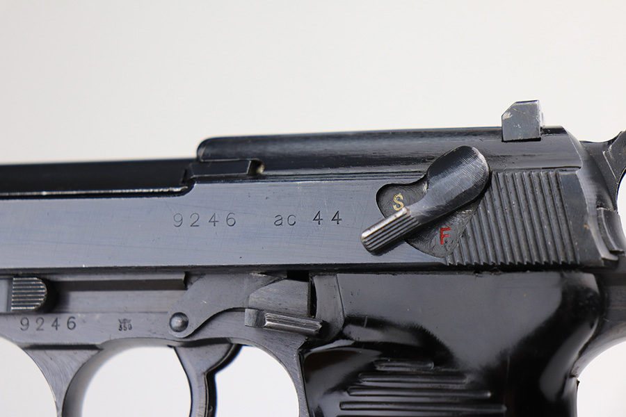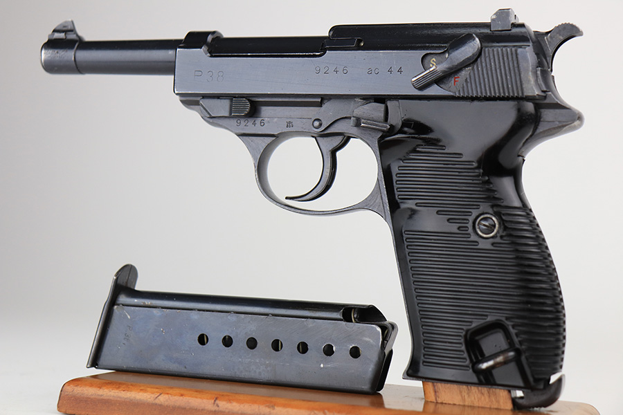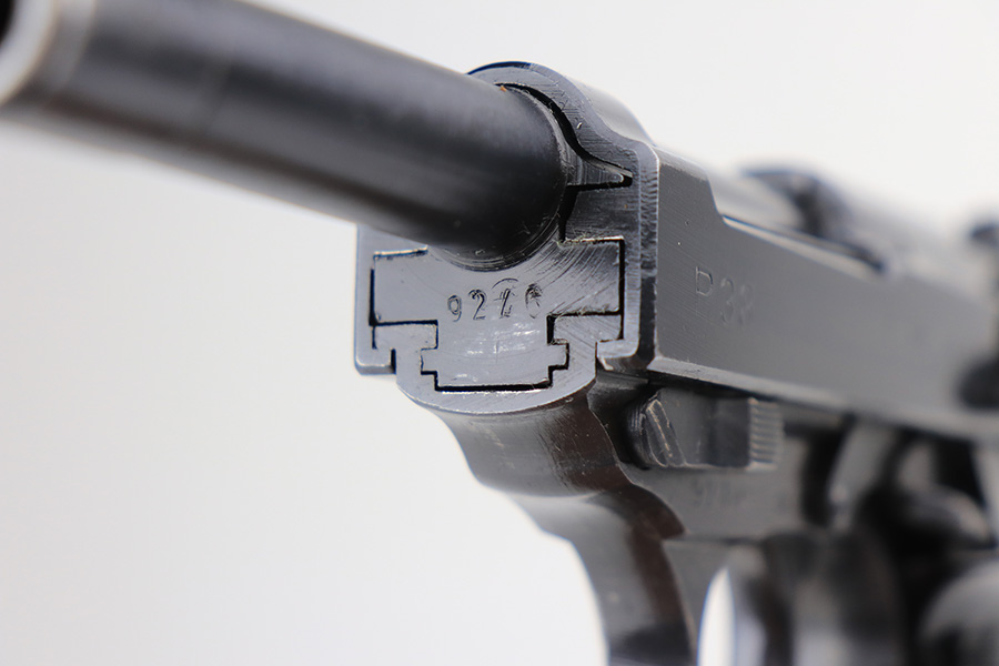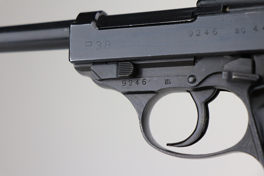 2/22/22 – This is a beautiful example of a Walther P.38 issued to the Nazi military in 1944. The gun is all matching and has the proper “Eagle 359” Nazi military acceptance proofs throughout. The gun comes as a rig with a minty 1944 dated holster, one un-marked period-correct magazine, and one period-correct Walther magazine. The gun has retained nearly all of its original finish. There are just hints of wear on some of the high edges and around the muzzle. One small spot of wear on the top plate and a few tiny handling marks on the front strap. Comes with nice black bakelite grips that have been cut down. Stone mint bore. The de-cocker sticks a little bit but is functional.