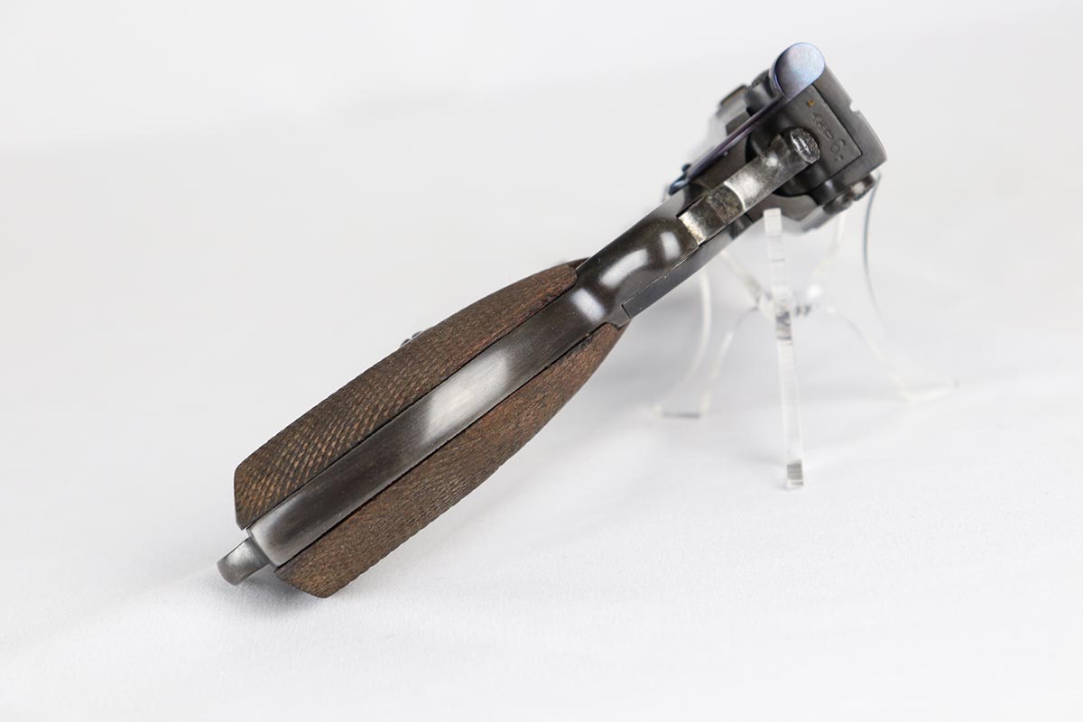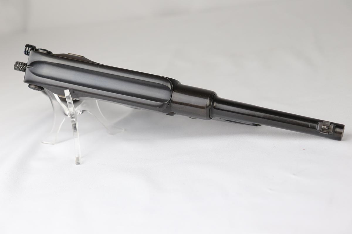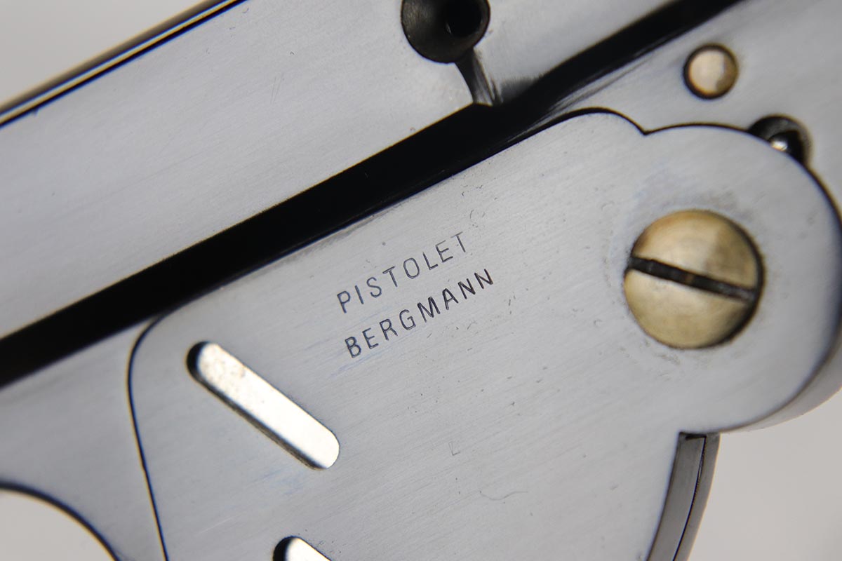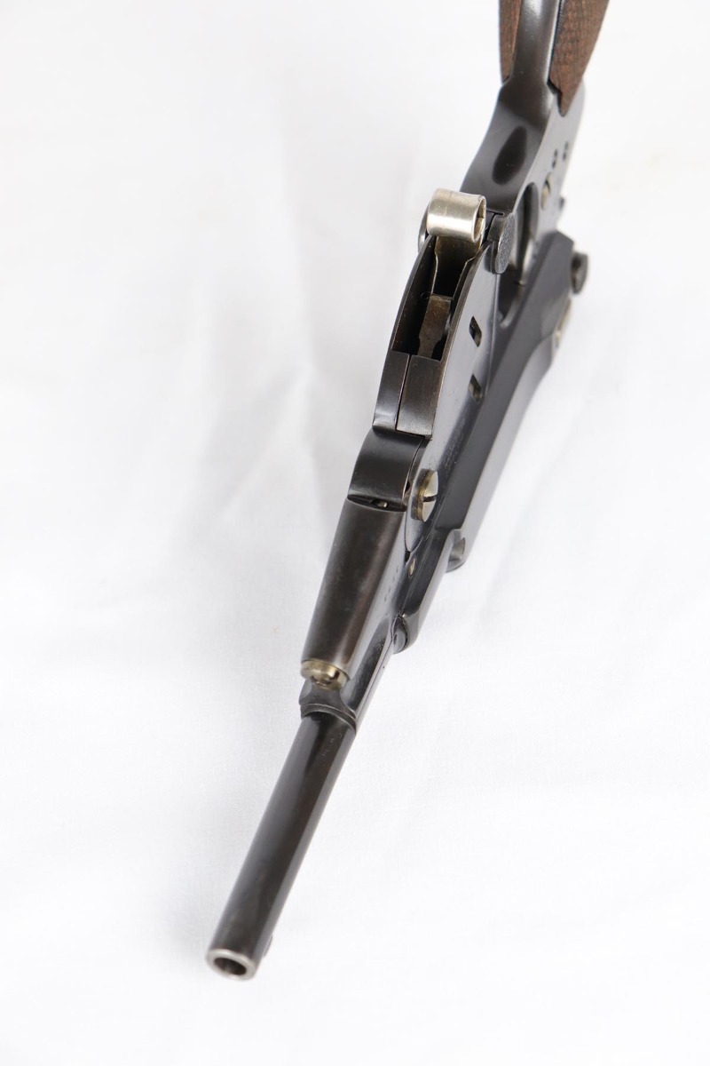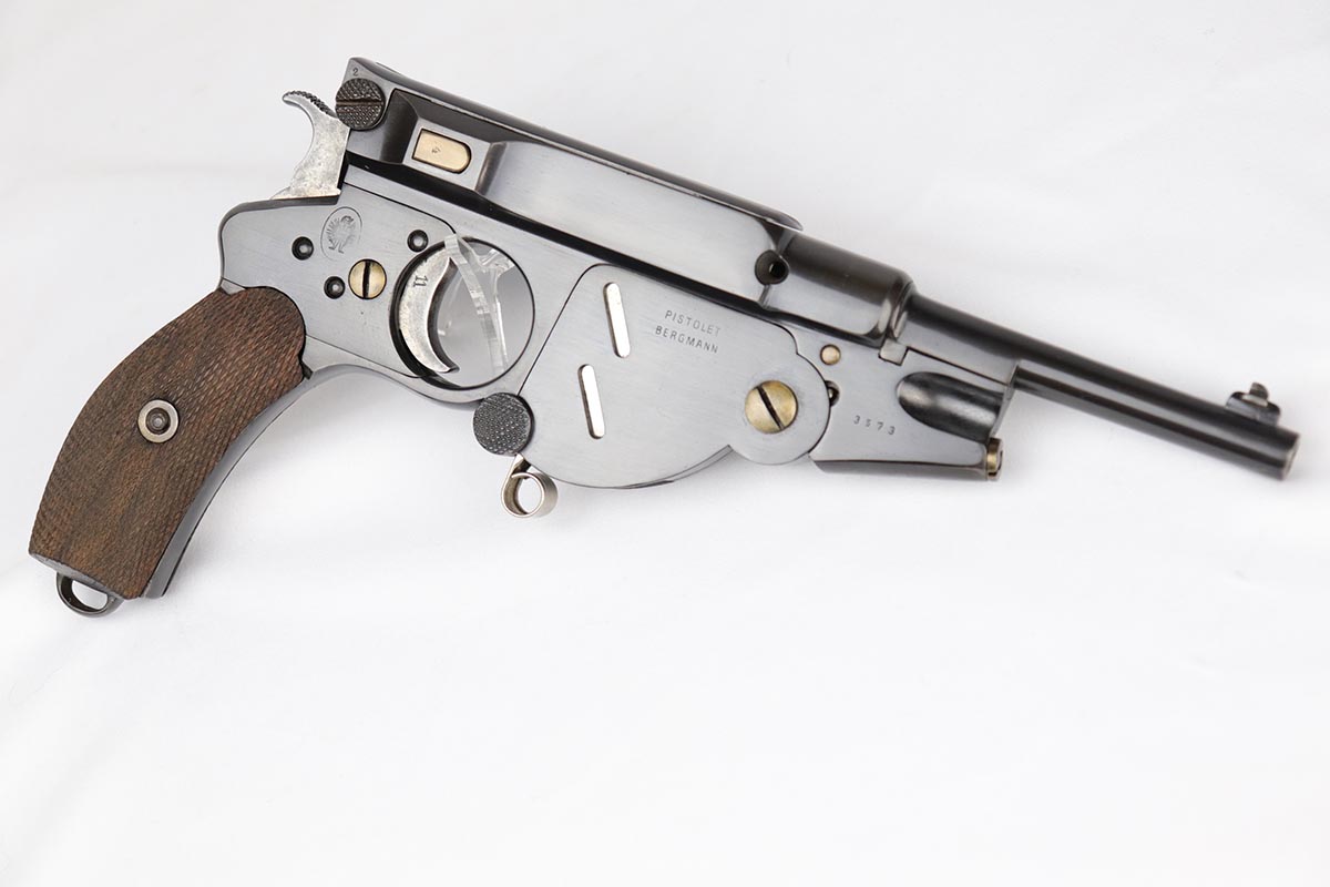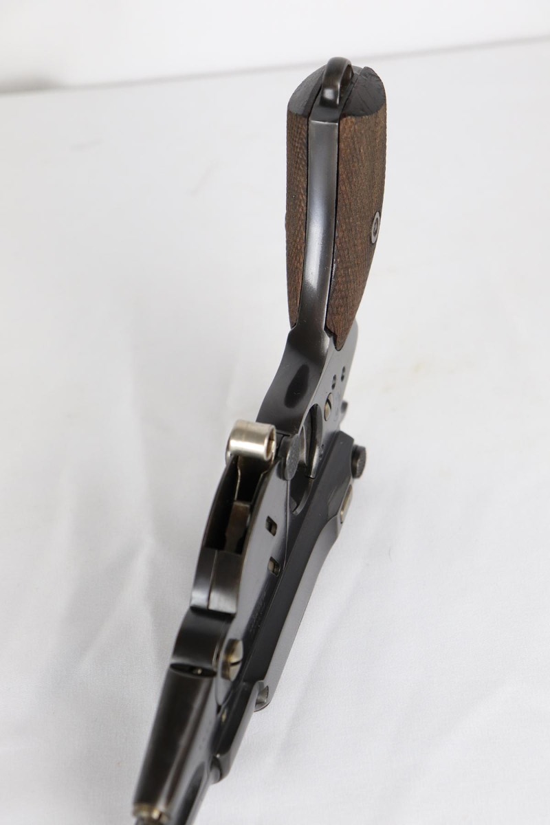 6/8/18 – This is a fantastic example of an antique Bergmann No.3, one of the earliest semi-autos made, a few years before Mauser C96 and the Luger pistols were developed.  Unfortunately, Bergmann guns were not a commercial success, and as a result very few were made in a couple of different calibers. The bluing rates near 100% but is an excellent restoration, nearly indiscernible from the original. Bore shows some minor freckling throughout.  A very rare “monkey tail” magazine charger is present as well. Sharp proof marks throughout.  Antique item so no license required.