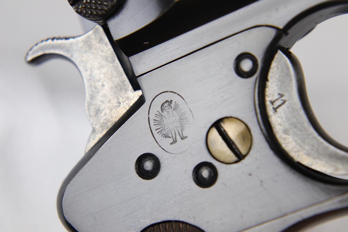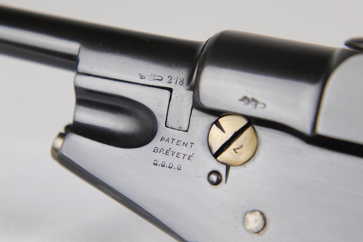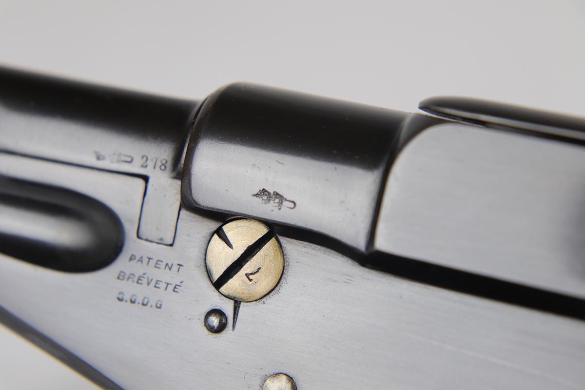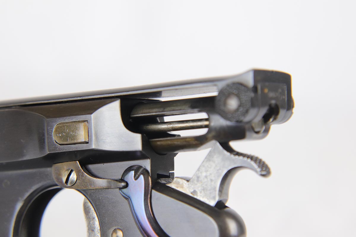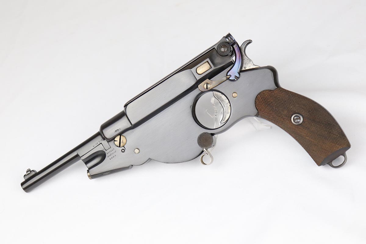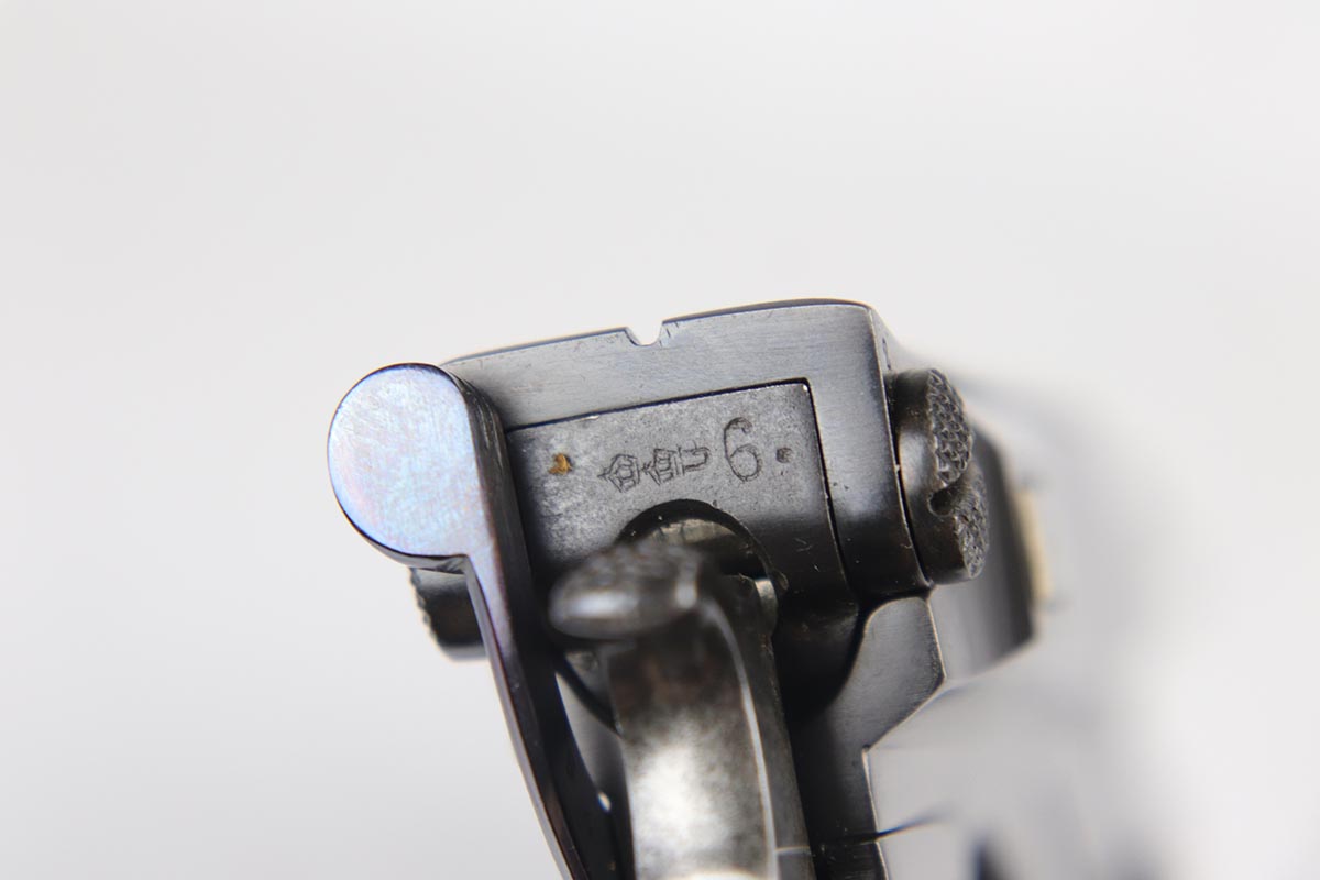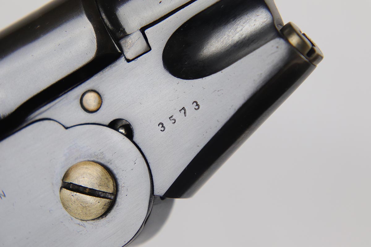6/8/18 – This is a fantastic example of an antique Bergmann No.3, one of the earliest semi-autos made, a few years before Mauser C96 and the Luger pistols were developed.  Unfortunately, Bergmann guns were not a commercial success, and as a result very few were made in a couple of different calibers. The bluing rates near 100% but is an excellent restoration, nearly indiscernible from the original. Bore shows some minor freckling throughout.  A very rare “monkey tail” magazine charger is present as well. Sharp proof marks throughout.  Antique item so no license required.