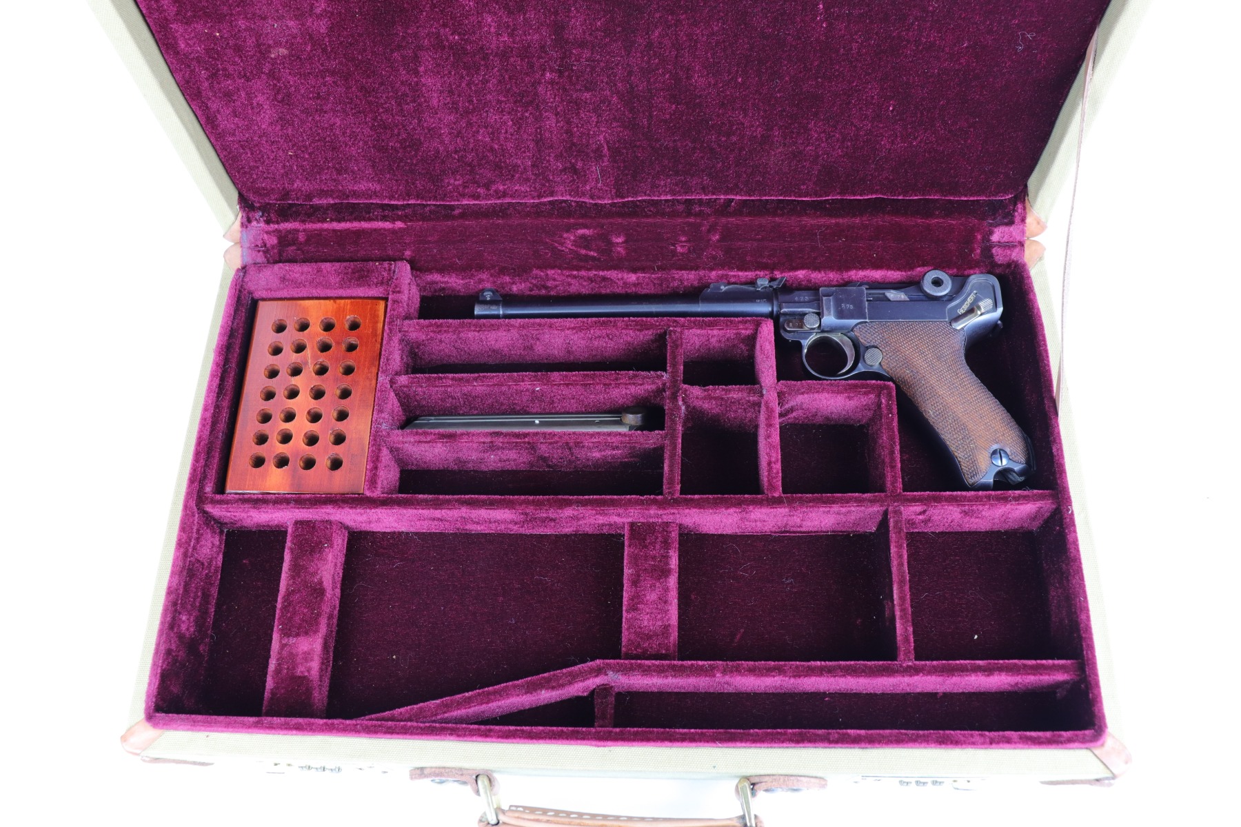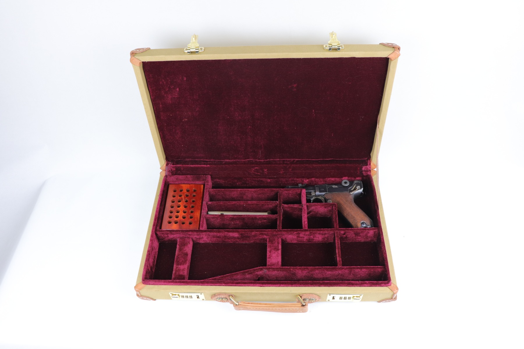 5/1/20 – This is a beautifully-crafted and sturdy Presentation/Travel Case for a Artillery Luger P.08. The structure of the box has a very sturdy construction. The exterior is coated in a tan pool table felt. The corners are covered in leather pads. The entire inside of the case is wrapped in burgandy felt. There are slots for the gun, three magazines, a cleaning rod, and the artillery stock. There are also holes to hold bullets. The brass fittings on the outside of the case lock for protection. The case is in excellent condition. It is great for travel or just to display in your man cave.