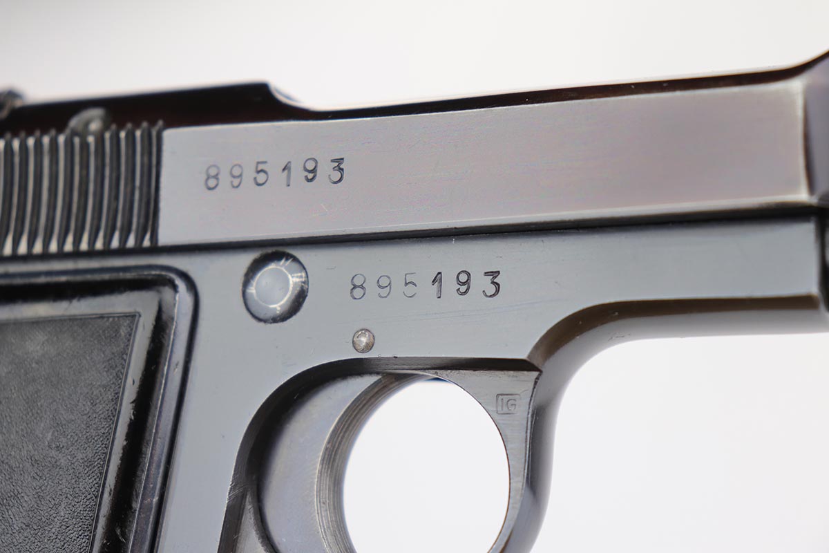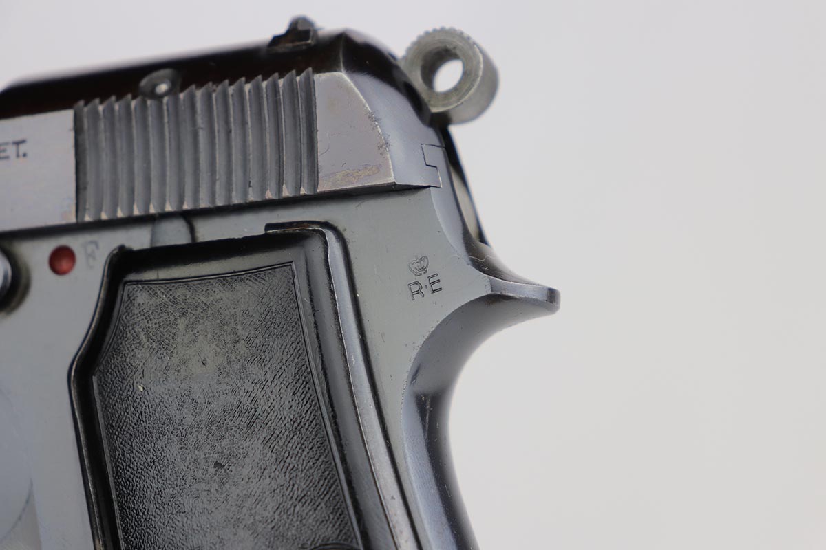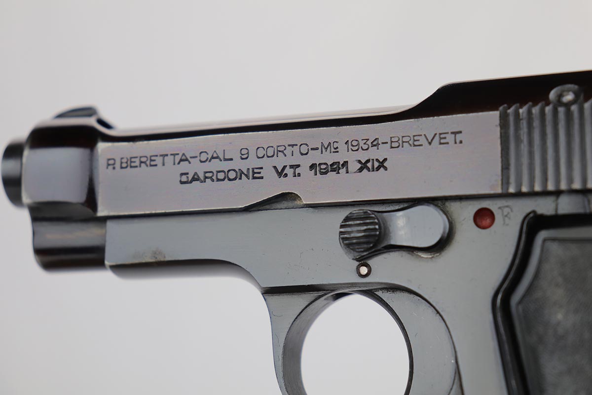 10/2/19 – This is a beautiful Beretta M1934 that was manufactured in 1941 and issued to the Italian Army. It has about 97% of the original, high-polish finish remaining. There’s minor edge wear on the slide and bottom of the back strap, and a small spot of freckling on the left side of the frame. The slide also has a nice plum hue to it. Frame is marked with Crown over ‘RE’ on left side frame, and ‘IVU’ in oval on the right. Excellent grips and minty bore. Correct magazine.
