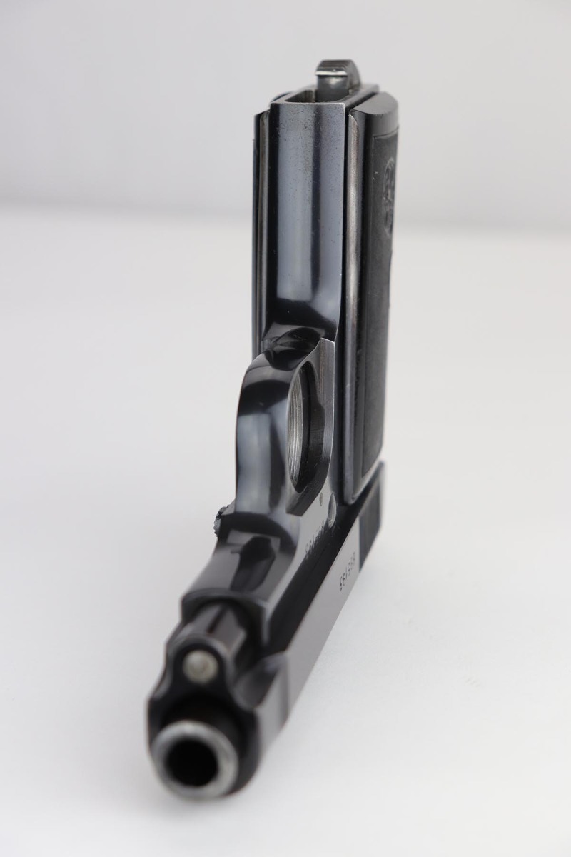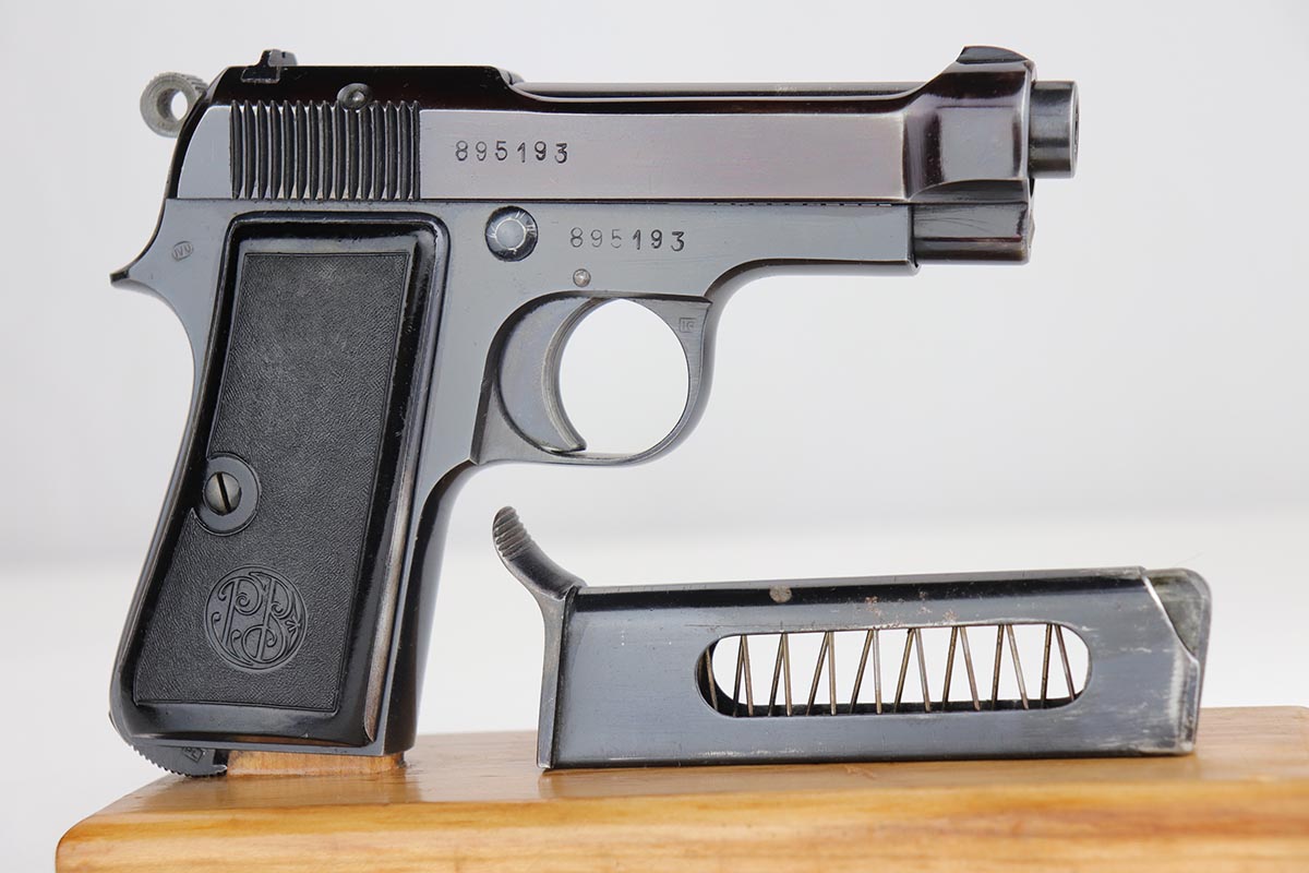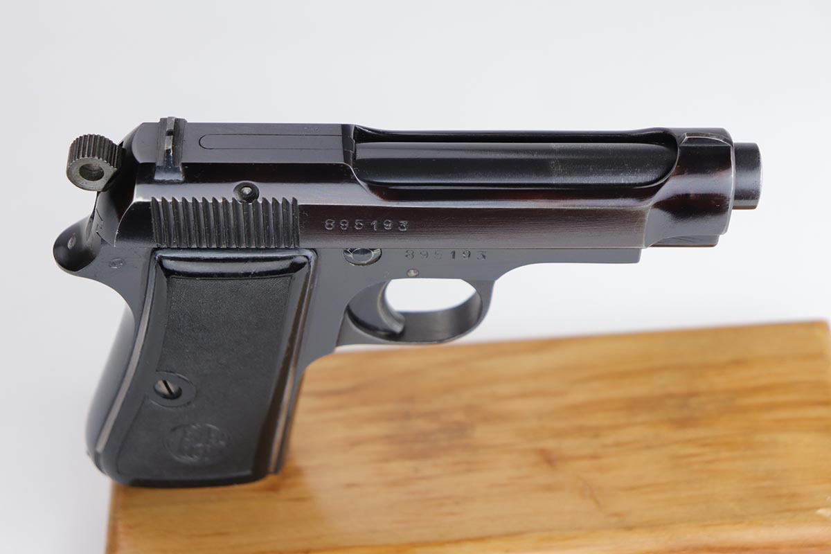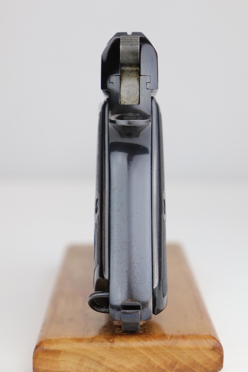10/2/19 – This is a beautiful Beretta M1934 that was manufactured in 1941 and issued to the Italian Army. It has about 97% of the original, high-polish finish remaining. There’s minor edge wear on the slide and bottom of the back strap, and a small spot of freckling on the left side of the frame. The slide also has a nice plum hue to it. Frame is marked with Crown over ‘RE’ on left side frame, and ‘IVU’ in oval on the right. Excellent grips and minty bore. Correct magazine.