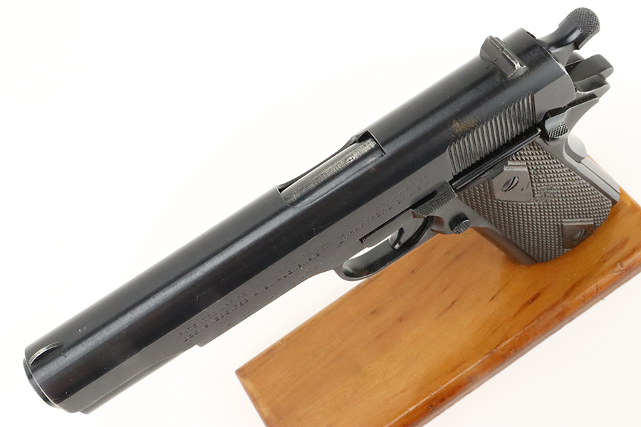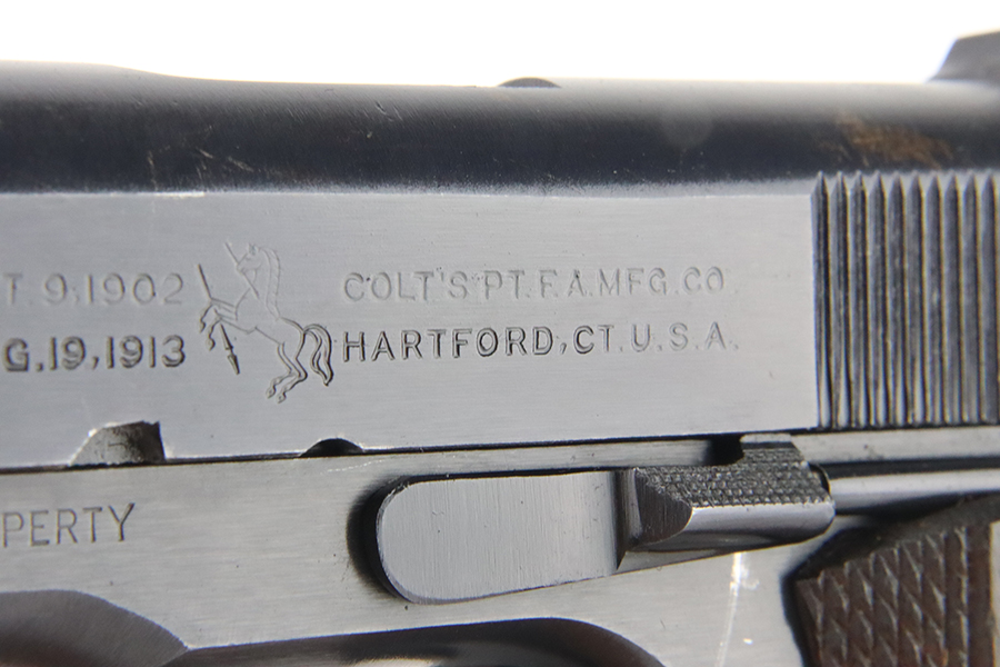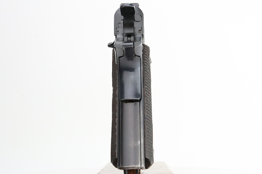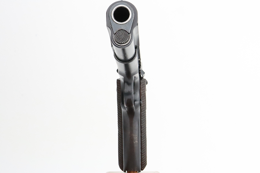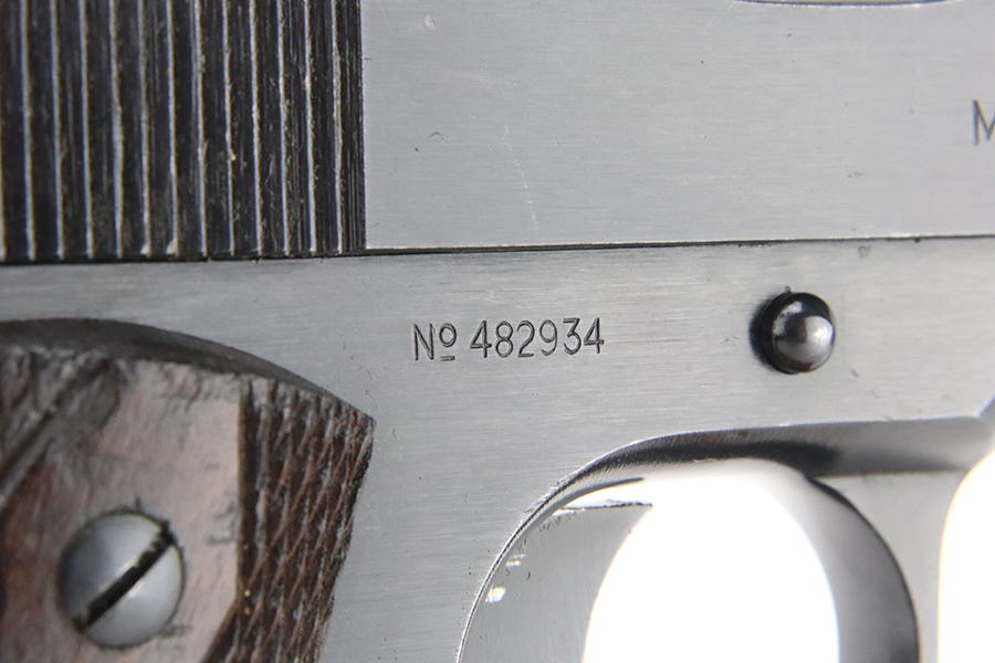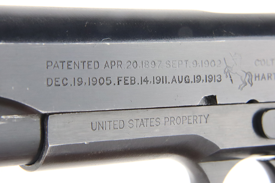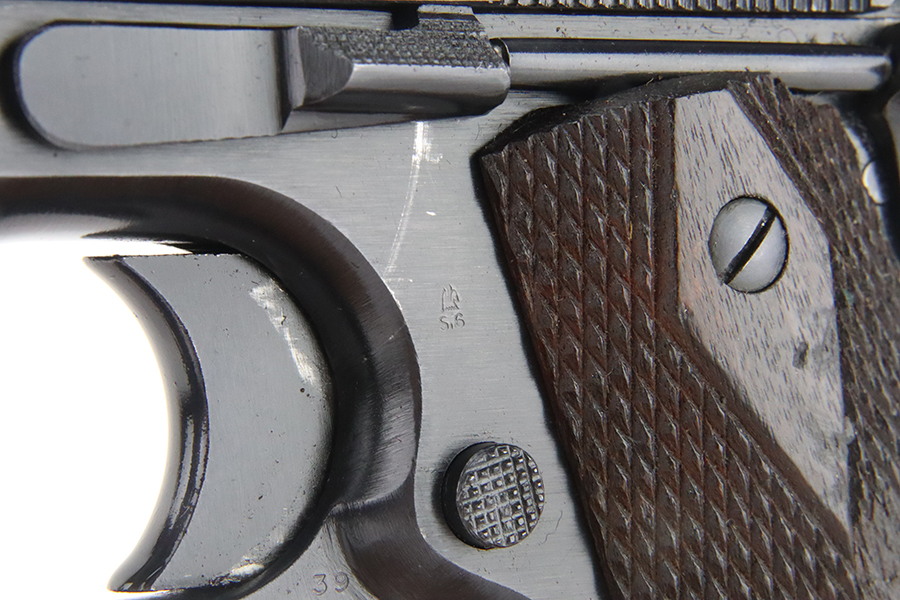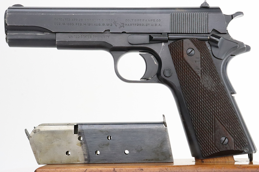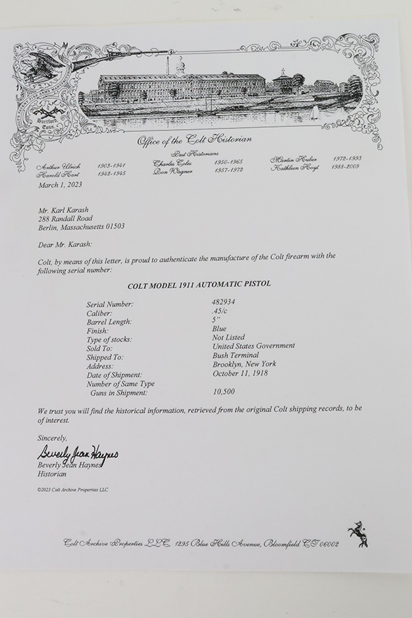 2/2/24 – This is a fantastic example of an original Black Army Colt 1911 from 1918. The original finish rates at 97-98% with very minor high edge wear, a light ‘idiot’ scratch, and tiny bit of wear on the mainspring housing and front strap. Proper Colt barrel with intertwined PH marking. Minty bore. Nice wood grips with generally sharp checkering. The listing includes a Colt archive letter stating this pistol was shipped to the Brooklyn terminal in October of 1918.