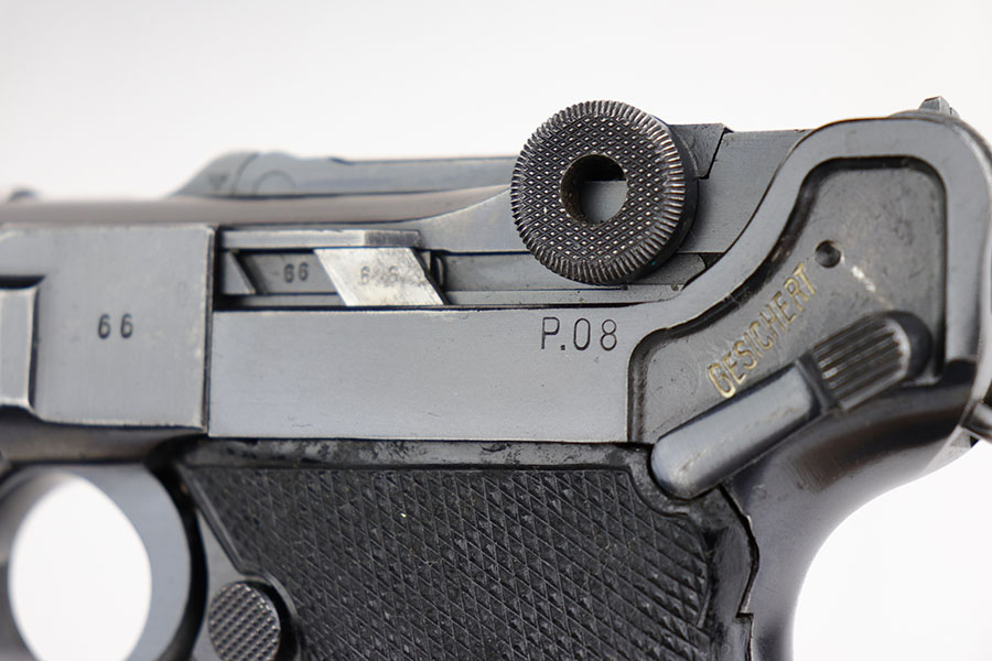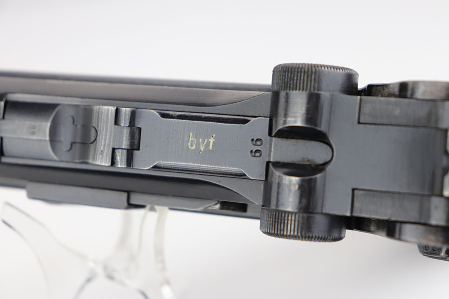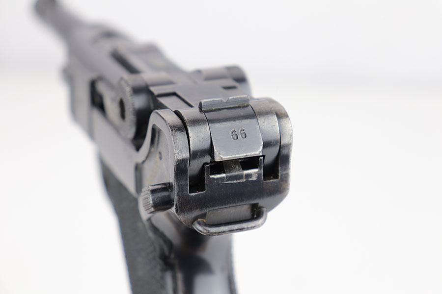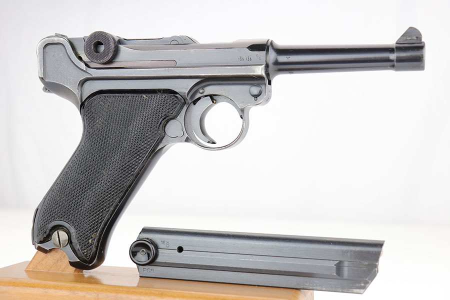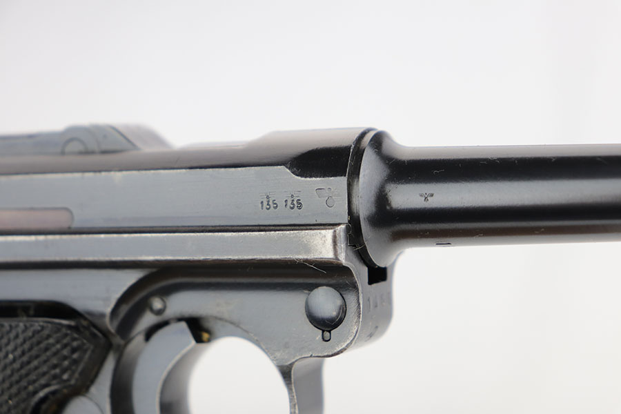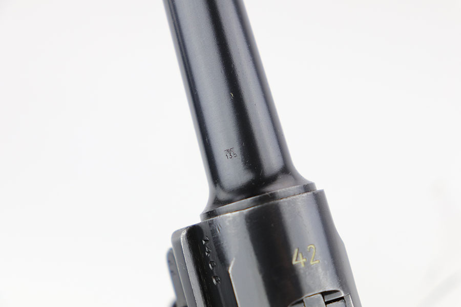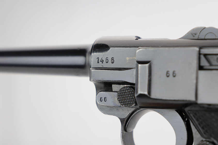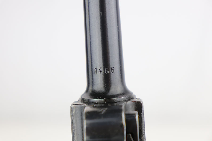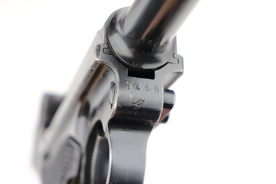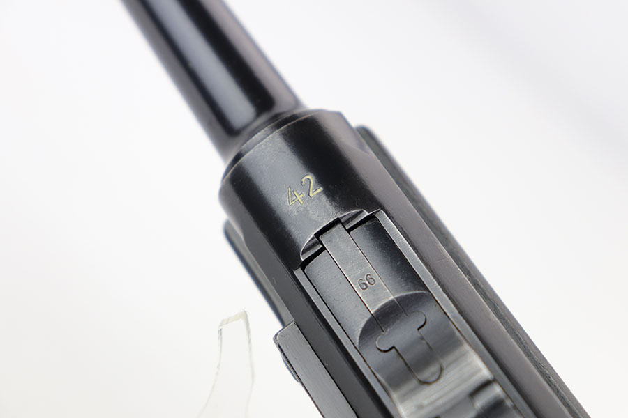 10/30/21 – This is a beautiful example of an all matching and original Black Widow Mauser Luger from 1942. All numbered parts match throughout, and the grips and magazine are original Black Widow examples. The pistol has about 96% of the original blue remaining, with minor wear in all the most common high edges such as the bottom of the front strap, side rails and rear of frame. Excellent, shiny bore. Some age and handling wear to the grips but no cracks. Magazine base has no damage at all.