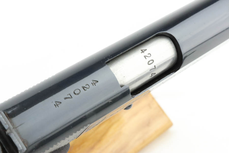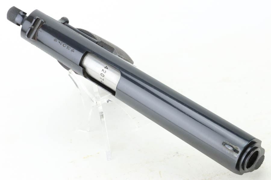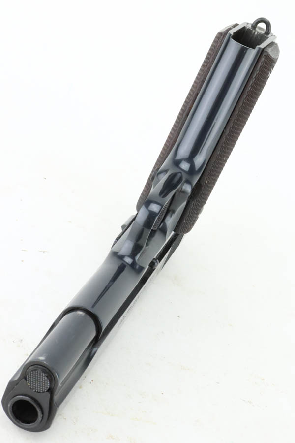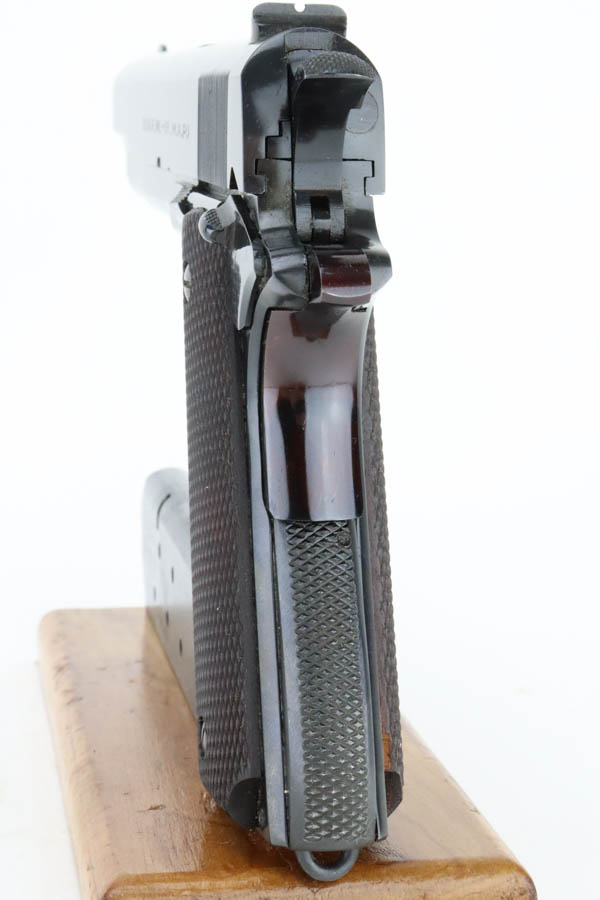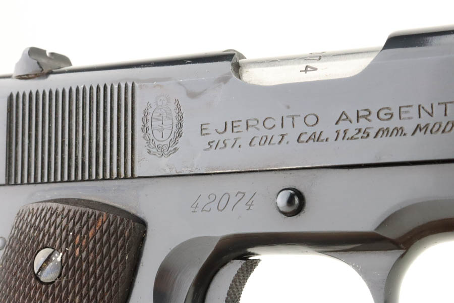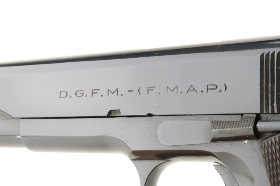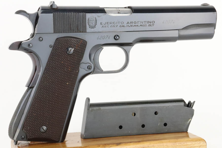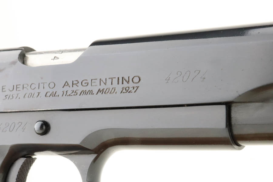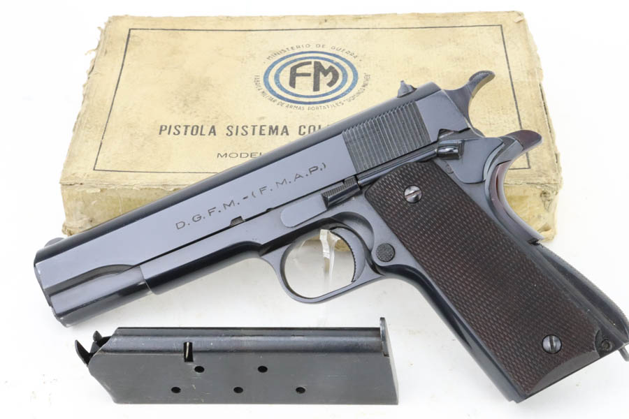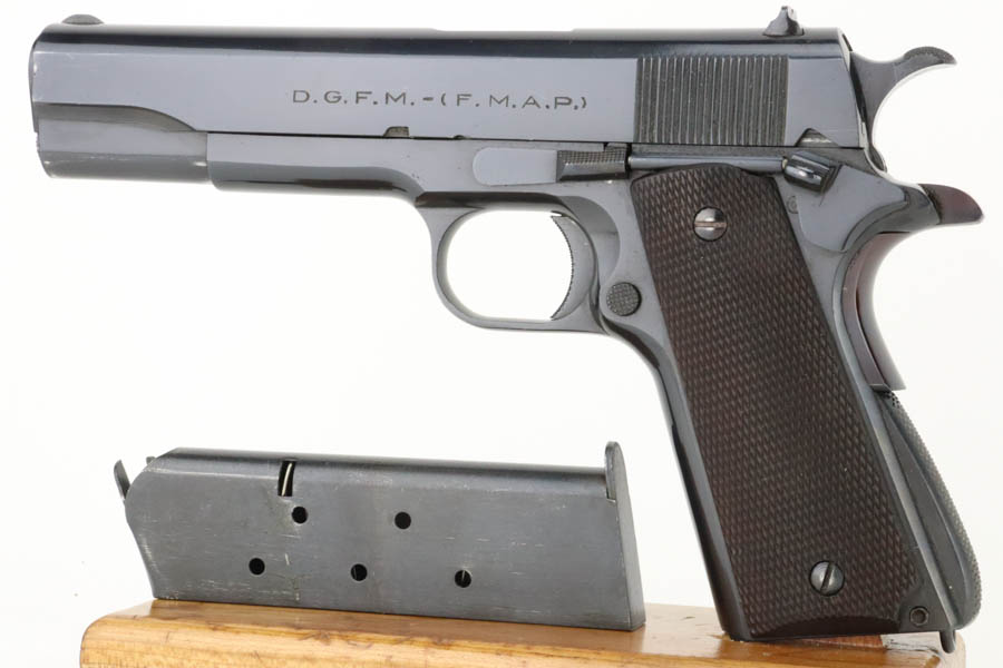 7/10/24 – This is a beautiful example of an Argentine DGFM Model 1927, a copy of the original Colt 1911. Manufactured after WW2. All matching with the proper Argentine Crest on the right side of the slide. The gun comes with a period-correct box that is numbered, not matching, but close in serial number to the gun (numbered 42570). The gun itself has retained nearly all of its high polish finish with just a hint of muzzle wear. Fitted with excellent checkered wood grips and comes with one magazine. Mint bore.