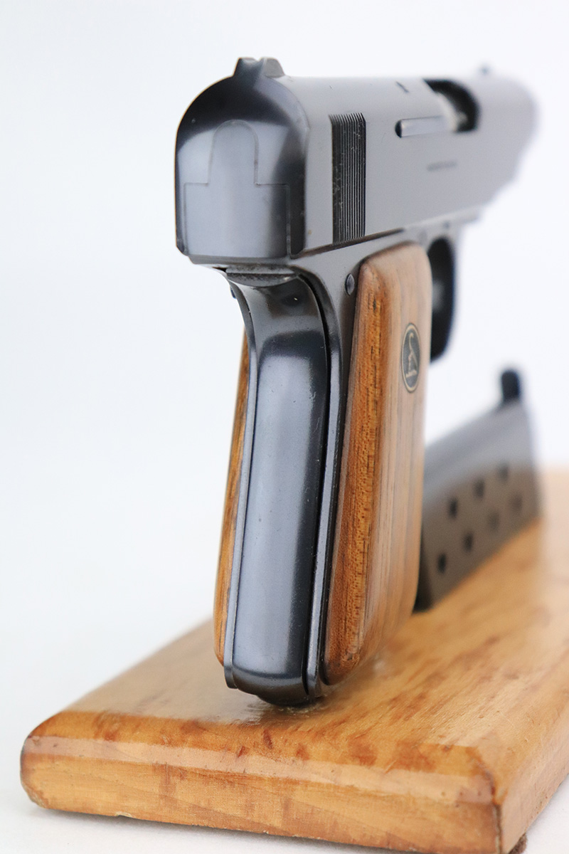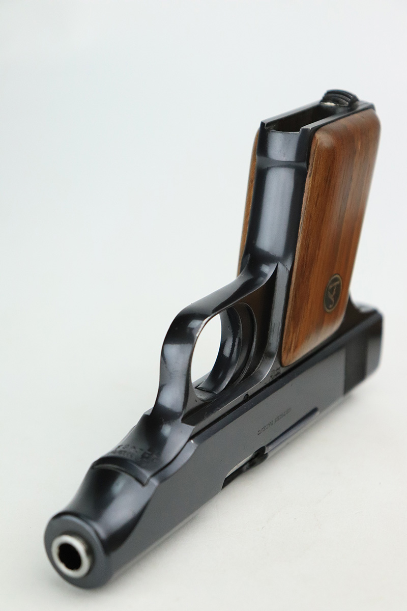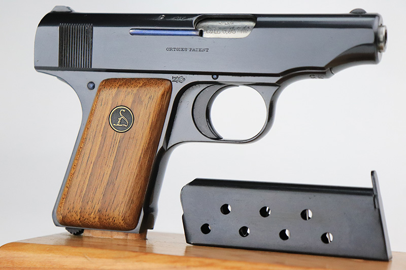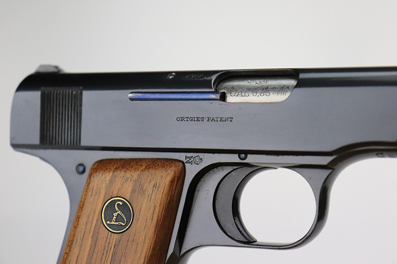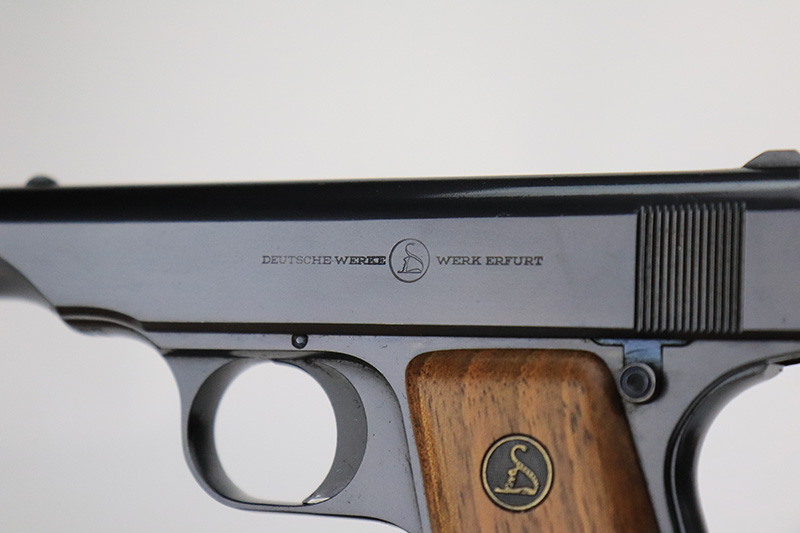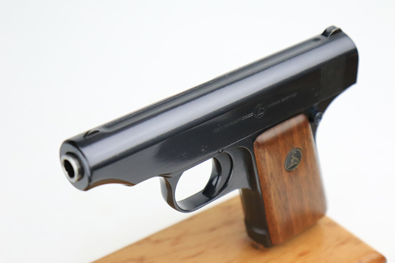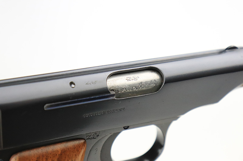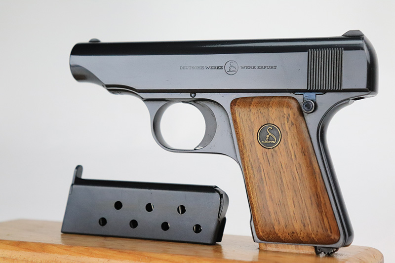 10/11/22 – This is an absolutely beautiful example of an Erfurt Ortgies Pocket Pistol, manufactured in the 1920’s and chambered in .25 ACP. All matching with “Germany” export mark. It comes with an original cardboard box (not numbered), owners manual, cleaning rod, and one blued magazine. The side panels of the box are starting to tear away and were repaired with scotch tape in some areas. The gun itself is in like-new condition with essentially no signs of wear. Excellent fire blue on the small parts. Comes with gorgeous period-correct wood grips. The bore is like-new.