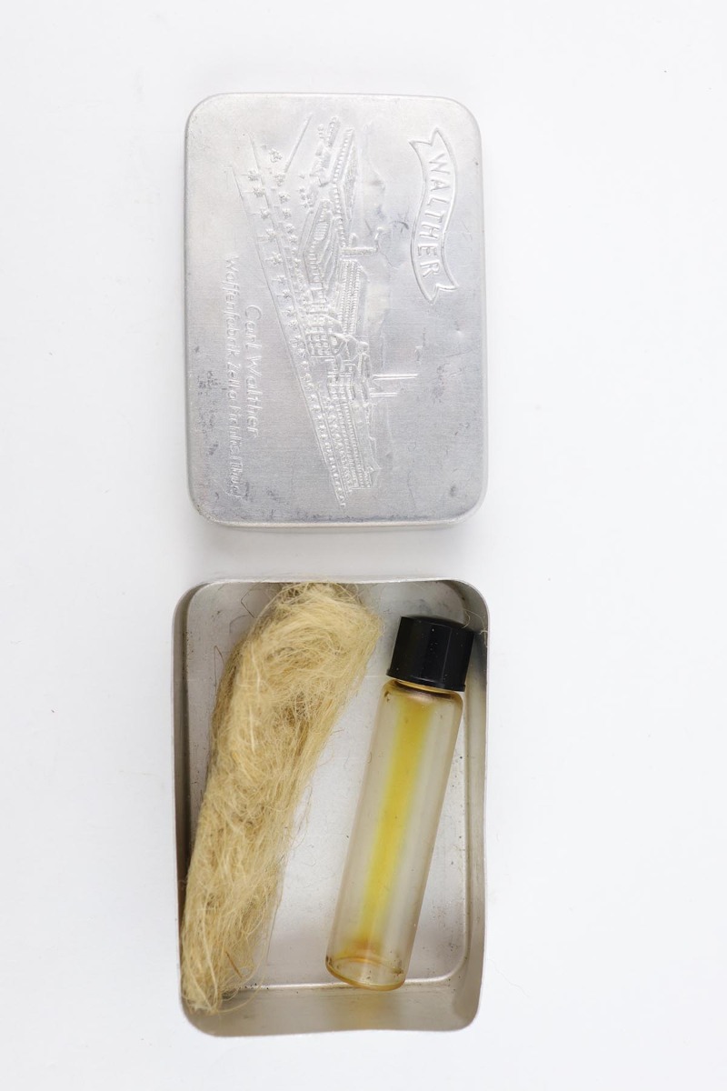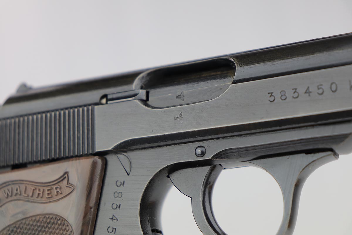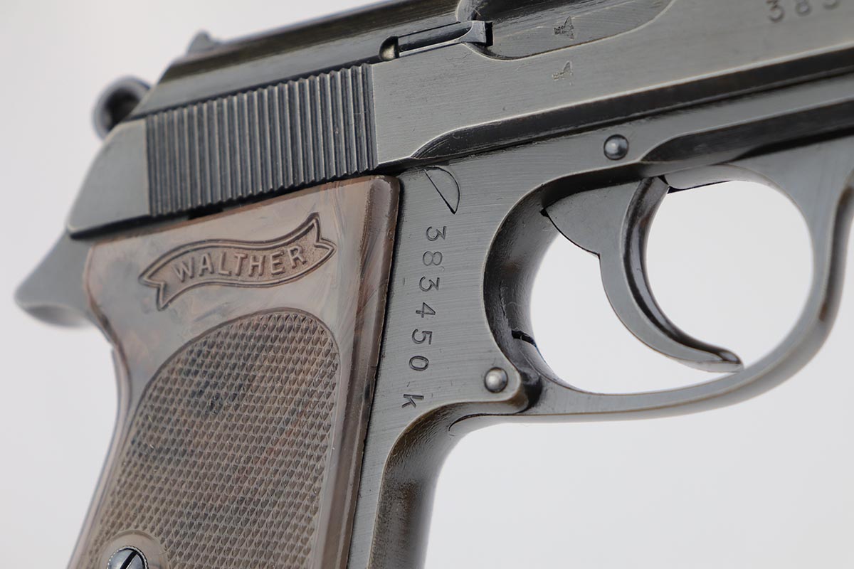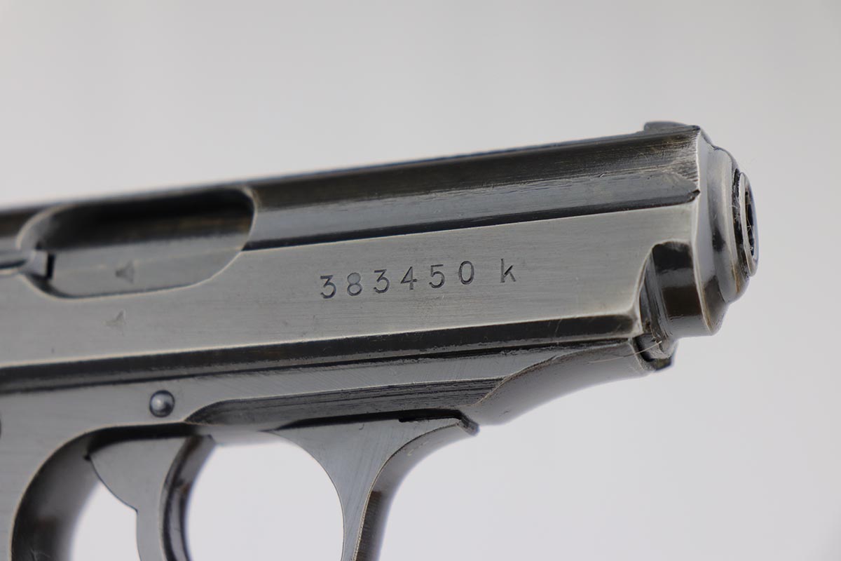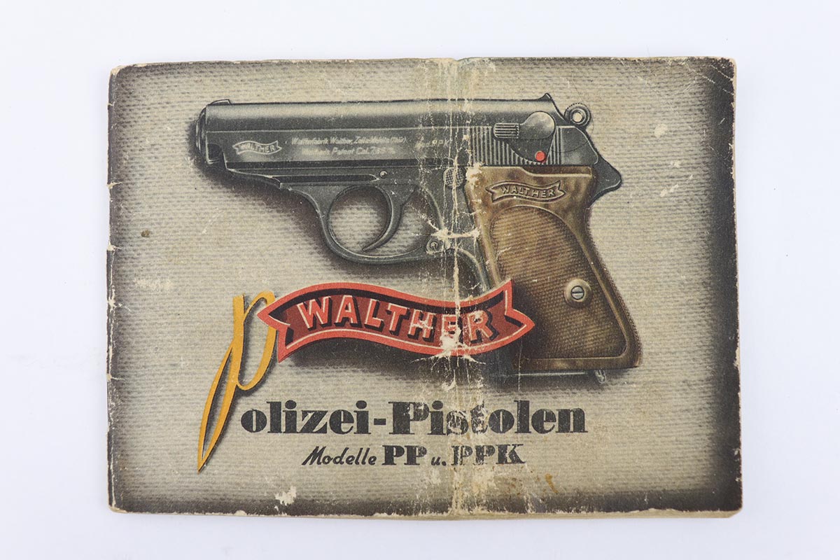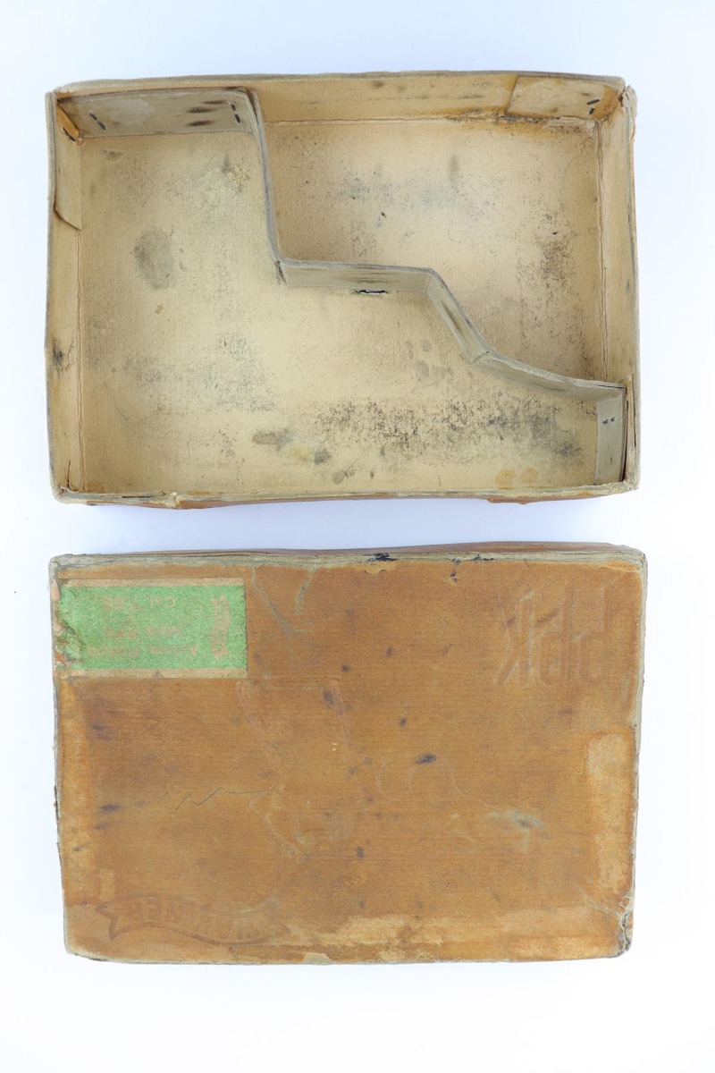 7/30/19 – This is a beautiful and rare find of a Police issued Walther PPK in its original, matching box. The gun is all matching and original with about 98% military blue remaining, showing only minor edge wear. There is some browning to the finish throughout, as well. The original box is fairly worn/aged but it does have the serial of the pistol on the top portion. The pistol has an excellent gray grip and comes with original manual, cleaning rod, spare magazine and Walther tin. The bore is mint, and magazines are in excellent condition. Manual is dated to February of 1940.
