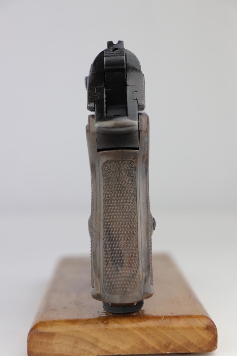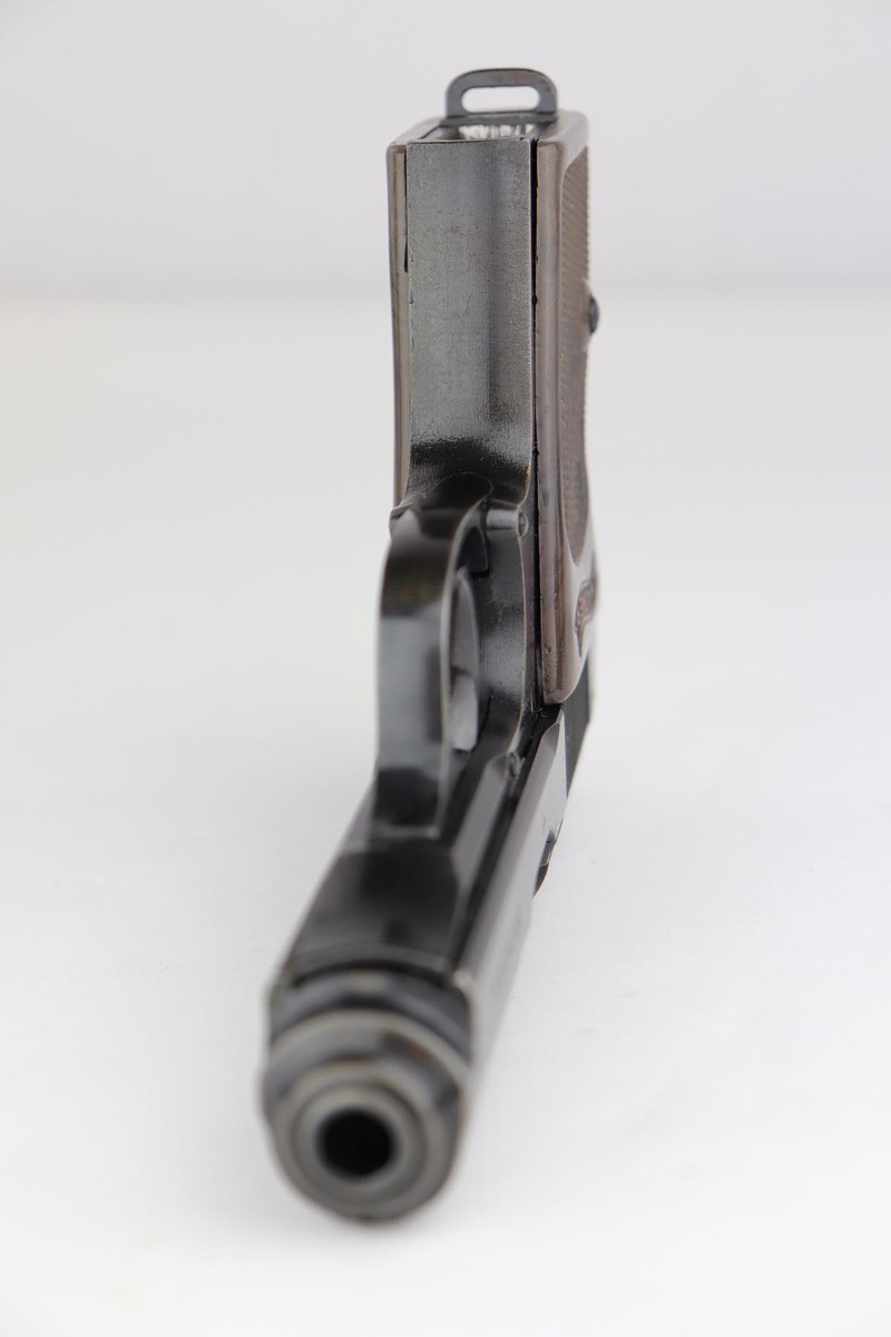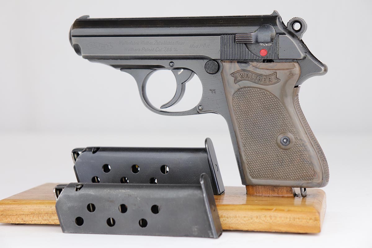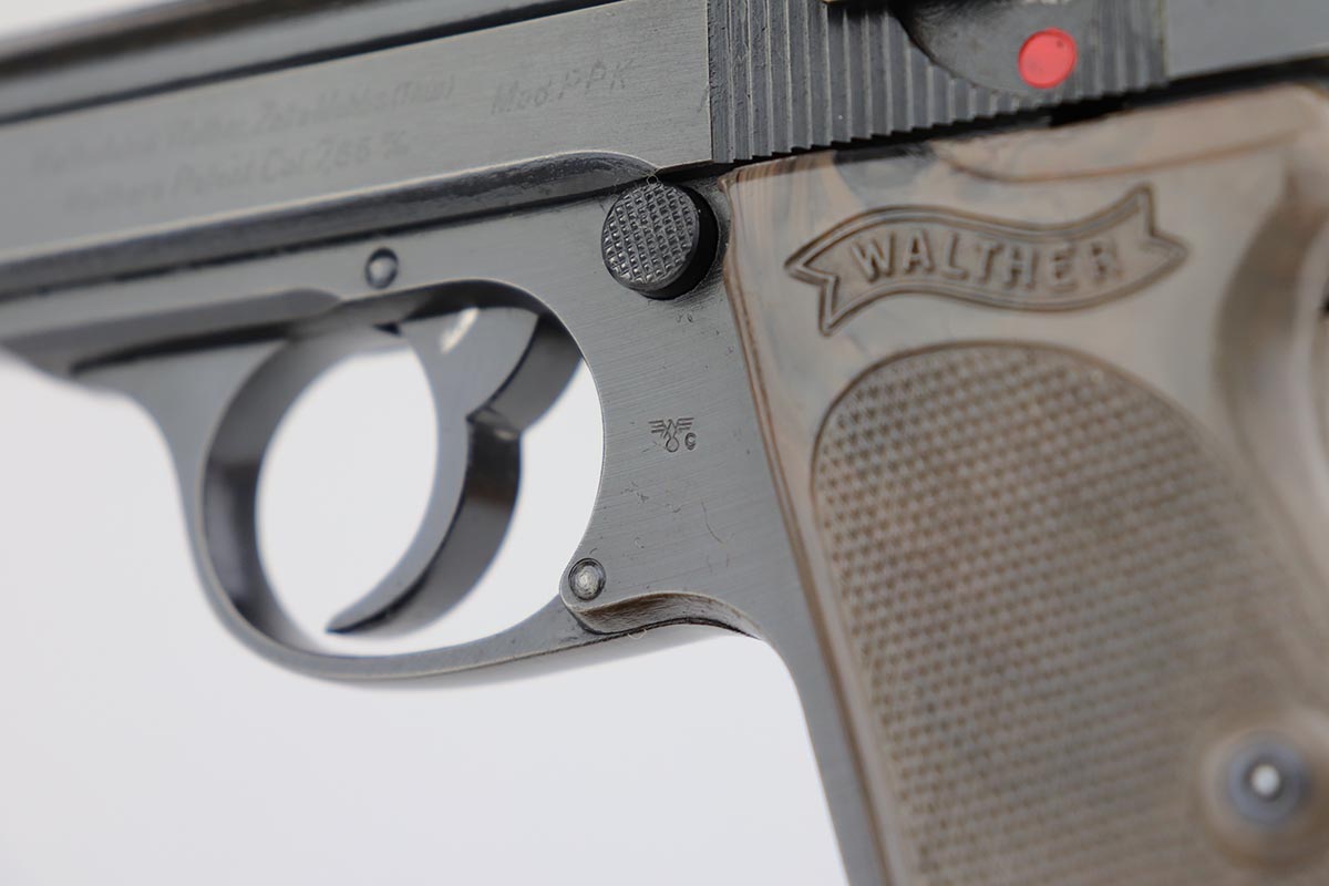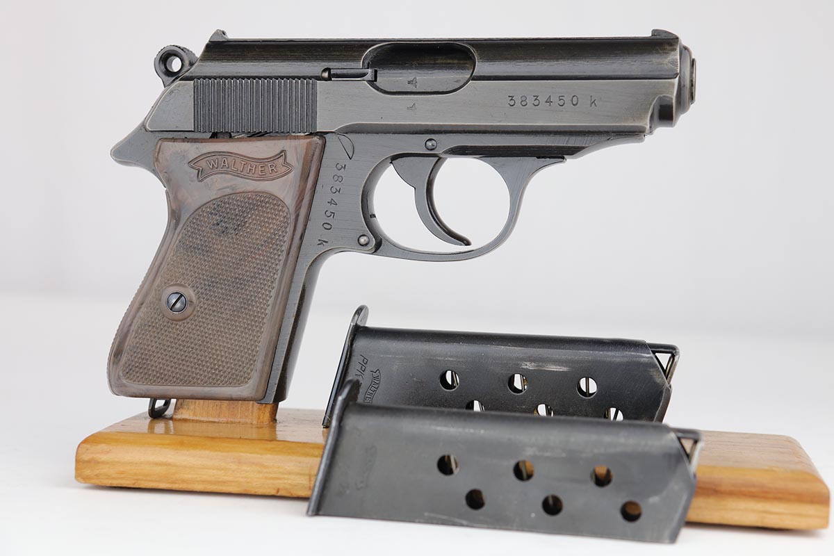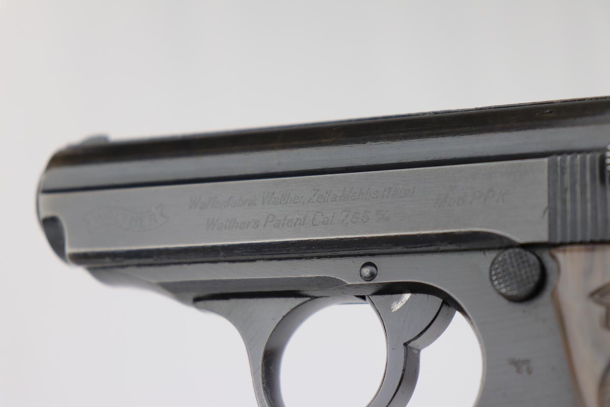 7/30/19 – This is a beautiful and rare find of a Police issued Walther PPK in its original, matching box. The gun is all matching and original with about 98% military blue remaining, showing only minor edge wear. There is some browning to the finish throughout, as well. The original box is fairly worn/aged but it does have the serial of the pistol on the top portion. The pistol has an excellent gray grip and comes with original manual, cleaning rod, spare magazine and Walther tin. The bore is mint, and magazines are in excellent condition. Manual is dated to February of 1940.