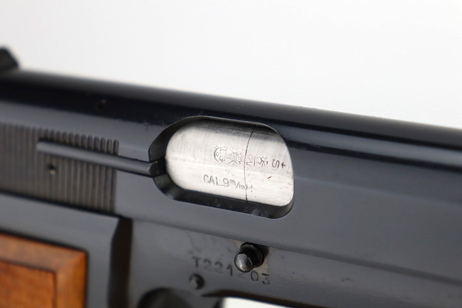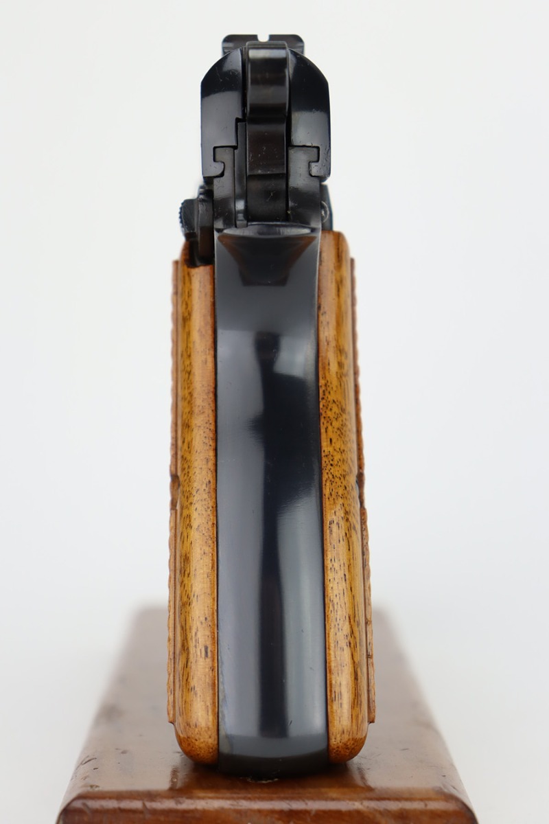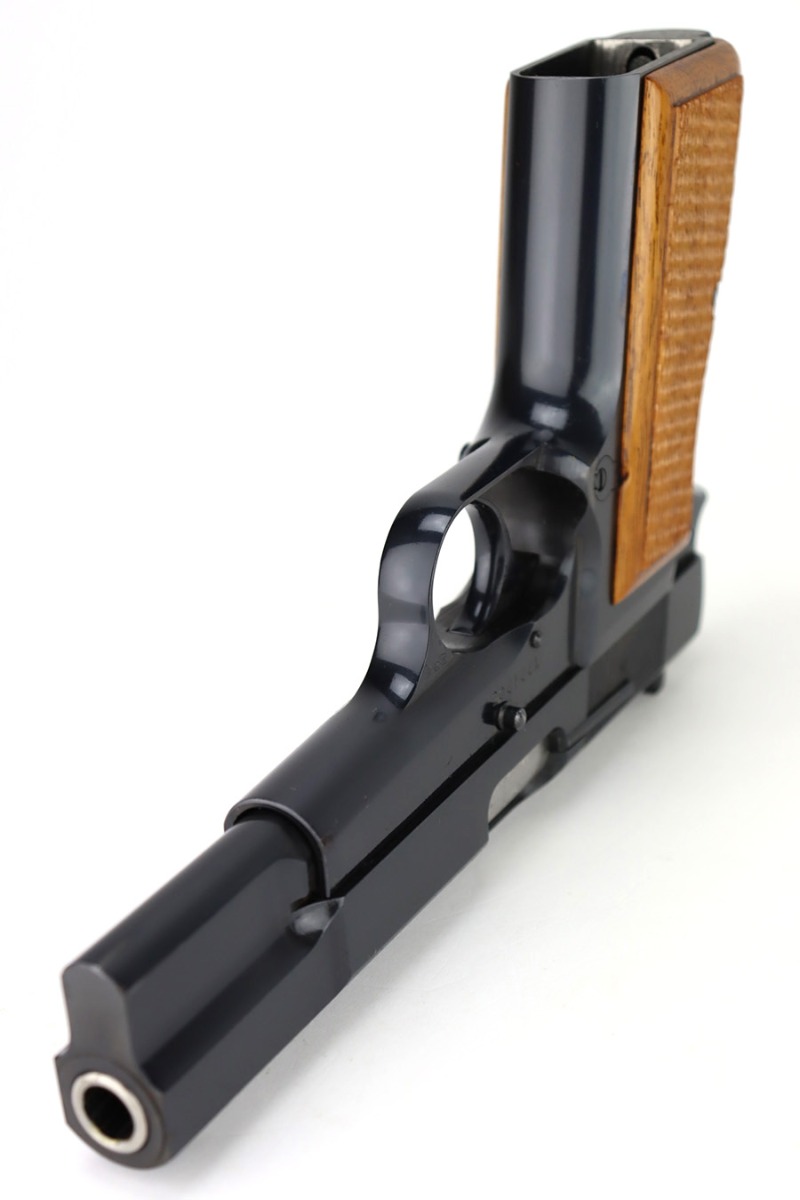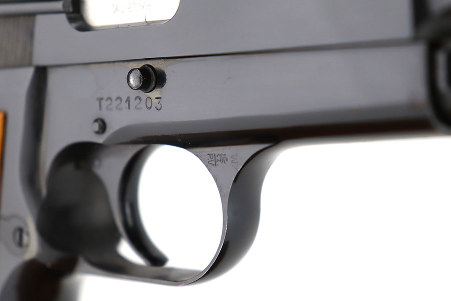 12/13/23 – This is a beautiful example of a desirable Browning High Power with T-Series serial from 1968. The “T Series” guns are regarded by collectors as being the last run of FN’s high polish guns with very quality fit and finish from the factory. It is all matching and shows almost no signs of wear or use except for one tiny area of pin-pricking around the muzzle. Mint wood grips. Comes with one proper magazine. Mint bore.